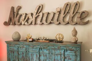 His taste is eclectic, and art is important. And for Parish, it is almost as much about the hunt as it is the find. He has some painted cabinets from an antique store in Bowling Green, and an old school safe painted blue from a nearby antique store. He loves the Nashville Flea Market and has lots of art amassed from touring, including one piece he got right off the walls of The House of Blues in Orlando. It wasn’t for sale, but since Cage the Elephant had sold out the venue they made an exception.