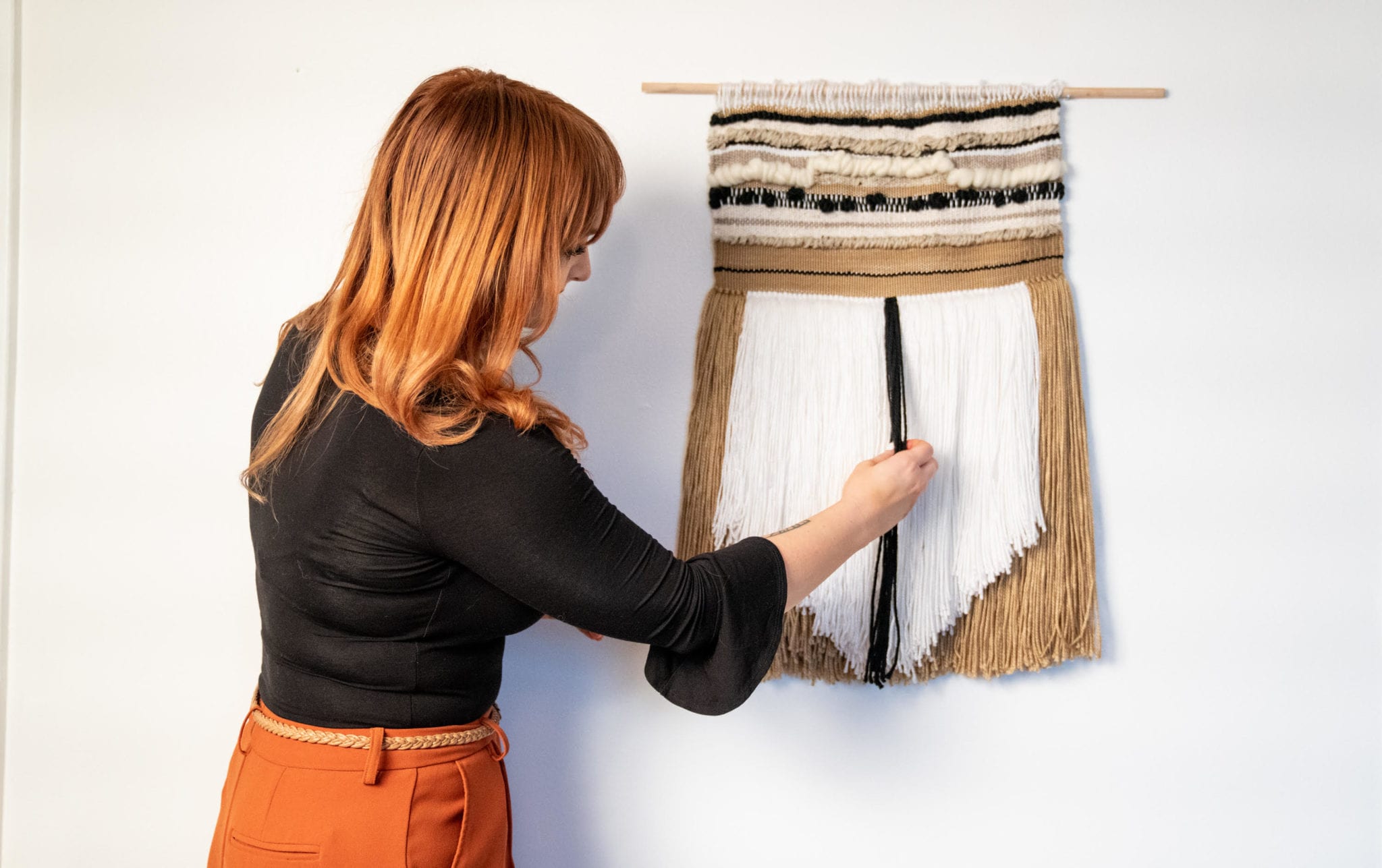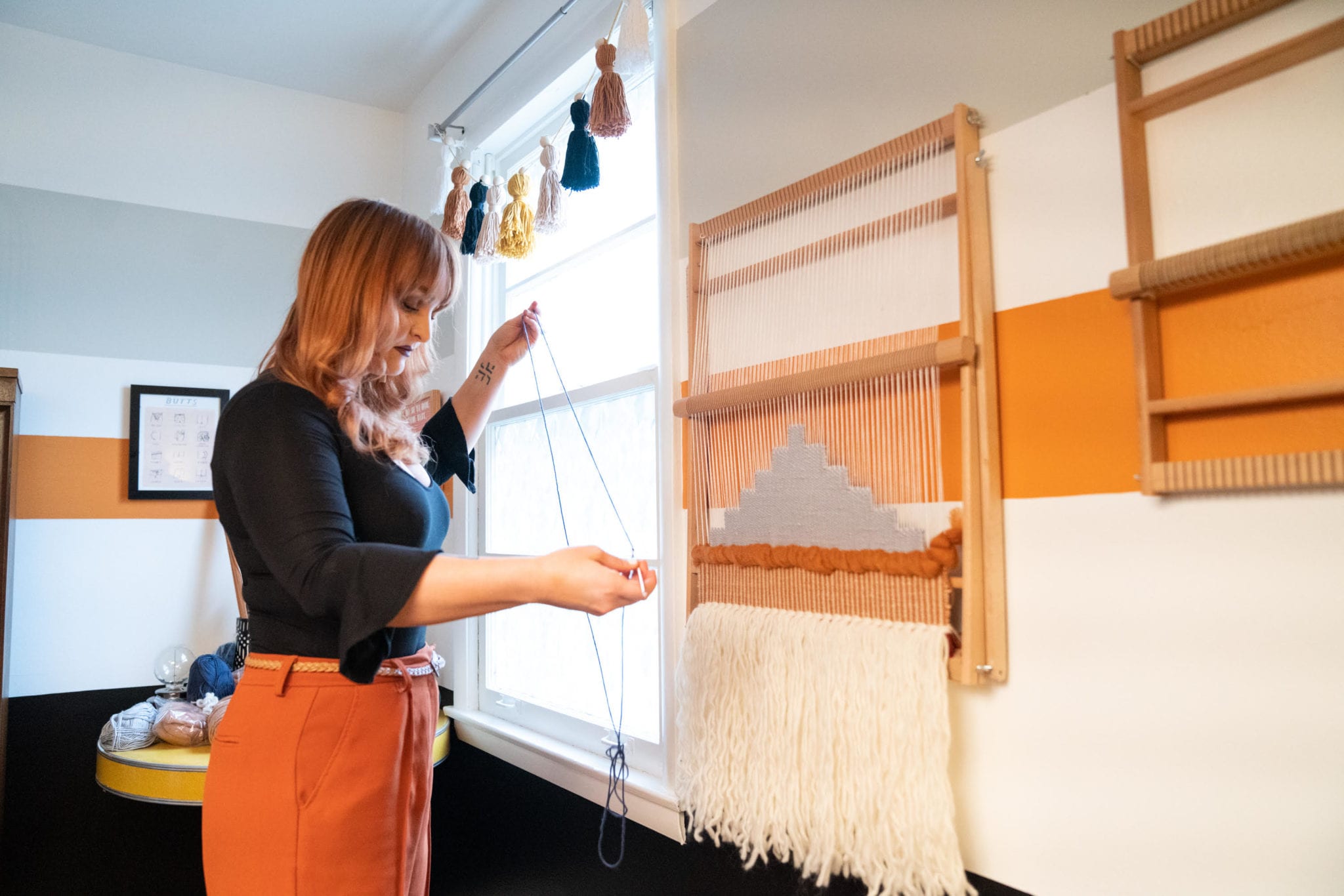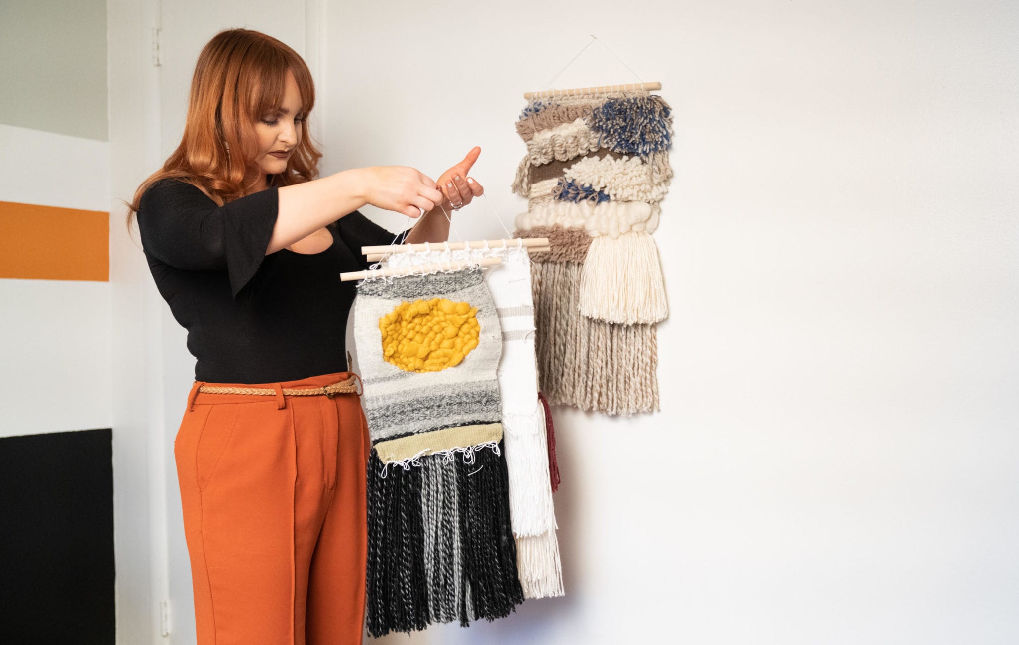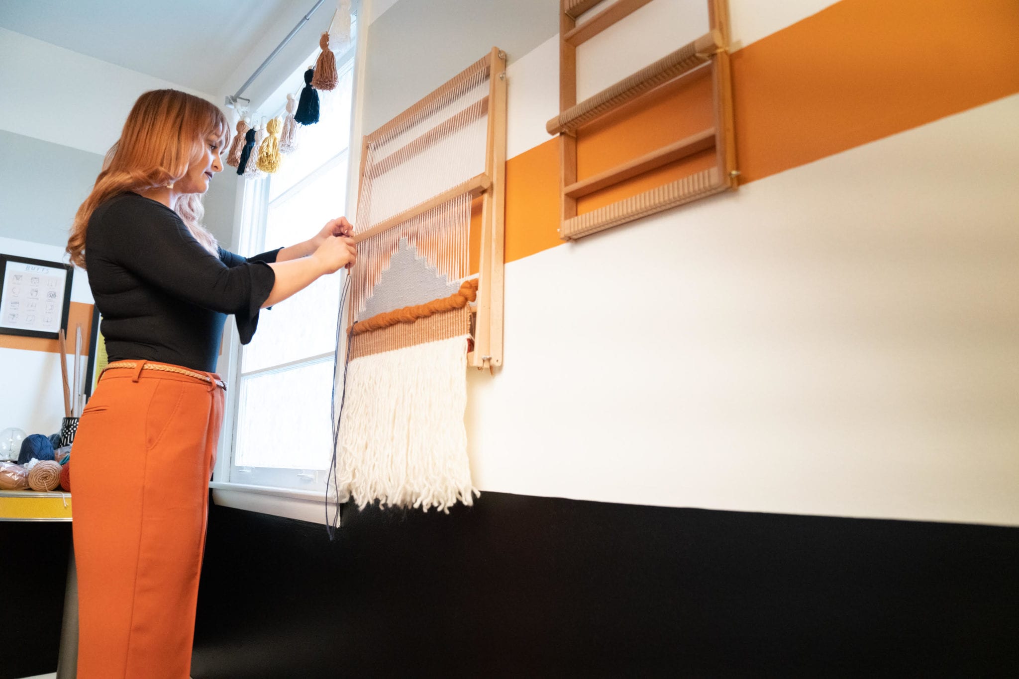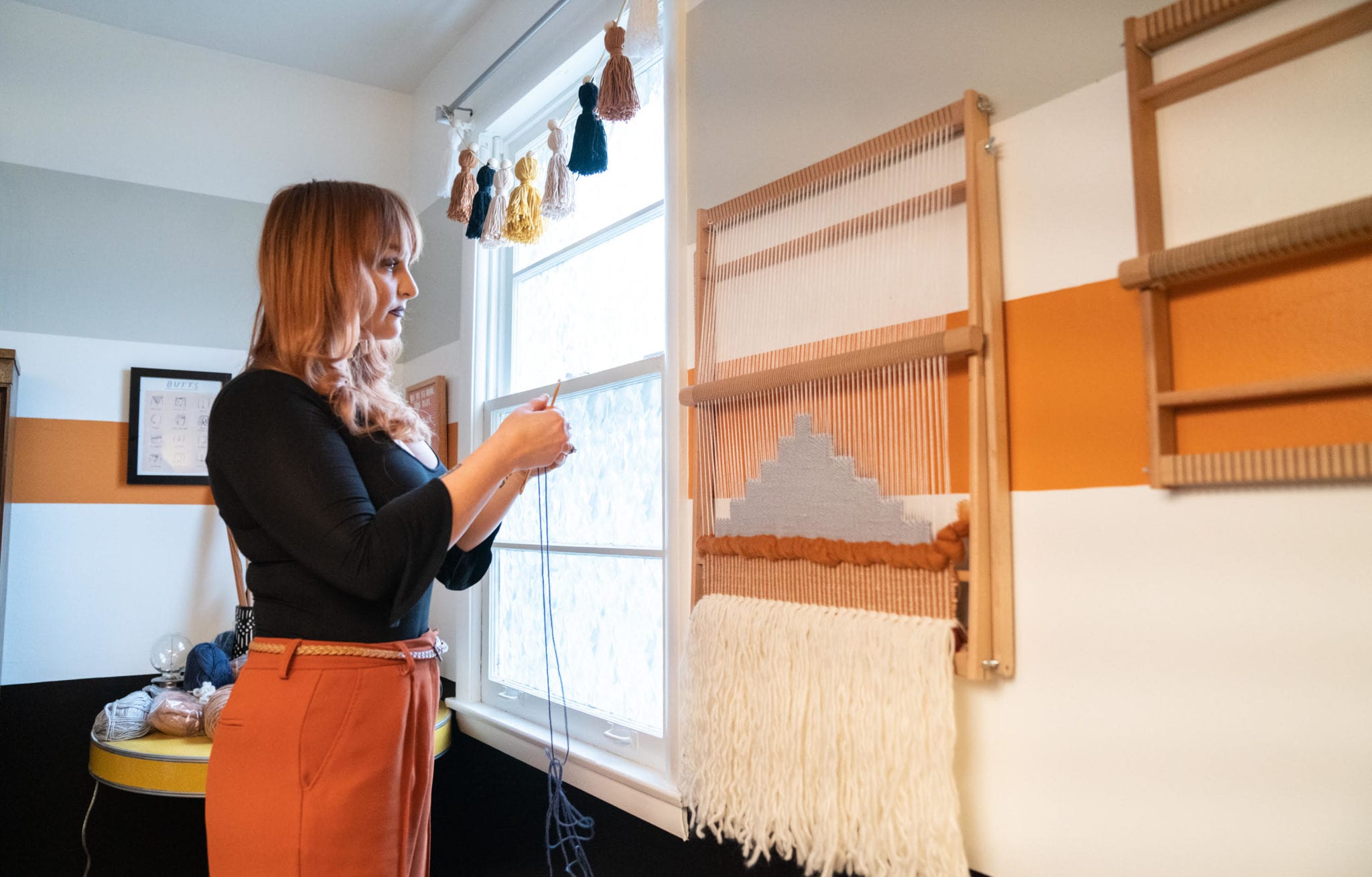 Roberts’ philosophy on interior décor directly translates to her artwork—one of a kind, thoughtful, and unexpected. A self-taught artist, Roberts first began weaving with a loom she created using a wooden stretcher for pulled canvas, and numerous tiny nails. Her work started small, and it has grown significantly along with her developing artistic technique—and her investment in larger looms.