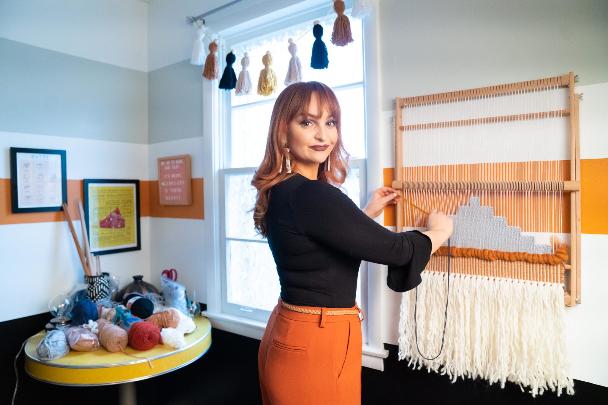 Original wall hangings, pillows, and even chandeliers populate the space of her Donelson studio—each square foot an indication of the fiber artist’s seemingly effortless flair and good taste. A retro gold sofa and a modern cabinet showcasing a bounty of multicolor yarn are second-hand finds that contribute to an already-lively room. “I like to be unique and to share my love of all things eclectic, because all these styles have a purpose in their space and a story to tell.”