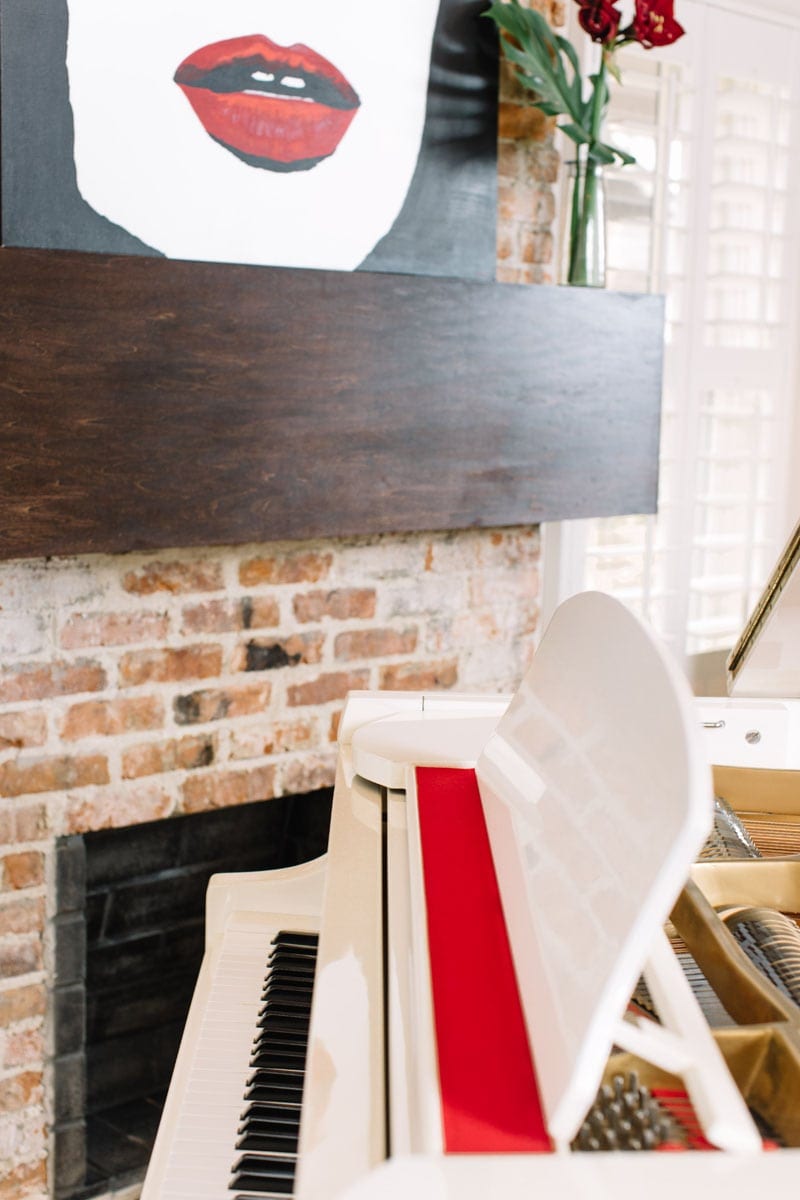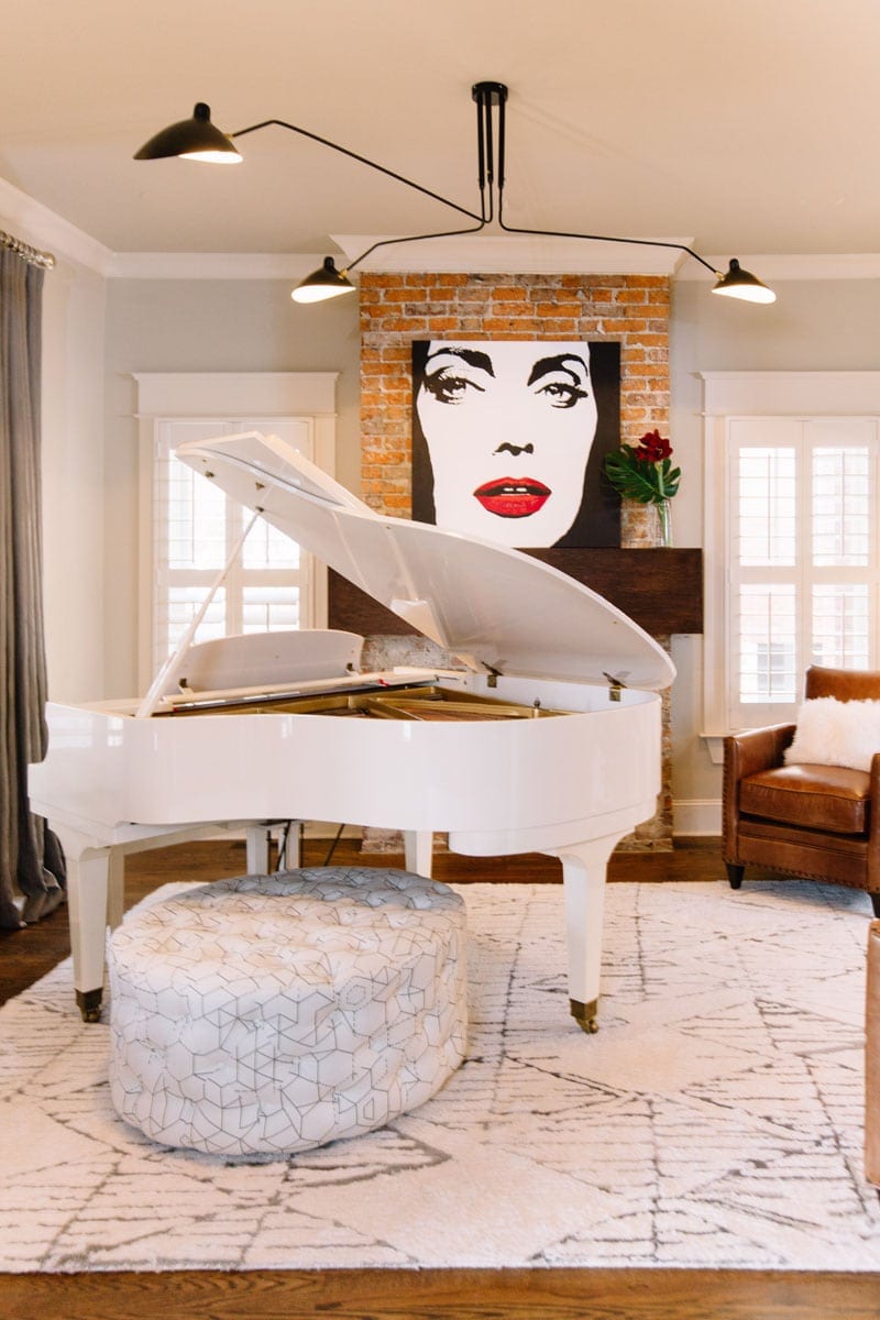 The white piano with red interior in the center of the room is a true showpiece — it was one of those Craigslist scores that keeps people willing to meet strangers in strange places. And while the client was a bit apprehensive about such a bold piece, Davis assured him it was a must-have.