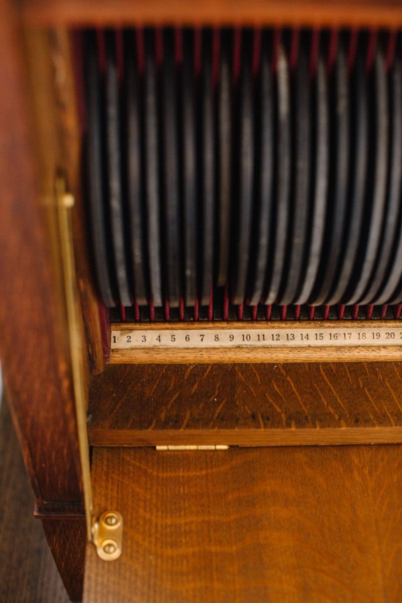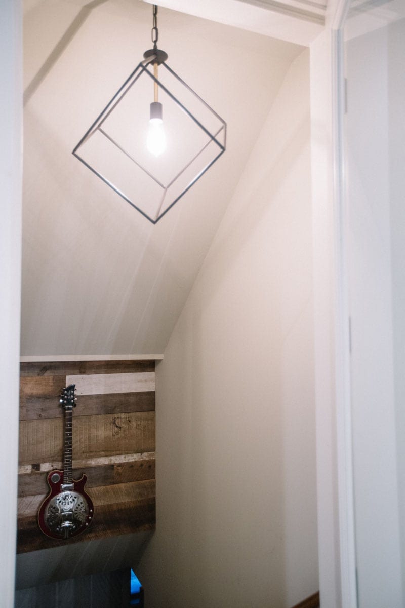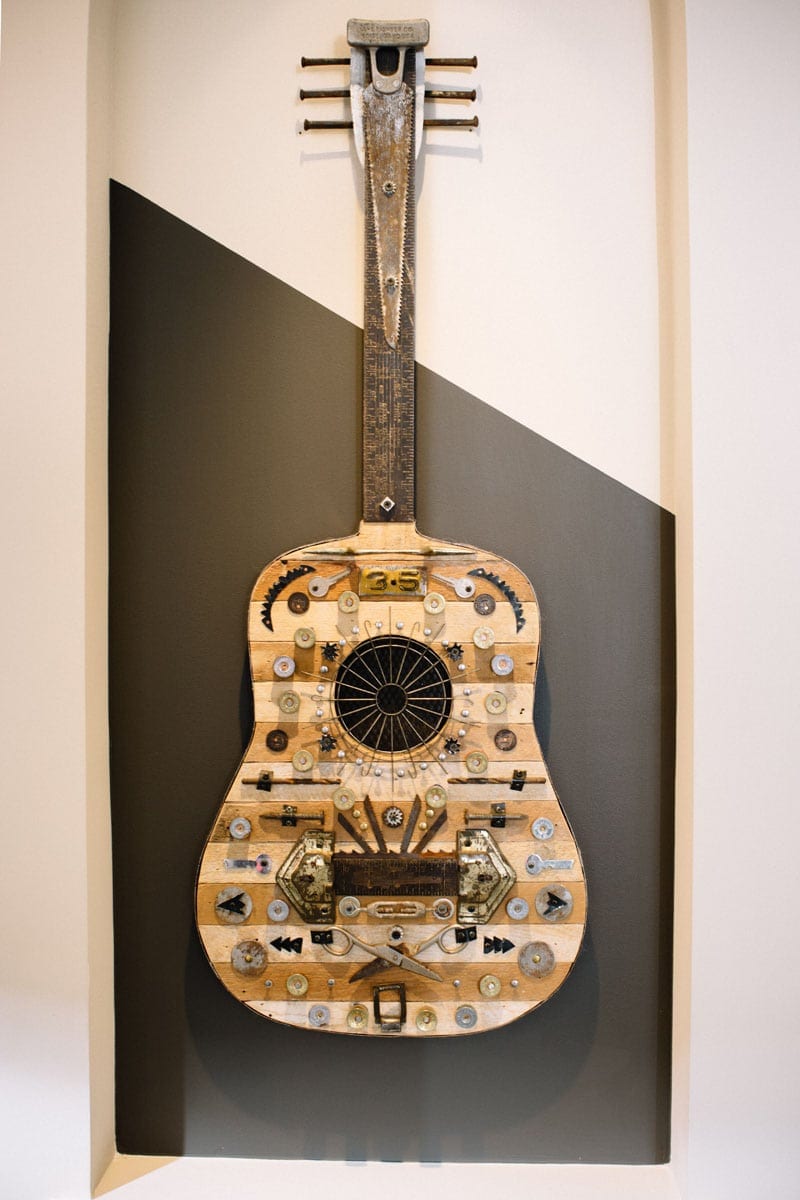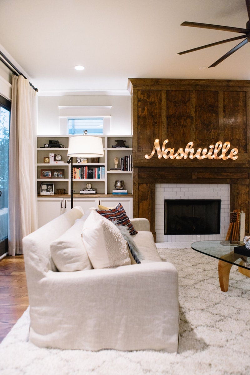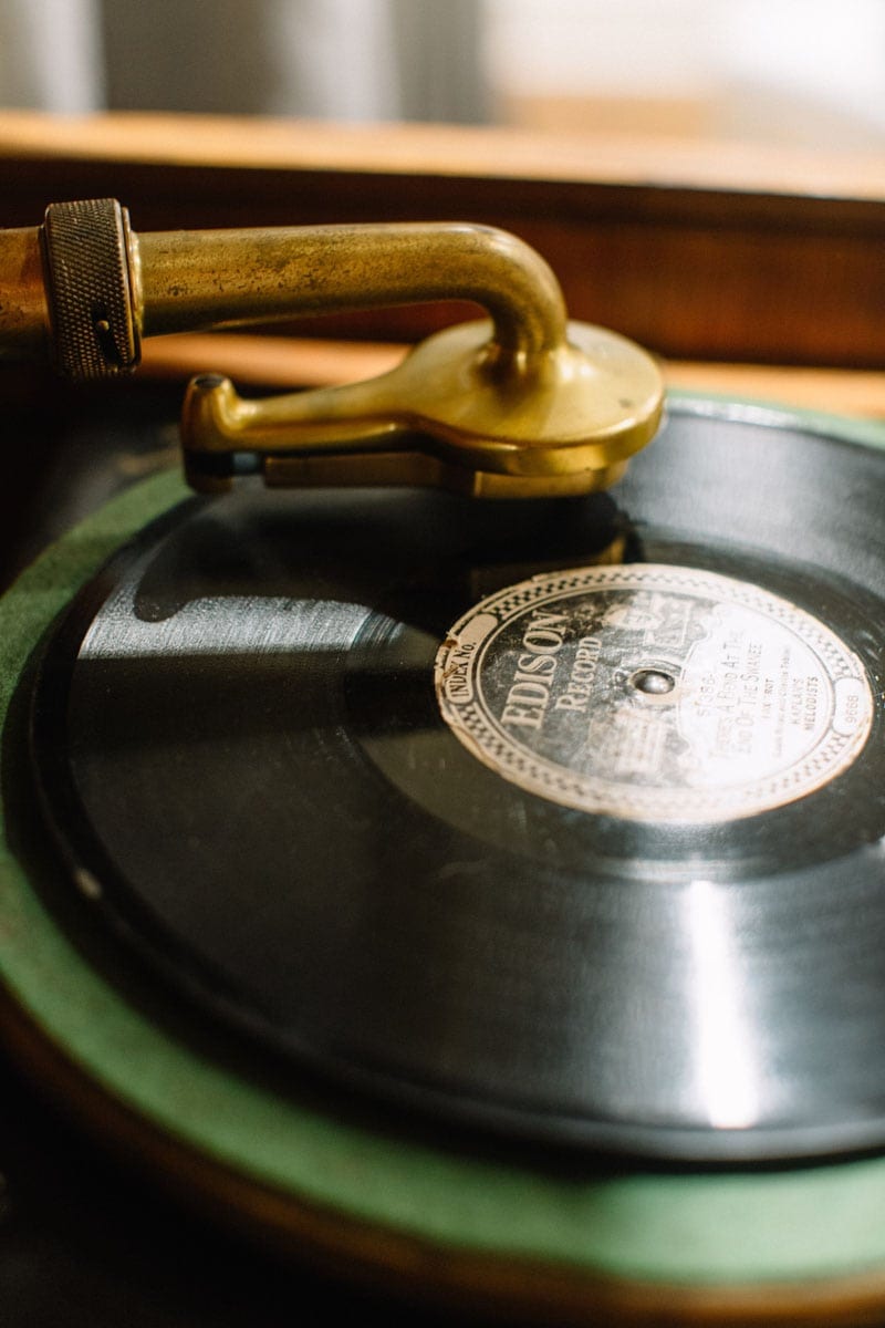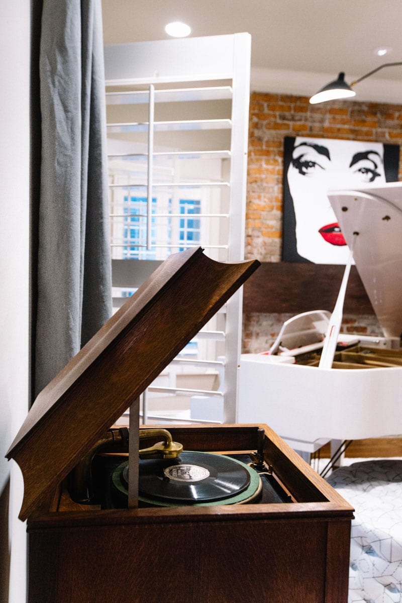 They went to the flea market and scooped up a vintage Victrola, complete with a stack of records, and then Davis had a large-scale pop art piece placed on the mantel, commissioned from artist Jessica Phillips.