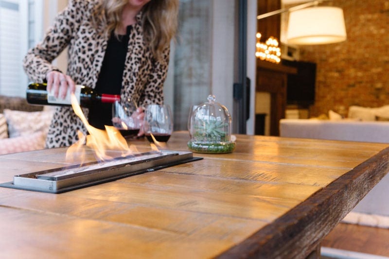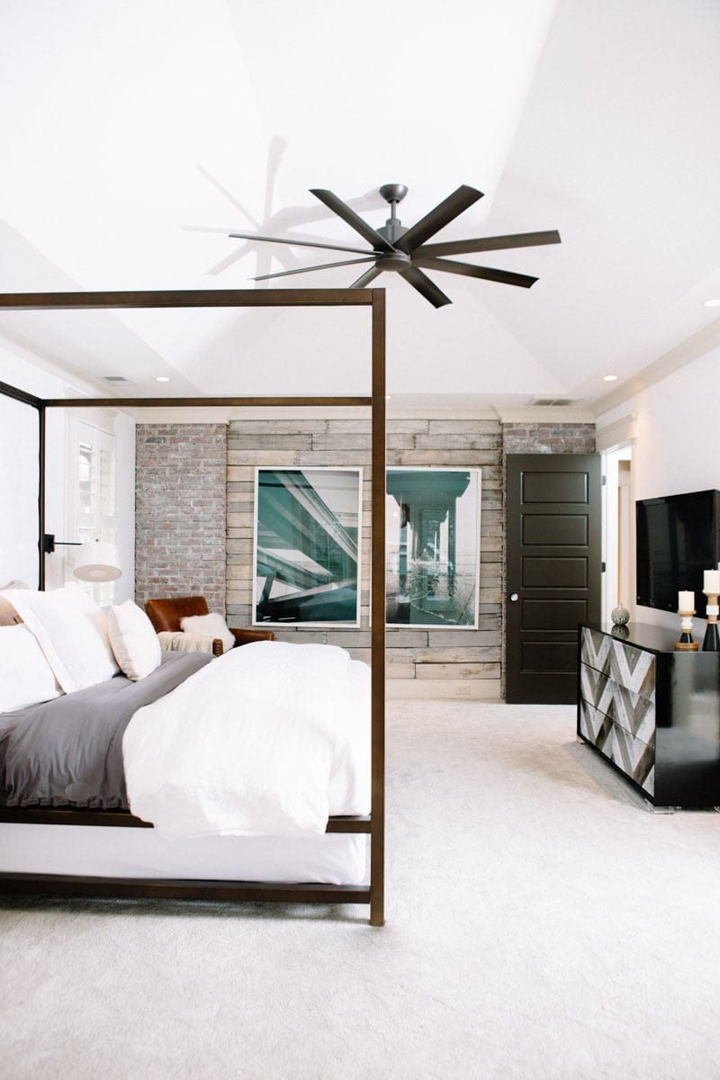 “Again, I wanted to play up the scale,” Davis says. “I said, ‘We have this historic brick, which I love, but we need to break it up a little bit with some of these contemporary modern elements.’ So I really wanted a mantel that wrapped the entire fireplace chimney and around the side.”