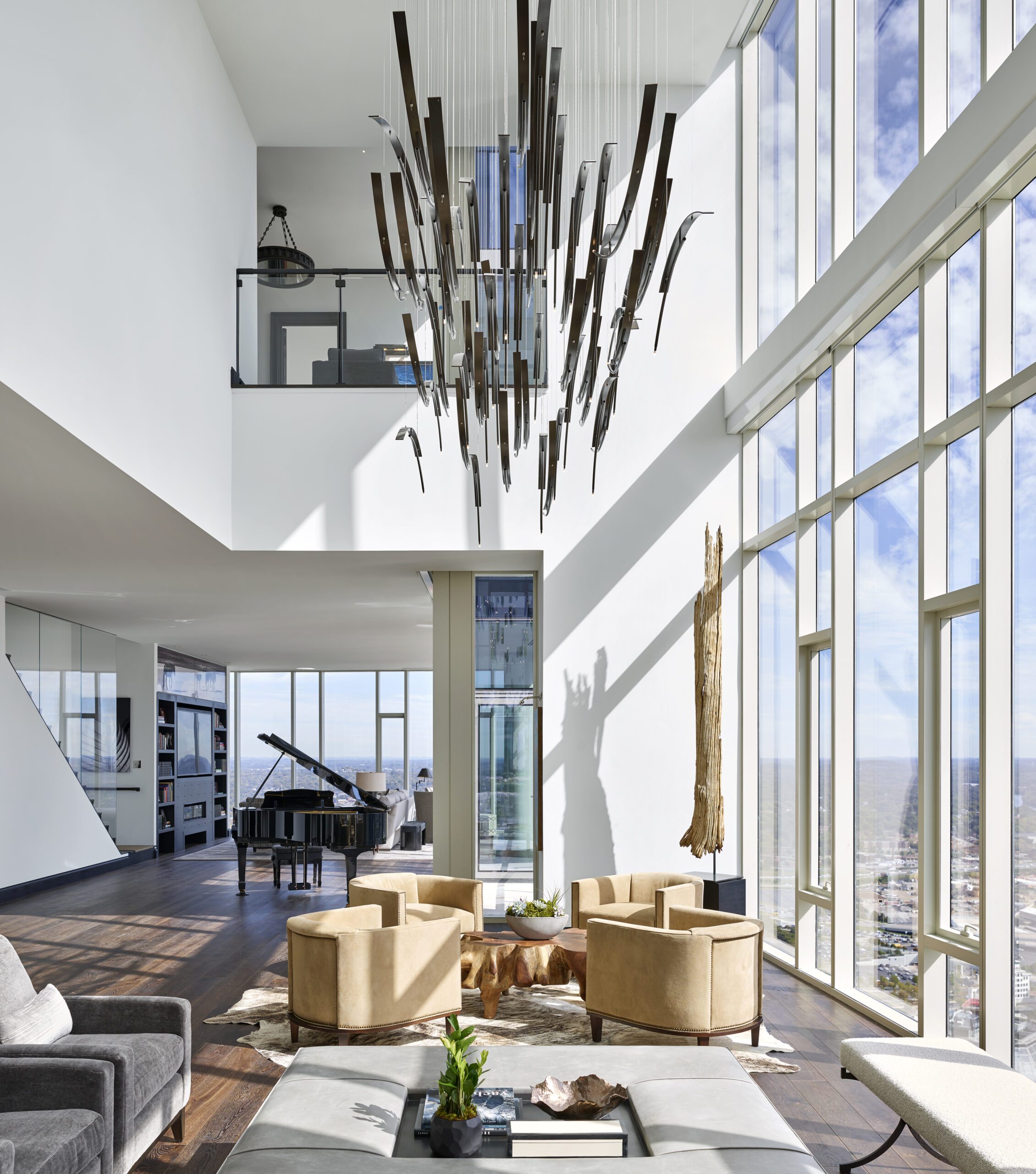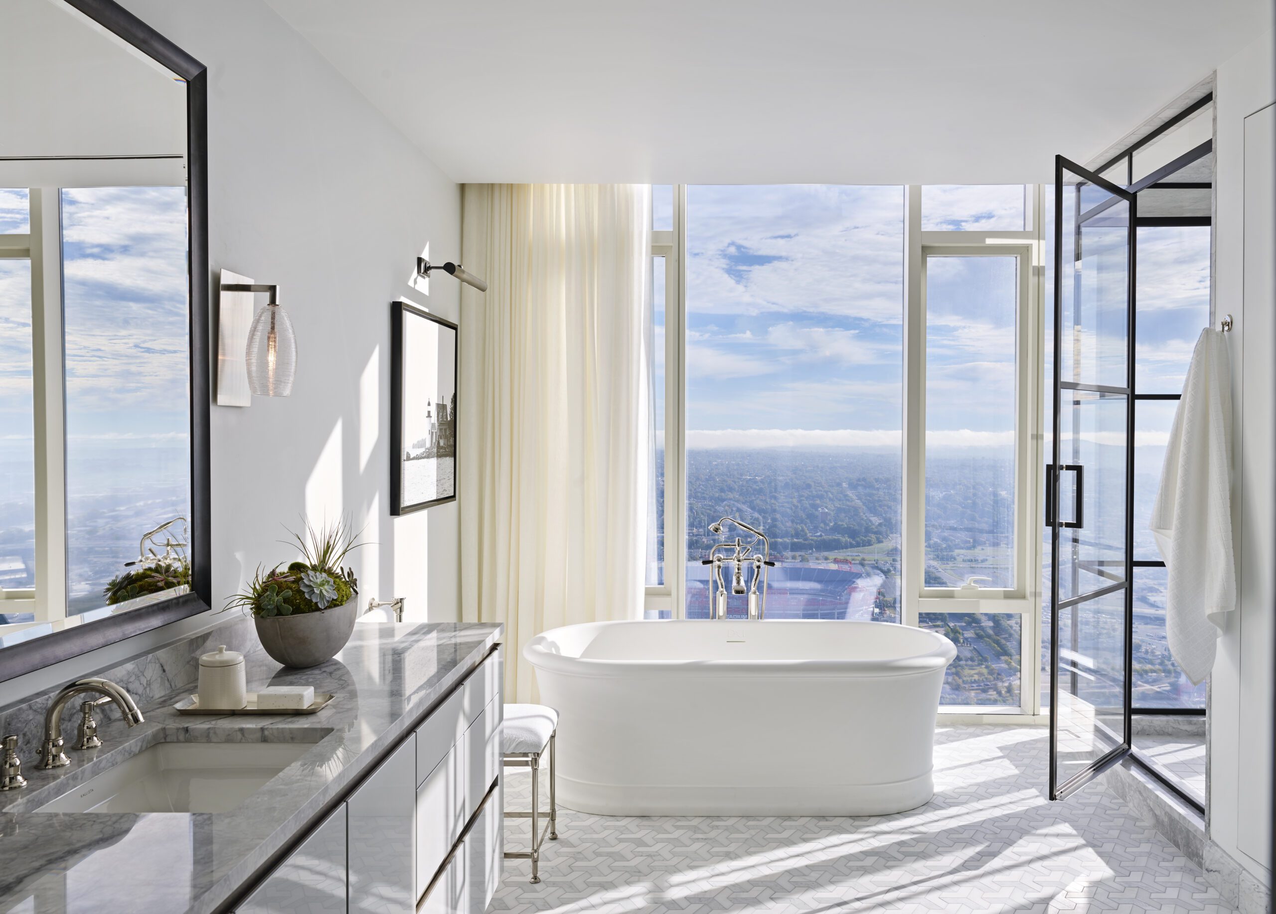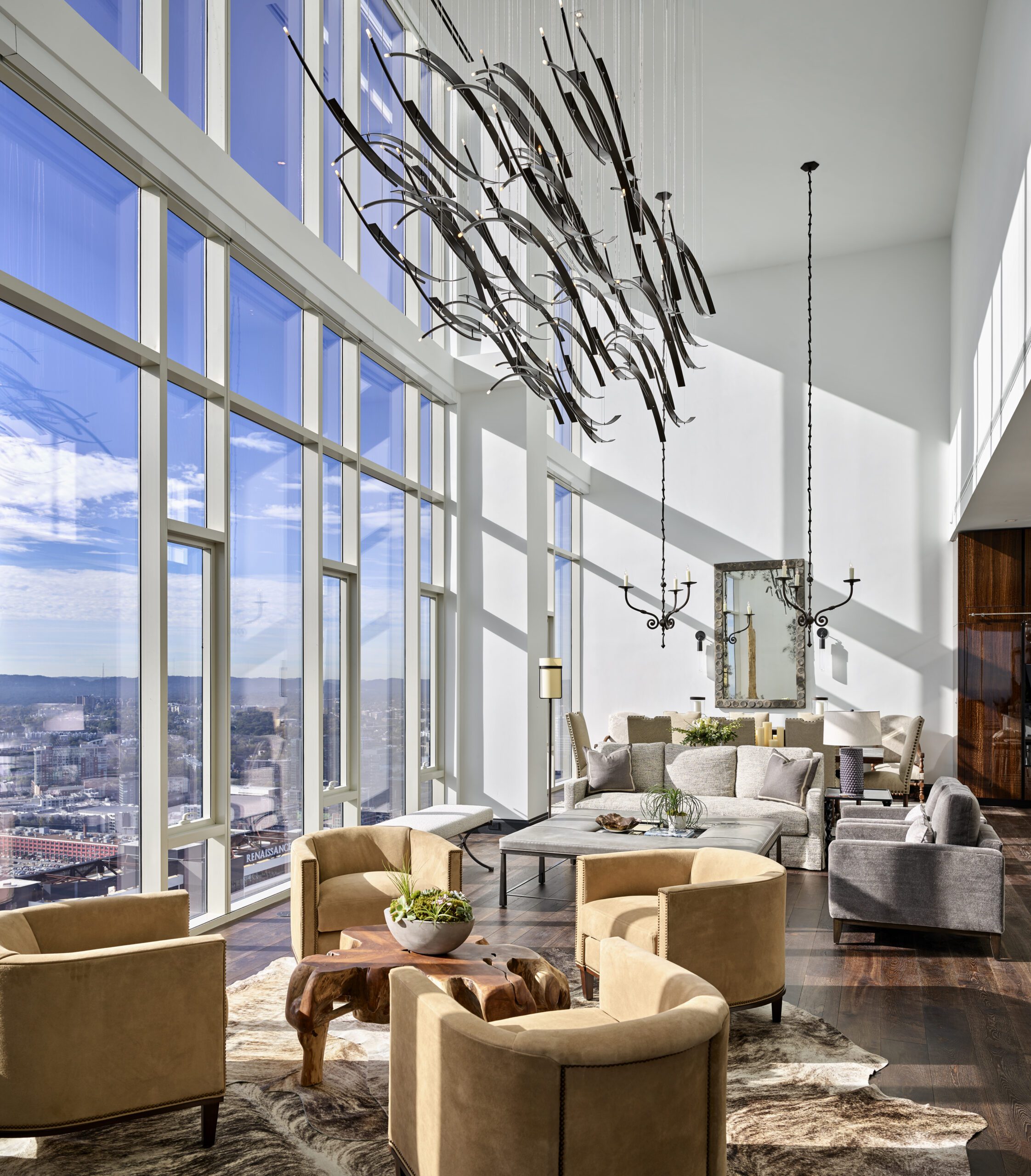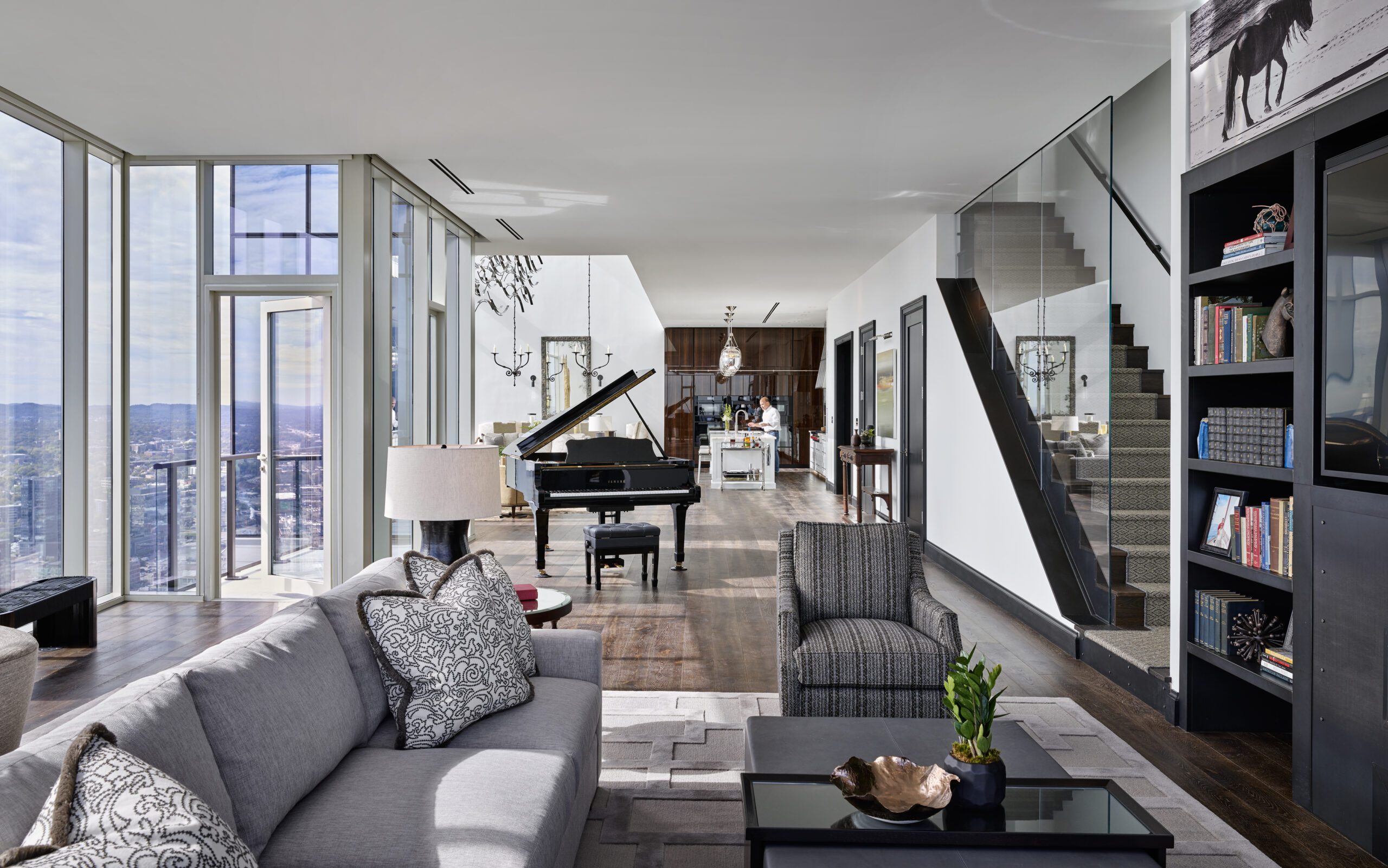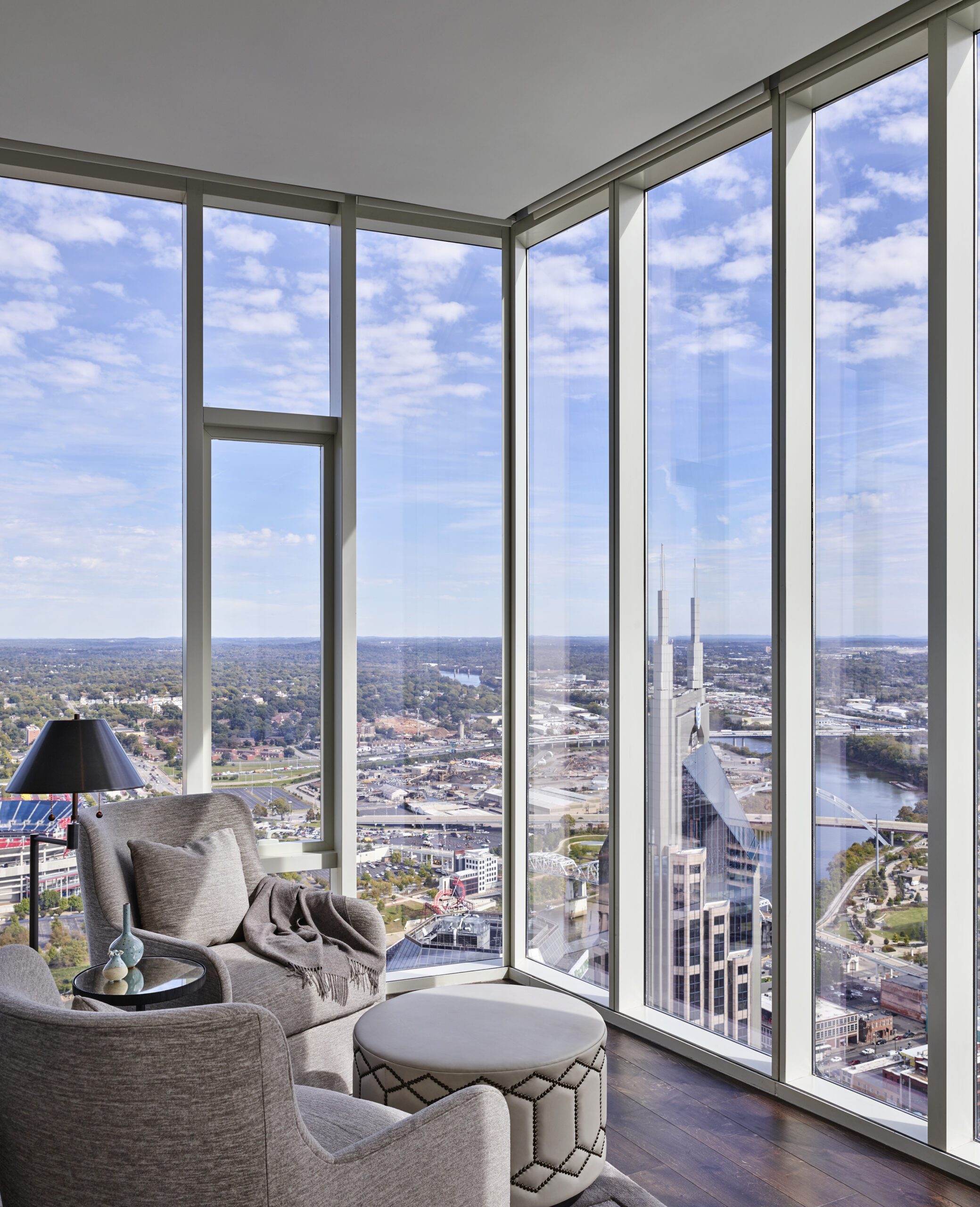 Two stories tall and surrounded by glass, the views from Giarratana’s residence with wife, Lisa, encompass every iconic Nashville landmark, including Nissan Stadium, the Cumberland River and the AT&T “bat” building.