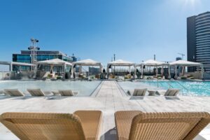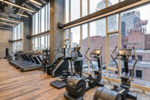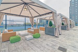 Sure it’s within walking distance to entertainment, food, retail and sports. But there is really no need to leave the building at all. With a gorgeous common space on the 7th floor, stunning pool, tennis courts, gym, dog park and entertaining spaces are all available for residents to use.