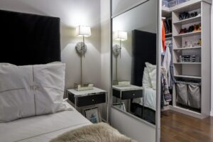 The smaller space — just under 1,000 square feet — is much easier and faster to clean than their previous home, and the move forced them to reevaluate what things they kept and how to best organize the rest. California Closets created a space that worked for both of their wardrobes, and they use the in-house maid service and on-site dry cleaners to take care of the laundry. Ashley Middlebrooks of Mitchell Gold + Bob Williams, is the lead designer at 505 and helped make the space amazing.