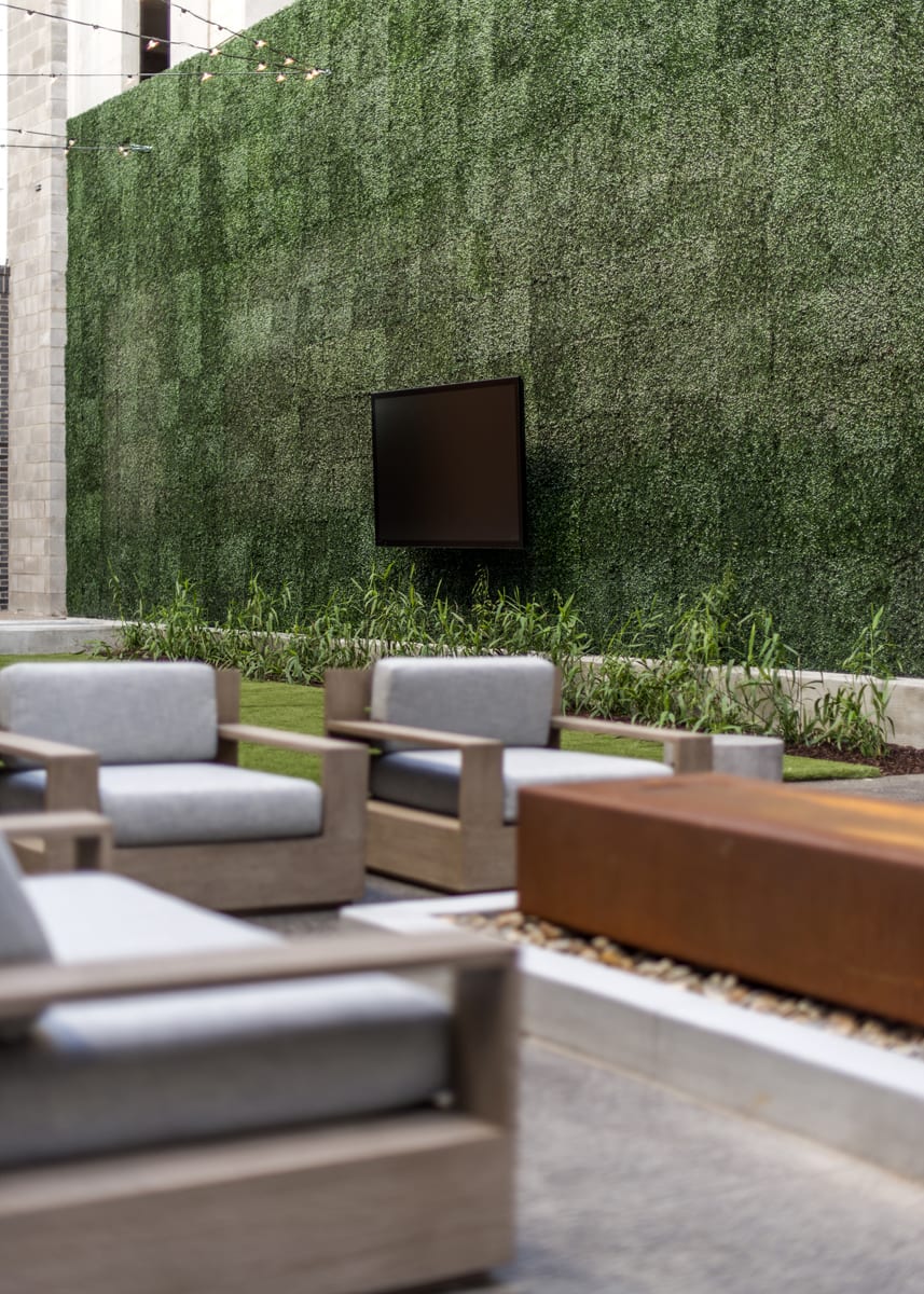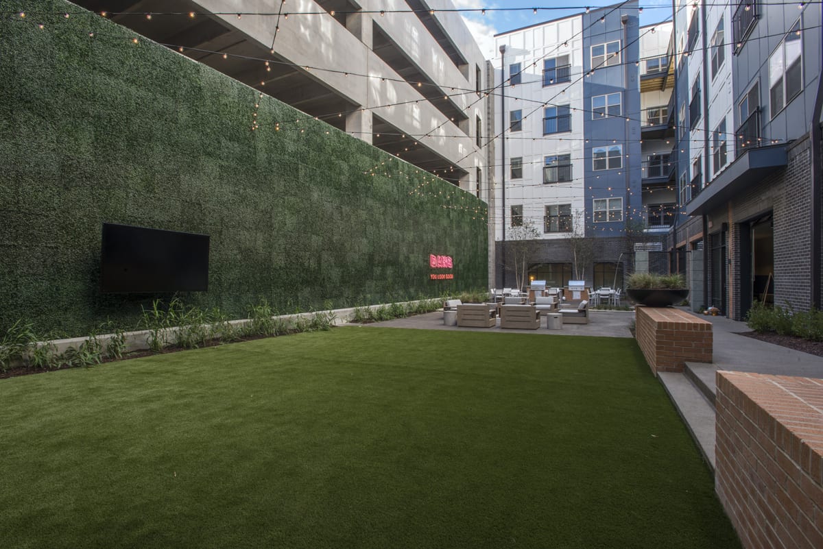 Those amenities also include a pet spa and dog walk, fitness and yoga facilities, a cyber café, a multi-level parking garage and a two-level sky lounge with an outdoor patio, fire pit and stunning view of downtown Nashville.