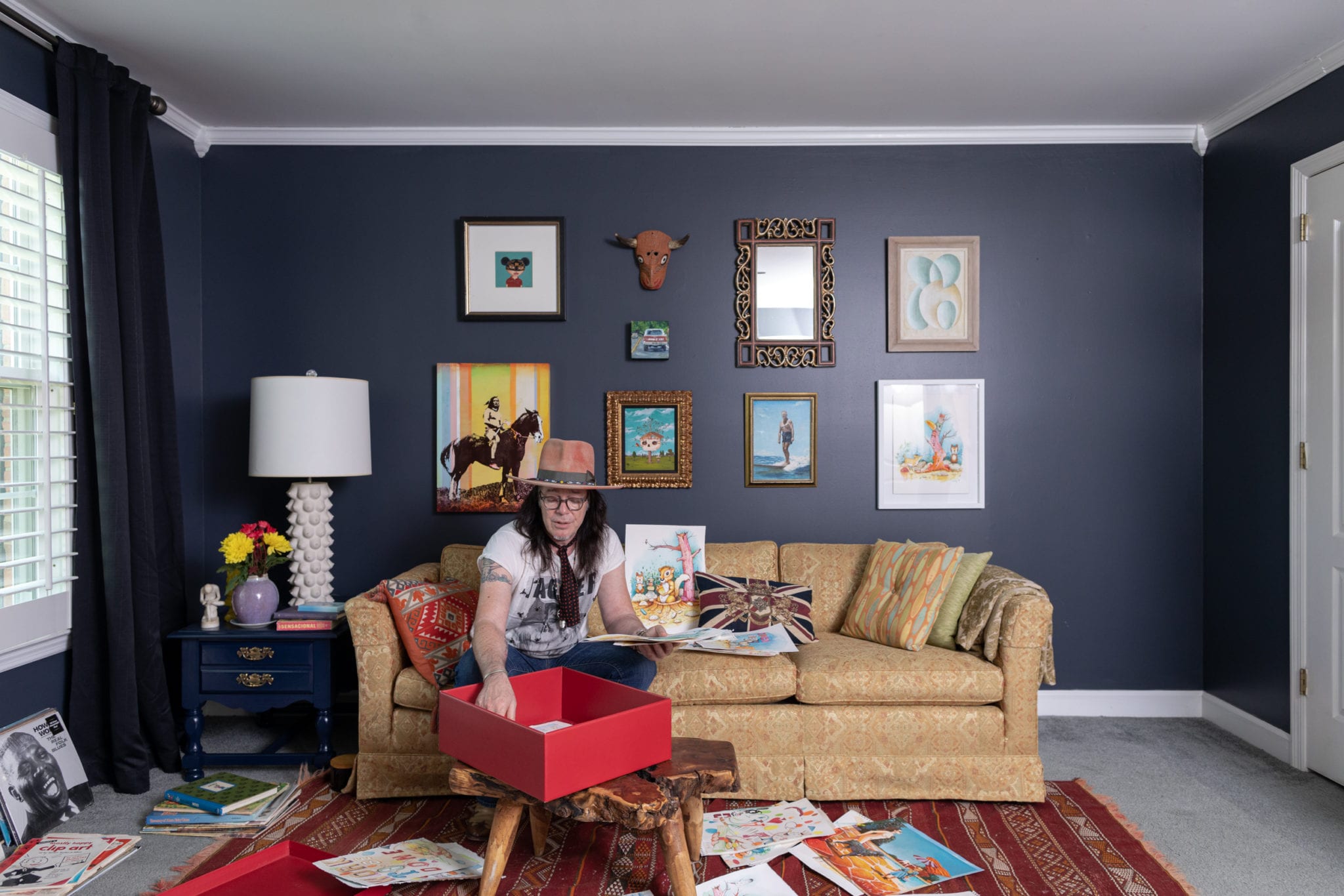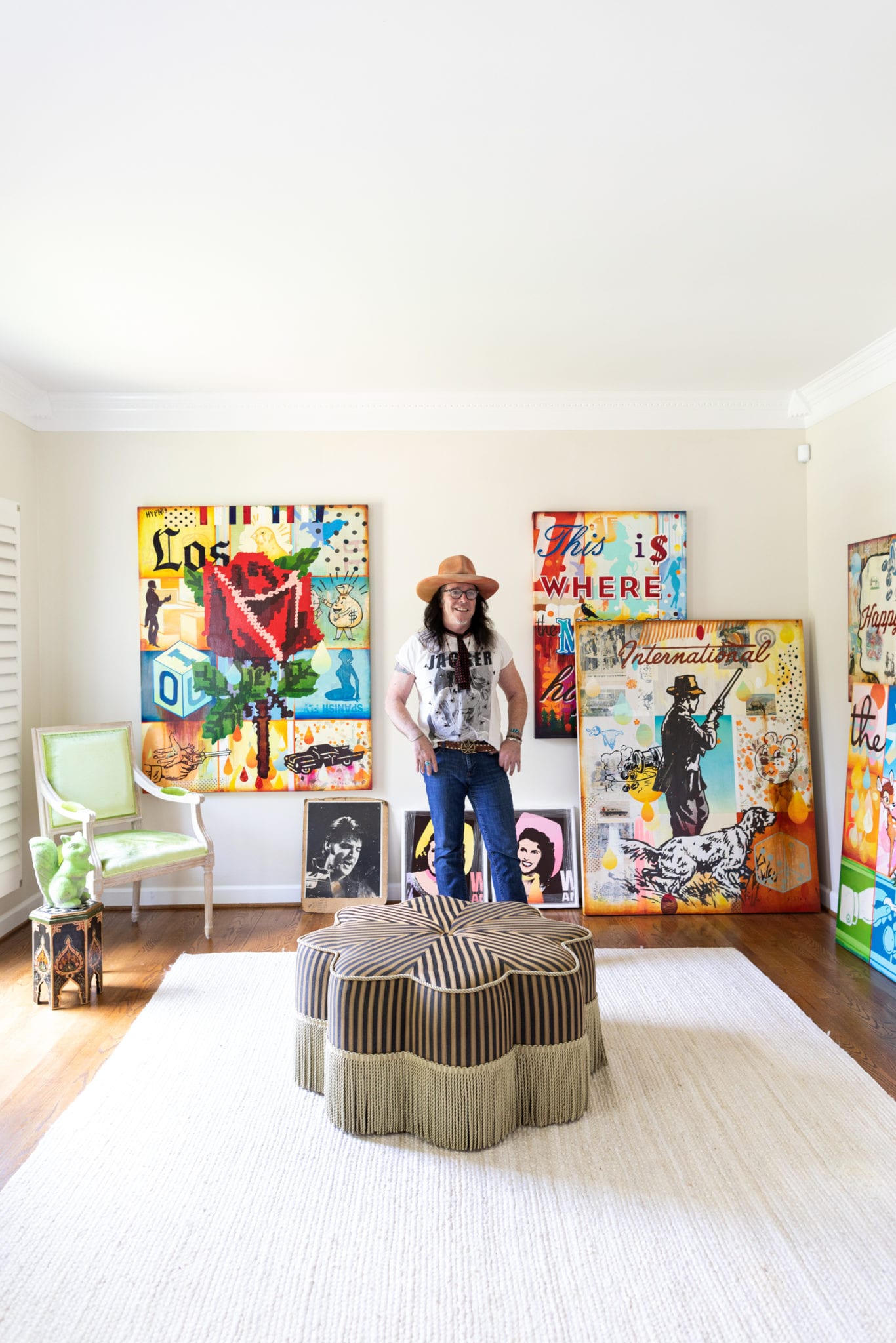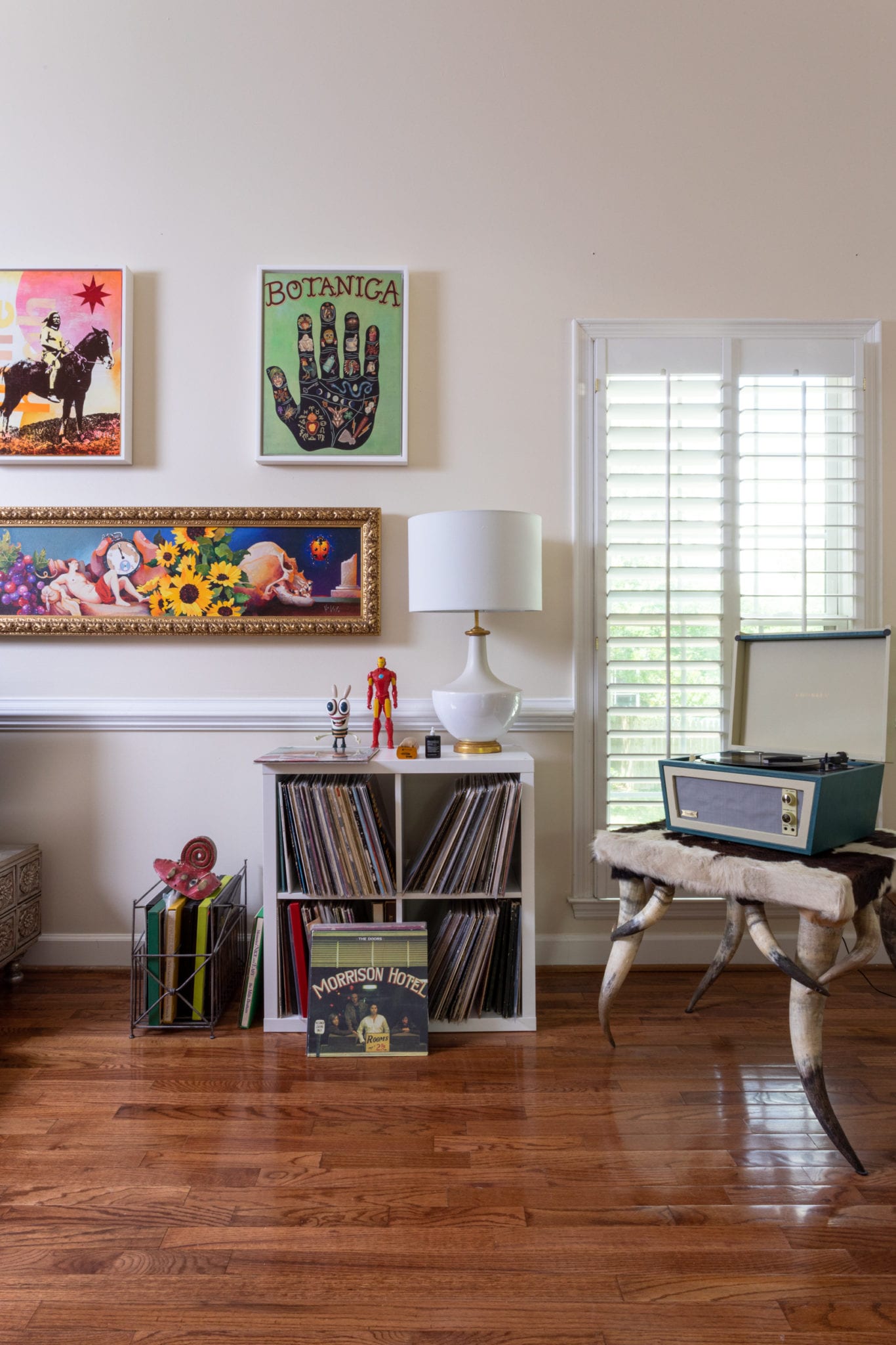 Almost every room in his home has a record player, and pieces from Southeastern Salvage mix with Home Goods. The cowhide table he bought from some Navajo Indians back in the ’80s and has been the one thing he has dragged with him place to place. And of course, art is everywhere.