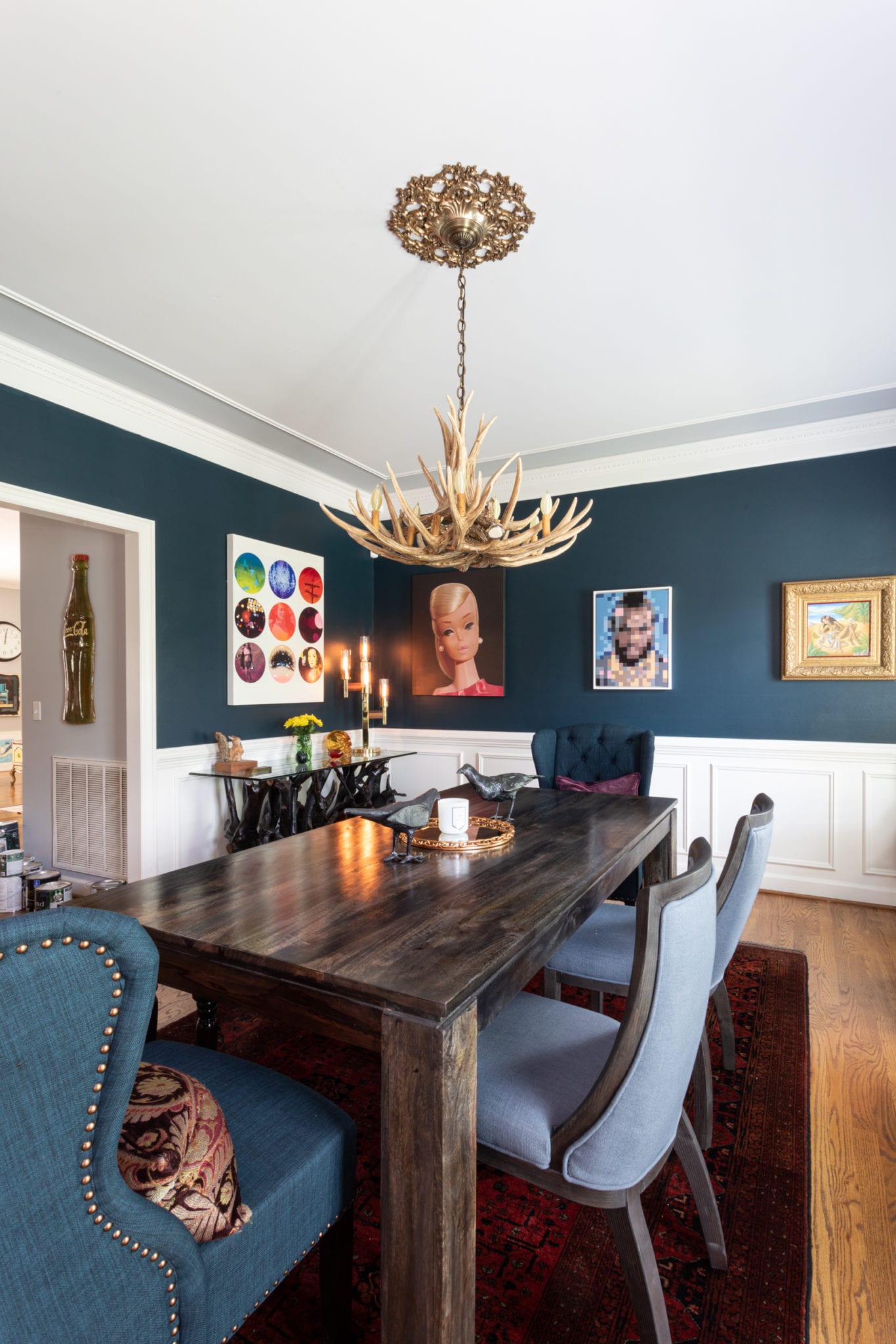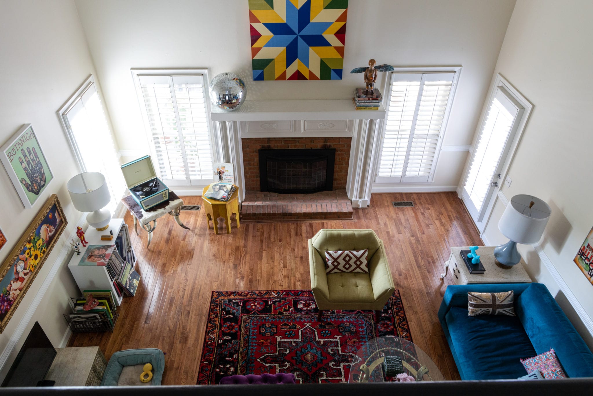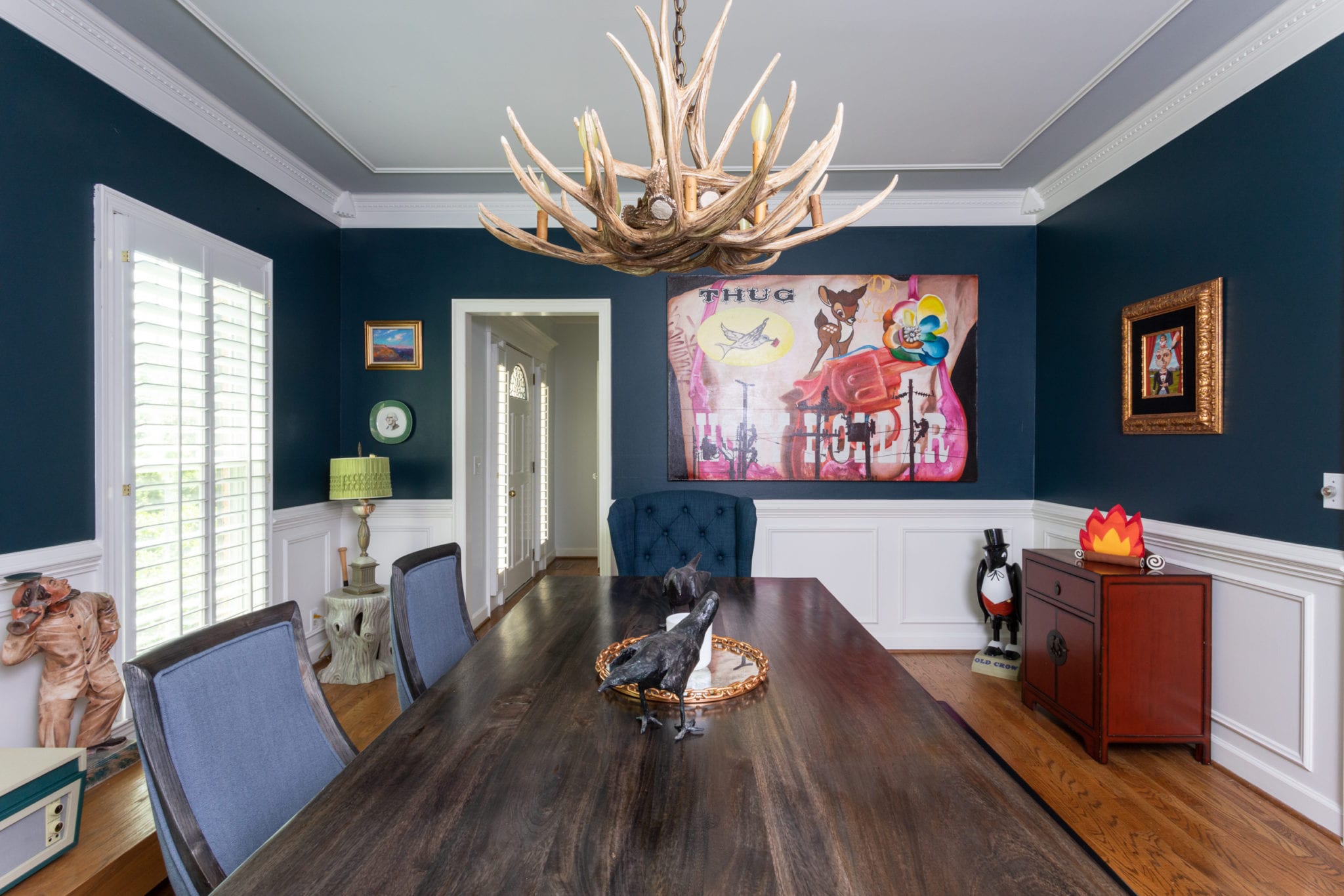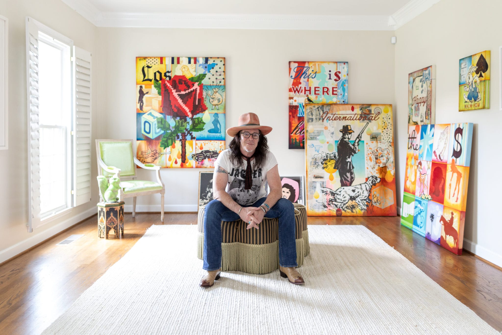Almost every room in his home has a record player, and pieces from Southeastern Salvage mix with Home Goods. The cowhide table he bought from some Navajo Indians back in the ’80s and has been the one thing he has dragged with him place to place. And of course, art is everywhere.