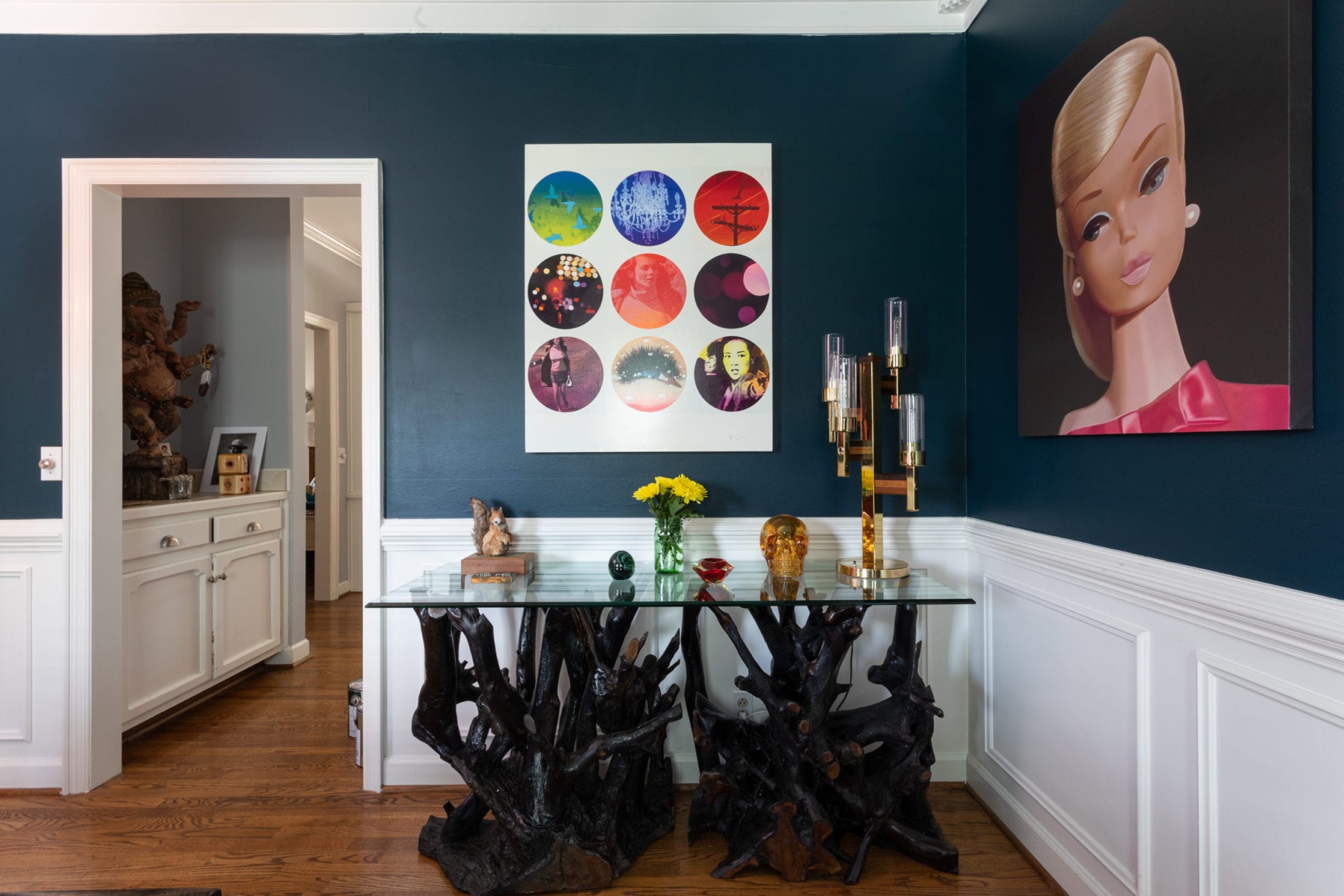 The dining room is filled with paintings he’s collected: a silk-screen bullwhip girl of his own, a collaboration with graffiti muralist Jules Muck, an oil painting of Barbie from Judy Ragali, a digitized Mr. T from Erick Laubach and a small piece from Robert Palacios.
