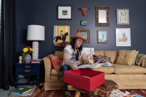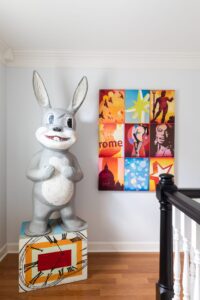 Upstairs, outside the room where Hobley does his watercolors, a fiberglass bunny that once graced an old miniature golf course holds court in the hallway. A Jonathan Adler lamp featuring a repeat breast pattern sits on a table next to a couch that looks straight out of the ’60s. It’s all a dash of Liberace with a little bit of Scarface simmering with Dolly Parton and Elvis undertones.