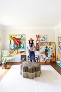 Soon his work was hanging in the smash show’s Central Perk “coffee shop,” as well as on other sets like “Ally McBeal” and “Two Guys, A Girl, and a Pizza Joint.” Then a huge piece was used in the apartment of “Dharma and Greg,” and suddenly he had the kind of cache his mom could brag to her friends about. A-list stars became collectors, including Brad Pitt, Weird Al Yankovic, Natalie Maines and Marie Osmond.