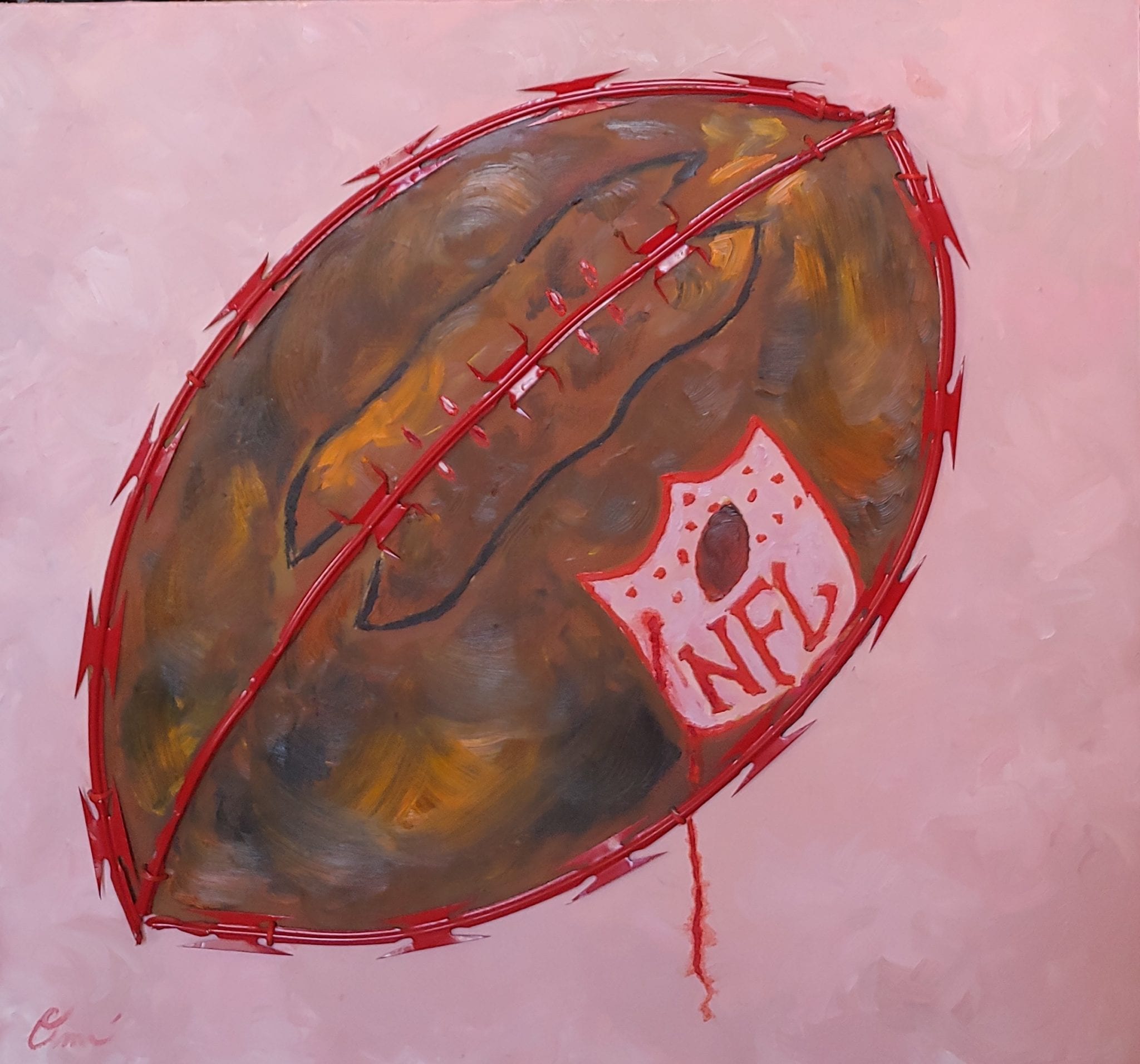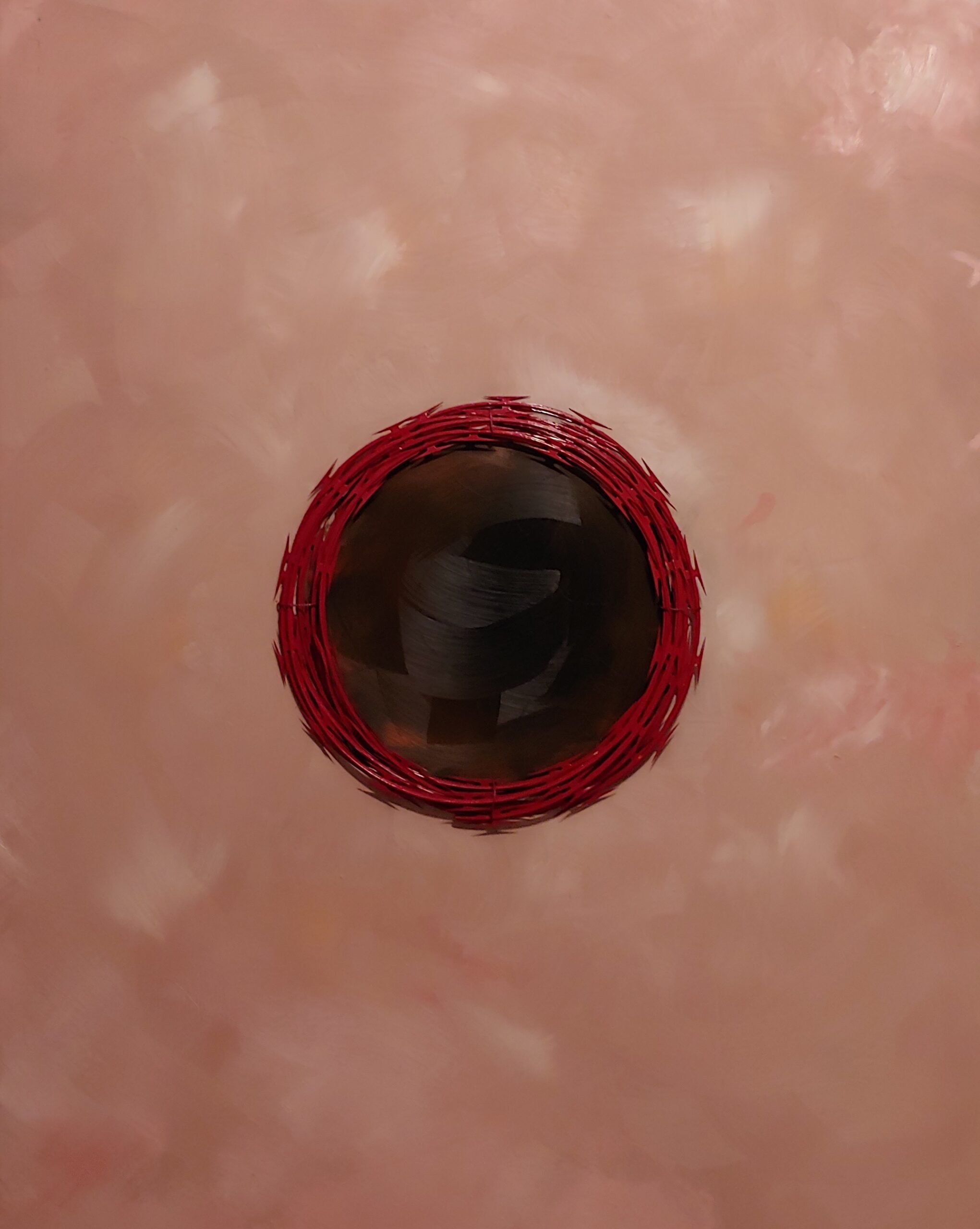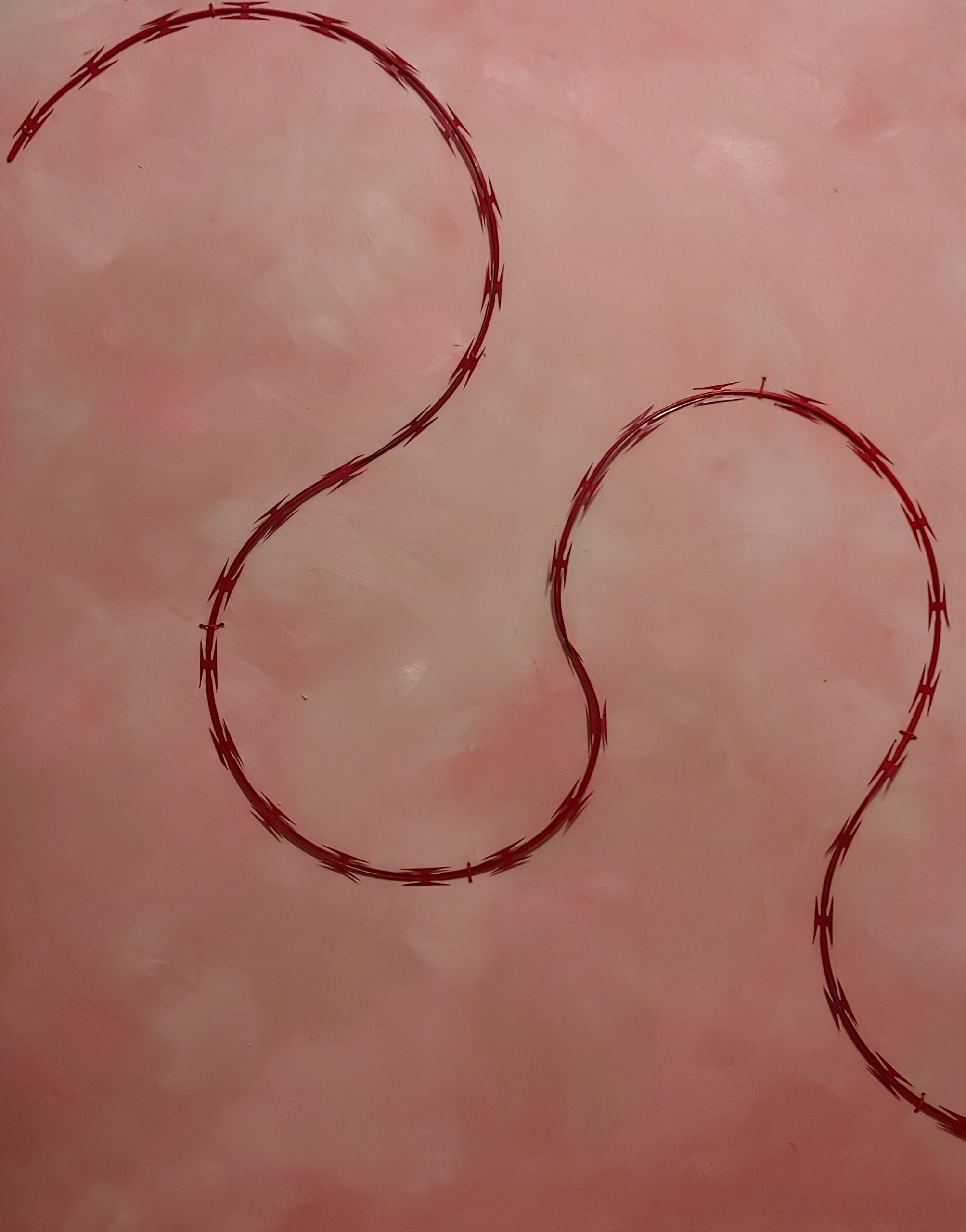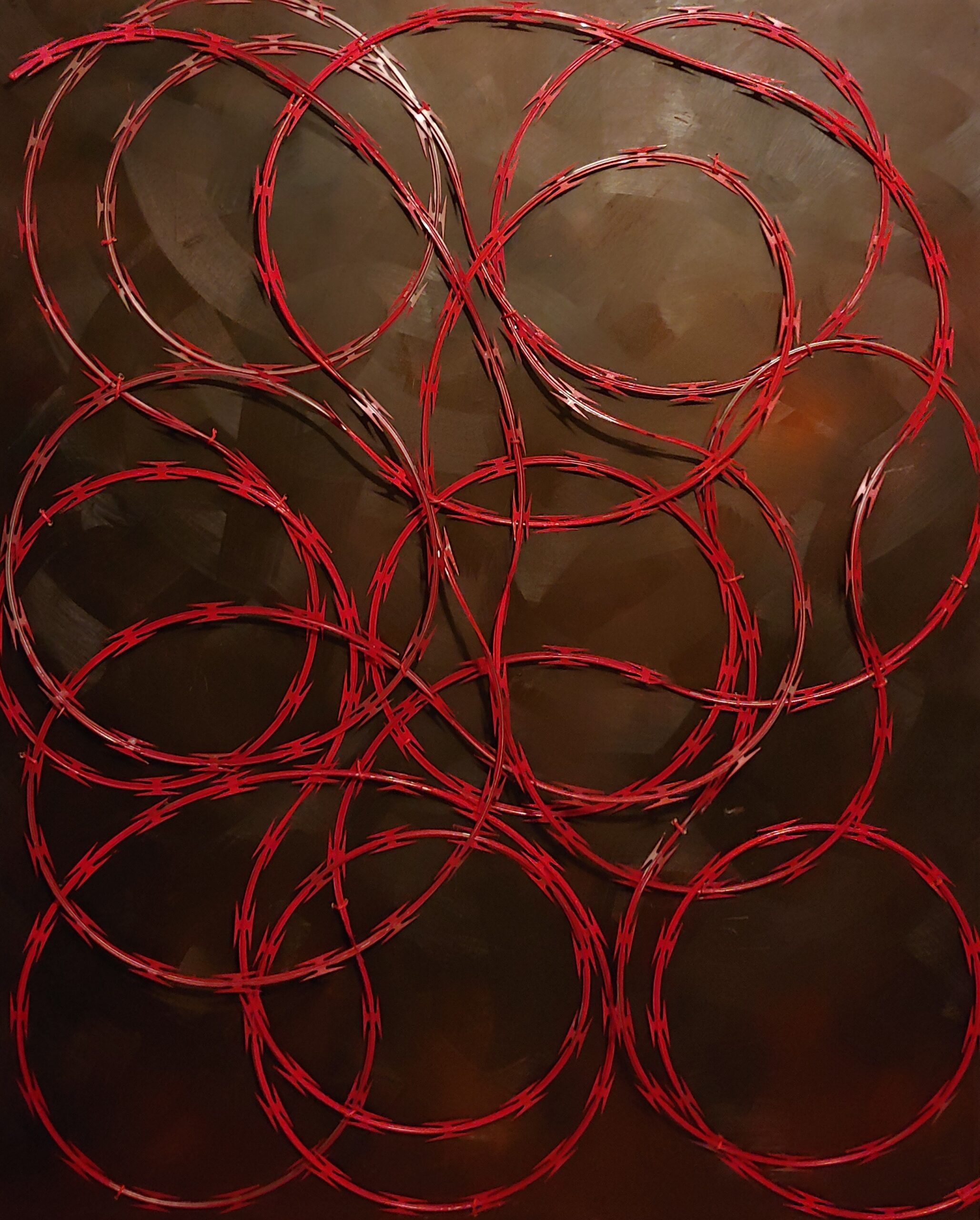 For the past year or so he had been focused on making art around the one specific topic of redlining — federal discriminatory housing laws. He uses red razor wire and flesh tone colors to create pieces that addressed how those laws set the stage for discrimination and how they affected aspects of American life like sports and the military.