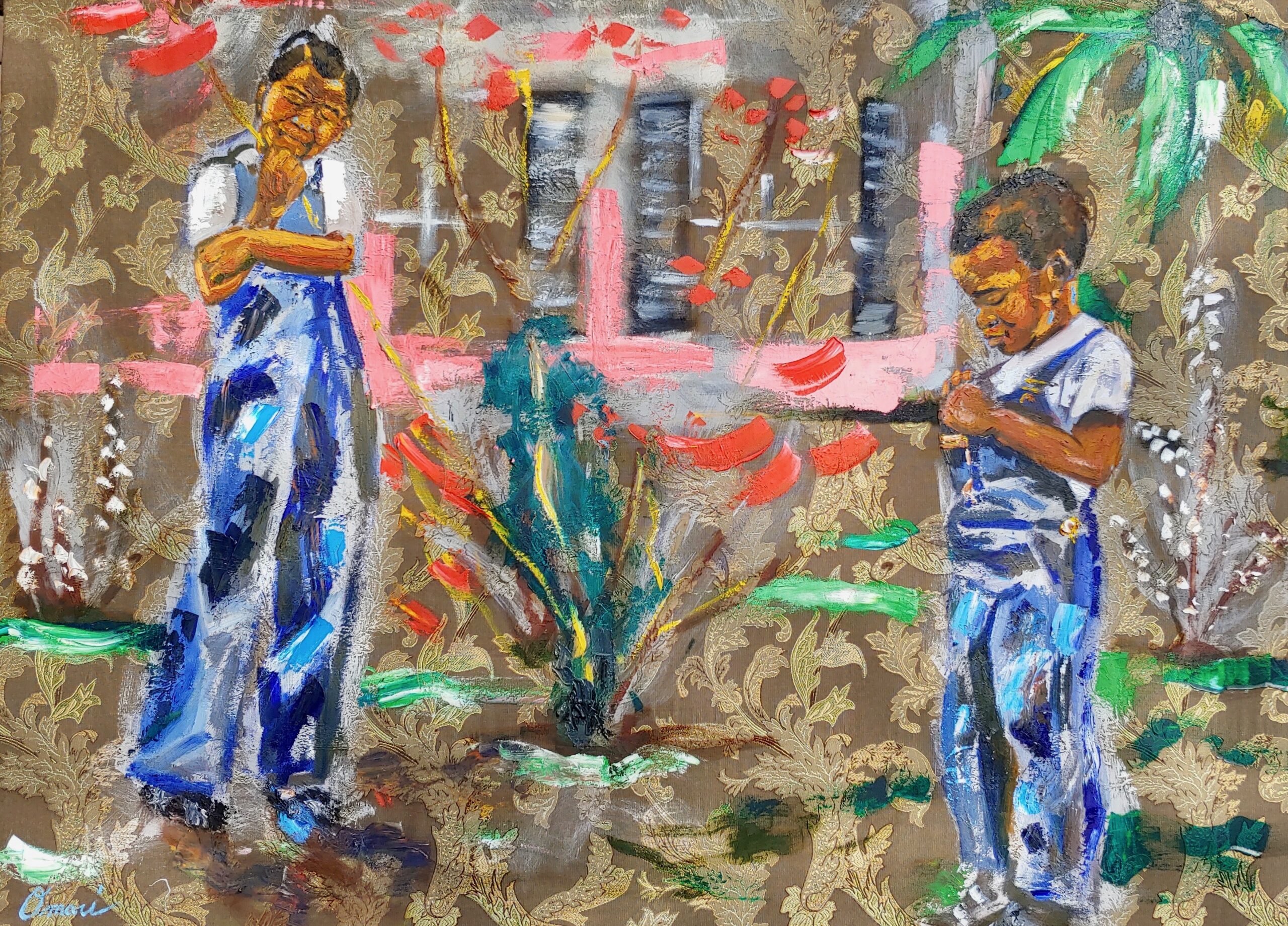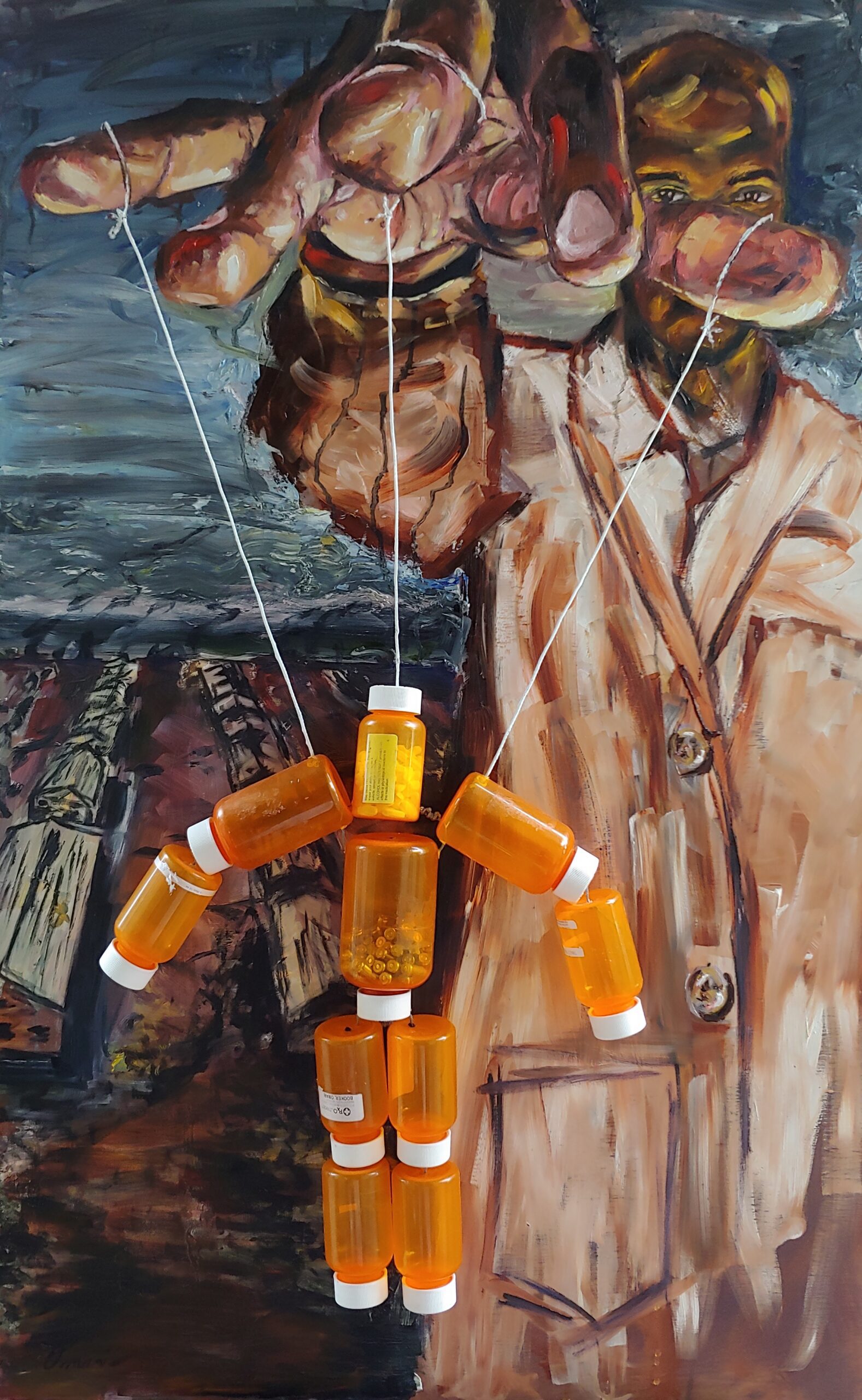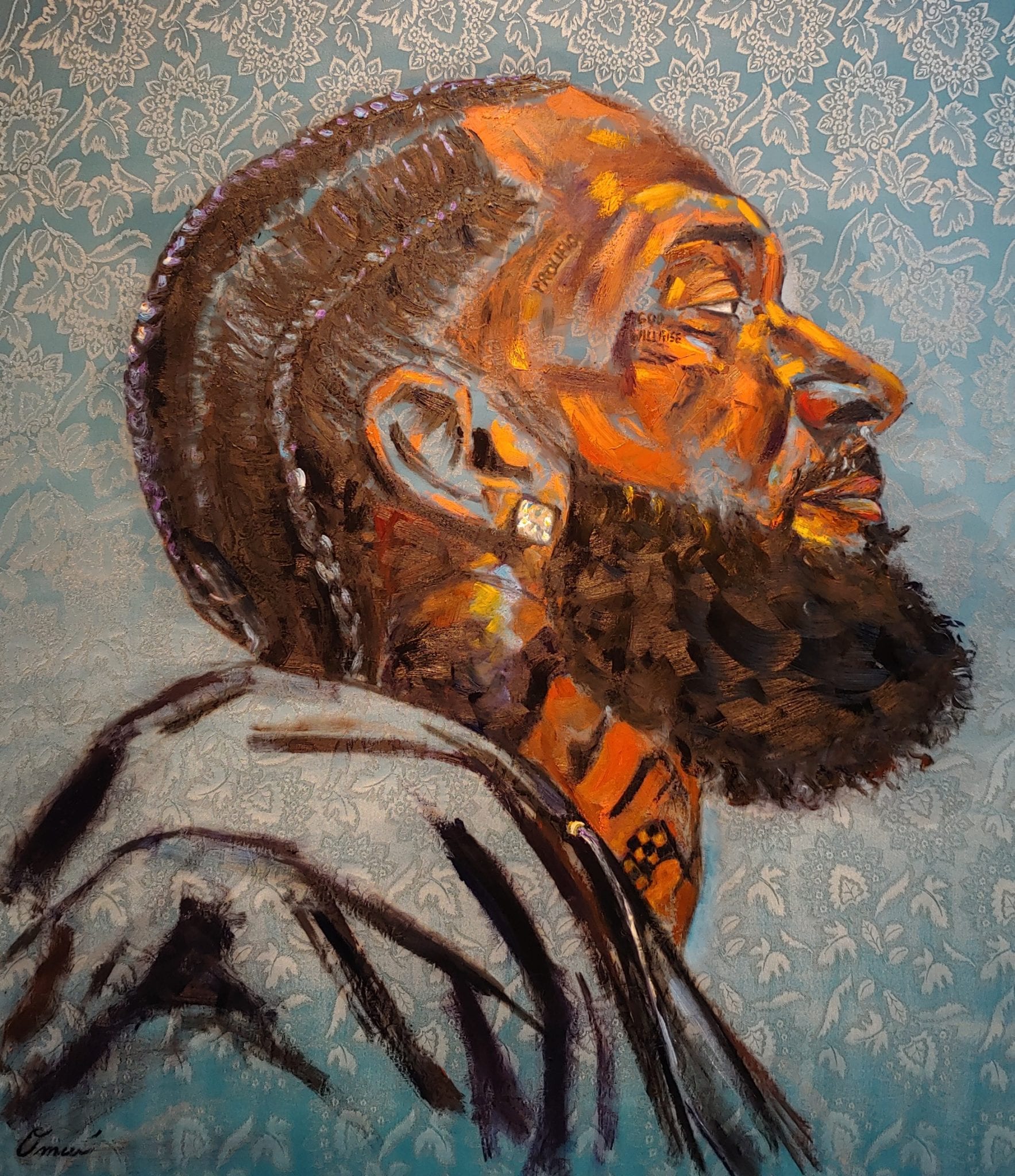His art and style have evolved over time, spurred on by his almost-daily practice of creating in the studio. He finds influence in Vincent Van Gogh and Salvador Dali, as well as Charles White and Jacob Lawrence.