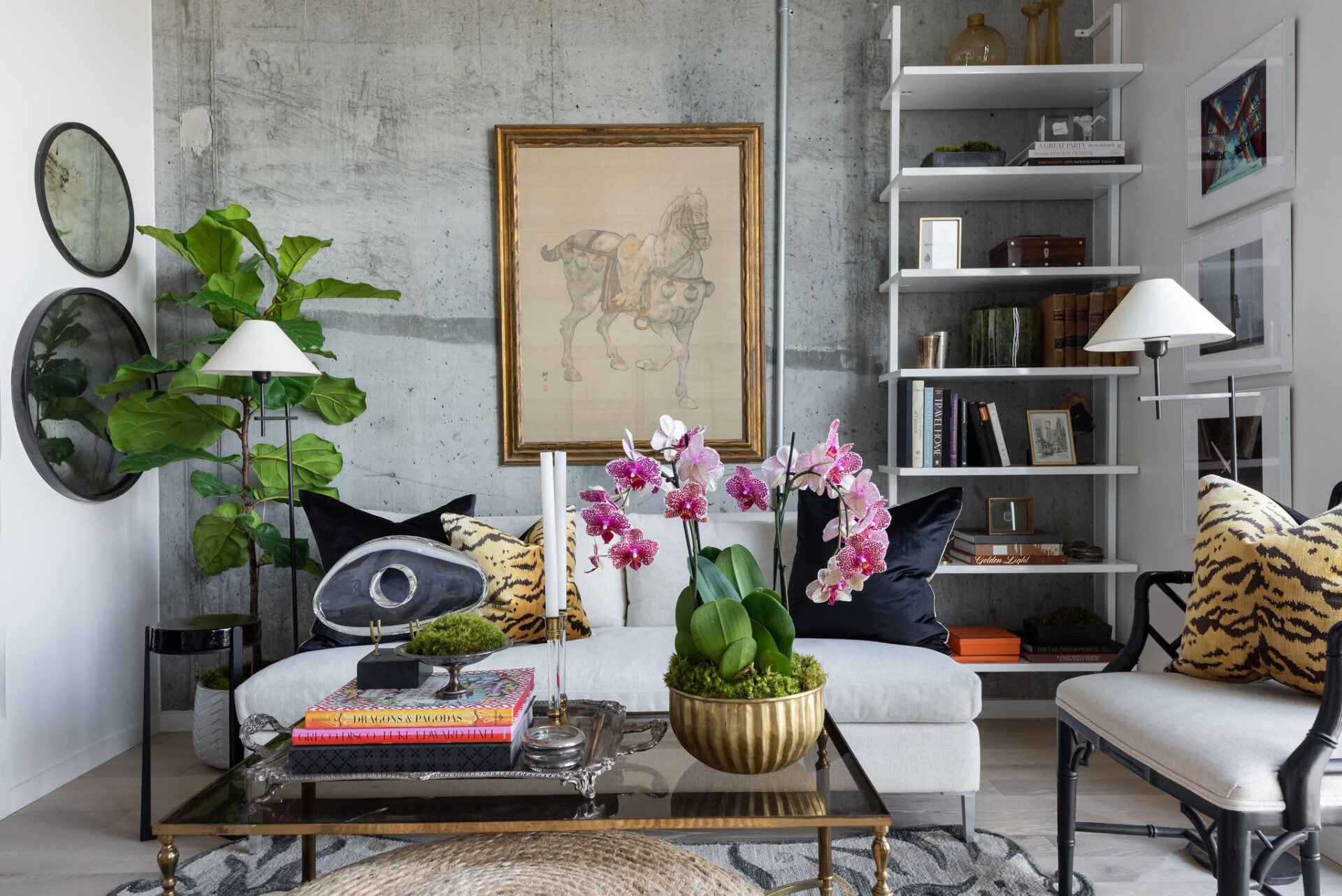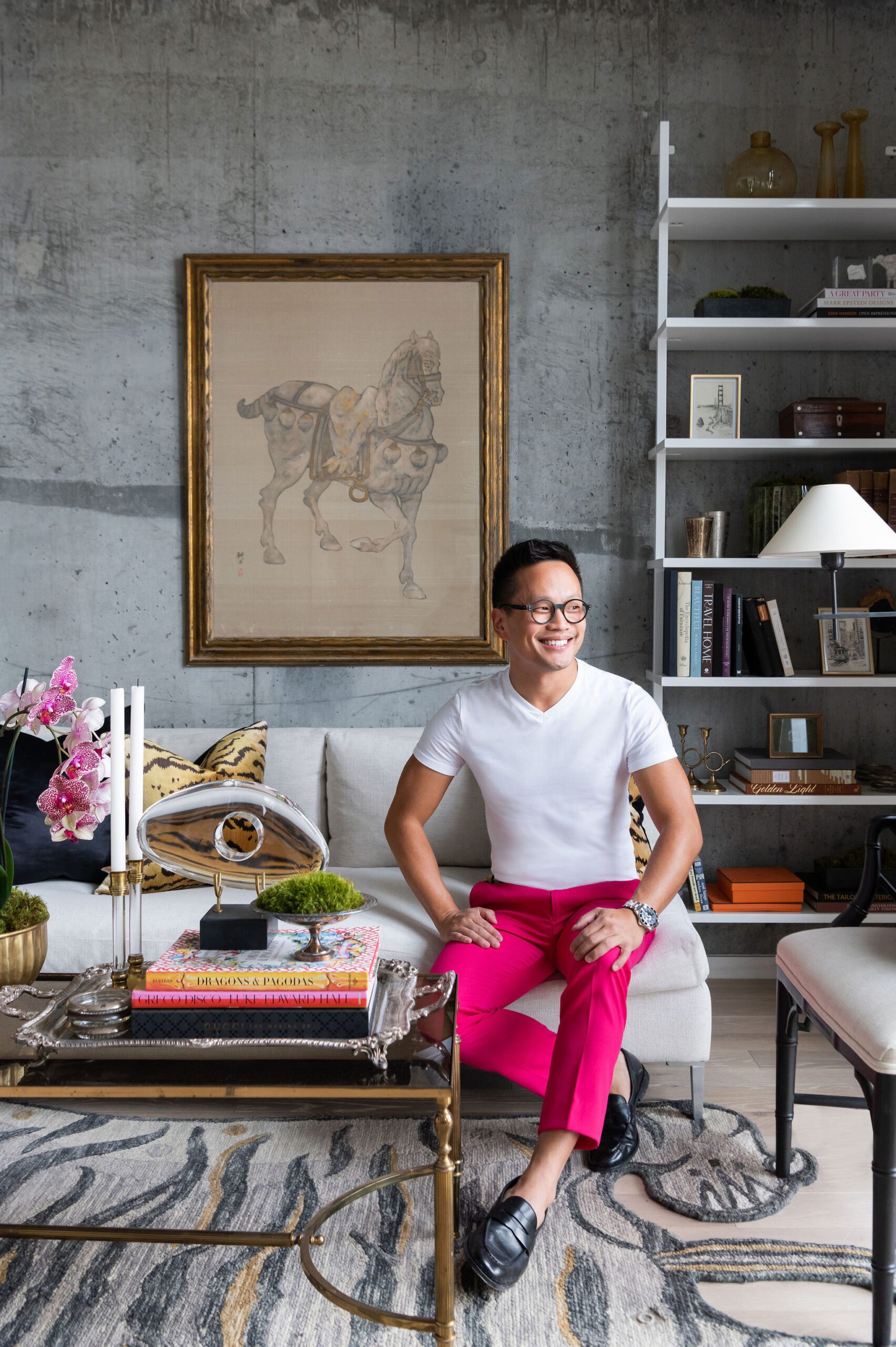 As for pattern, he brought in a leopard print with pillows, a great way to bring in the bold without a huge financial investment. “Or boxes and decorative accessories — anything that you can really move from room to room.”