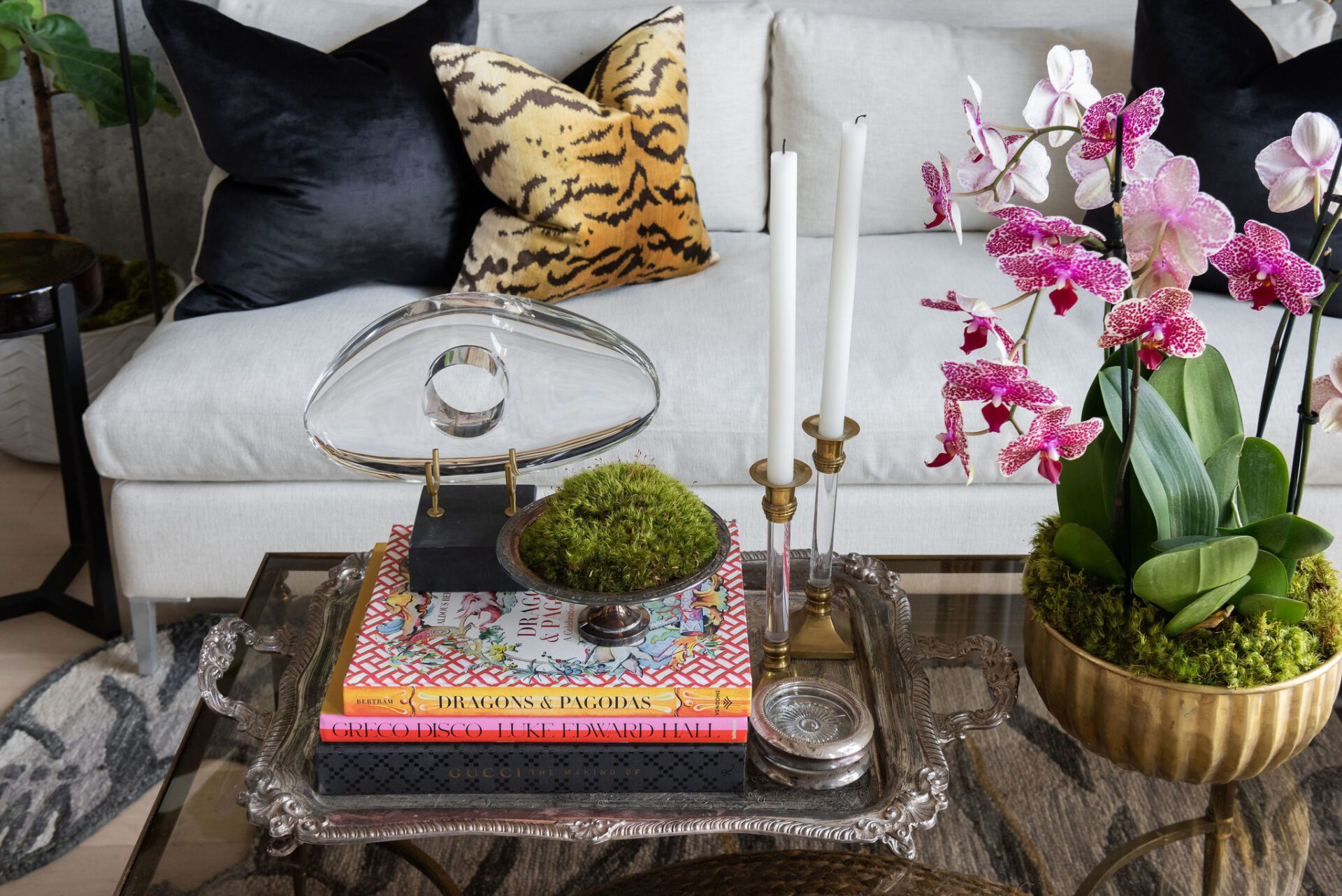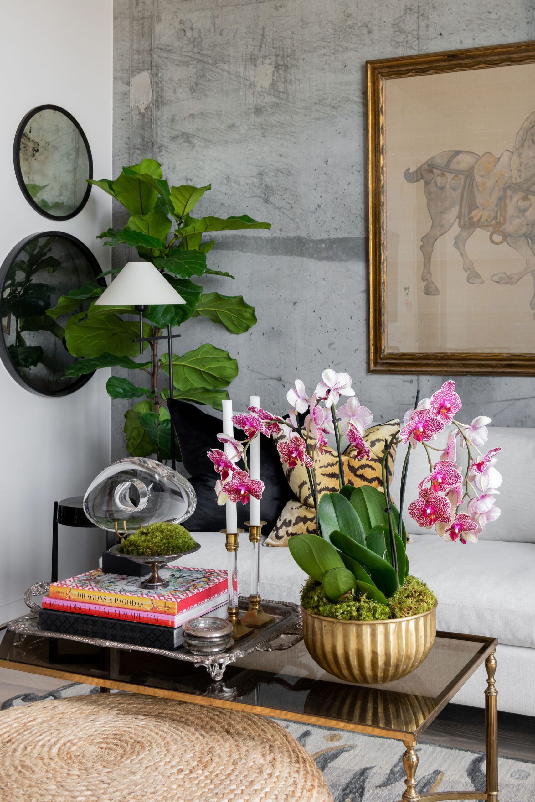 “I think the best way to incorporate textures and colors is in small increments,” Millard says. “As you can see in my living room, I, introduce color through natural, fresh flowers, like orchids. That’s such a great way to incorporate natural beauty and color.”