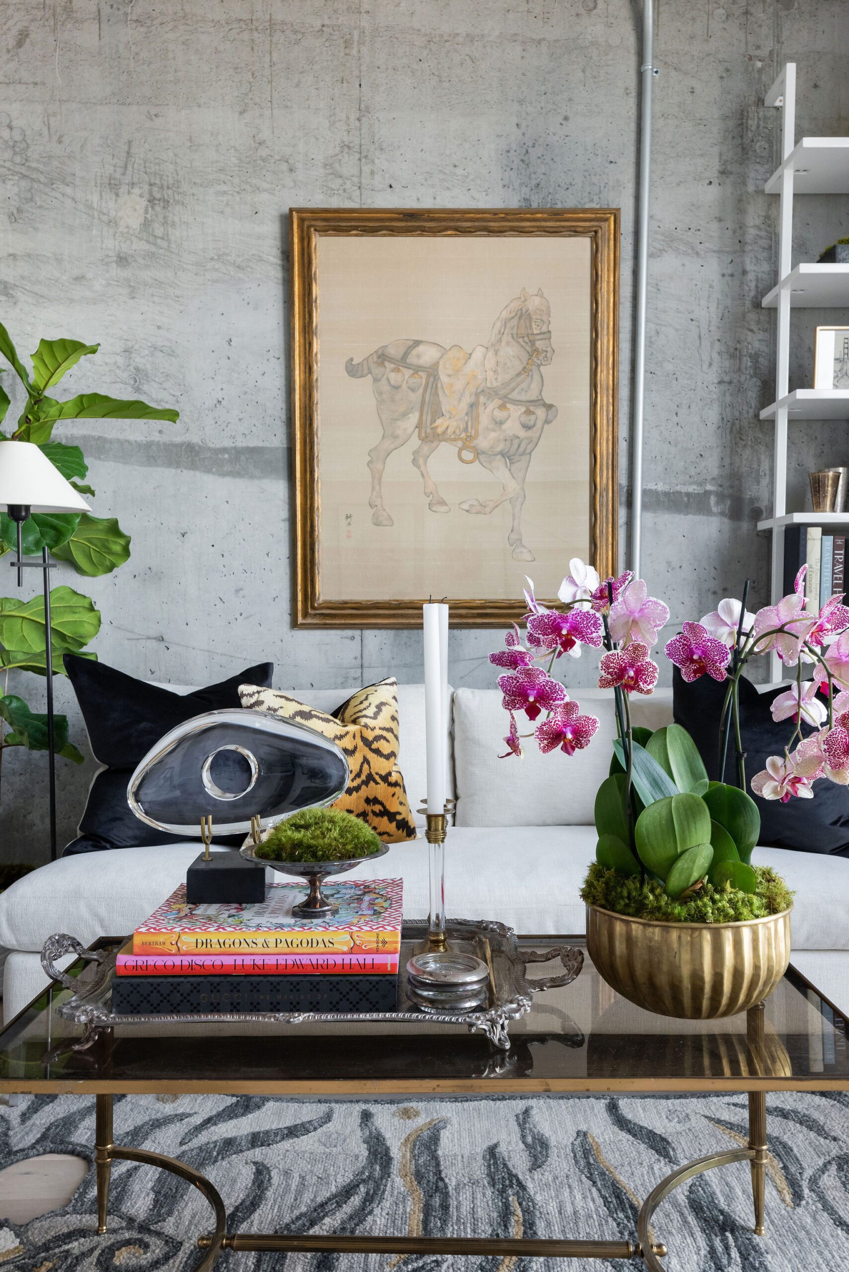 To keep the small space — about 400 square feet — feeling fresh and eclectic, Millard brought in an armless white sofa from CB2 and mixed that with vintage and antique pieces like the brass and glass coffee table.