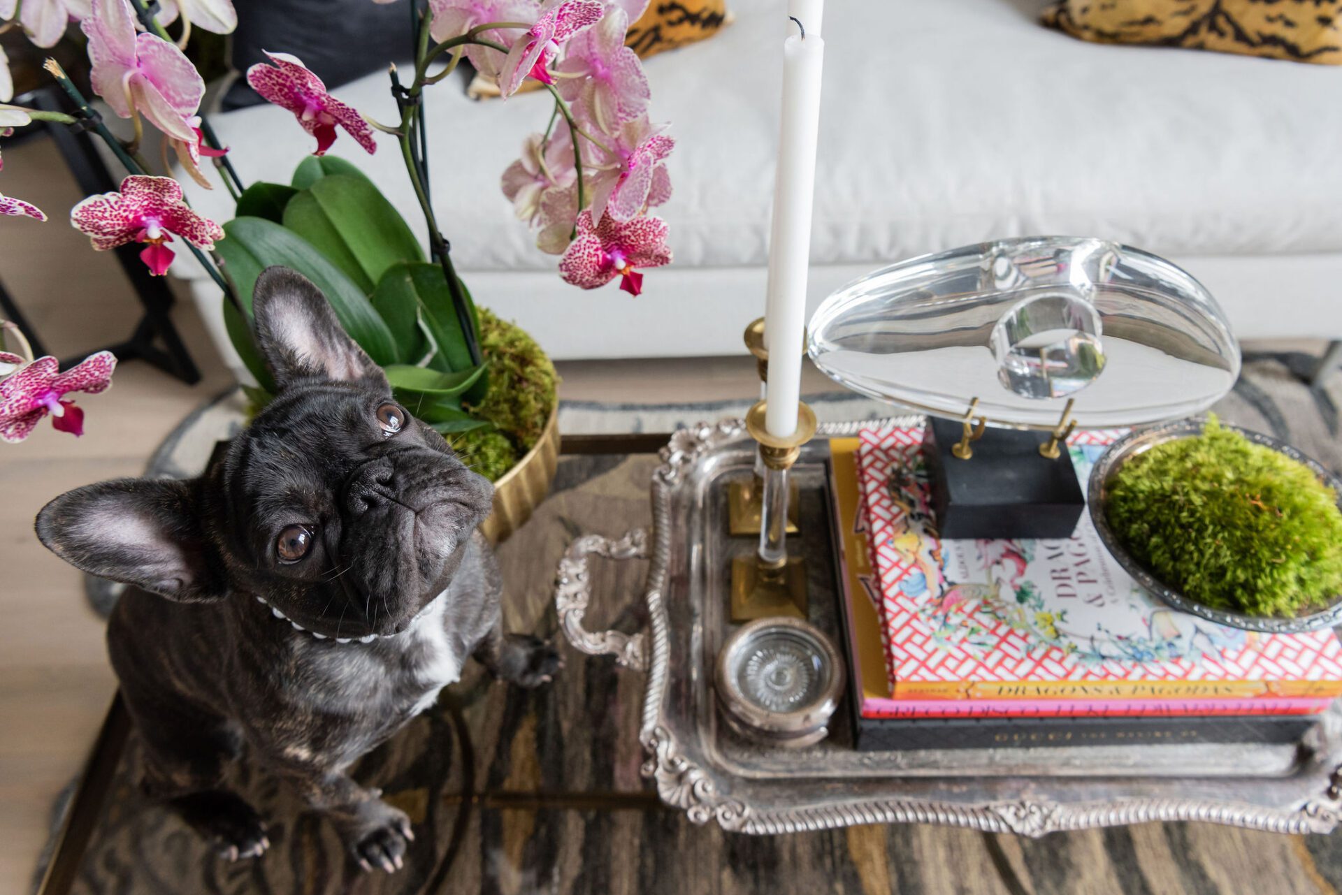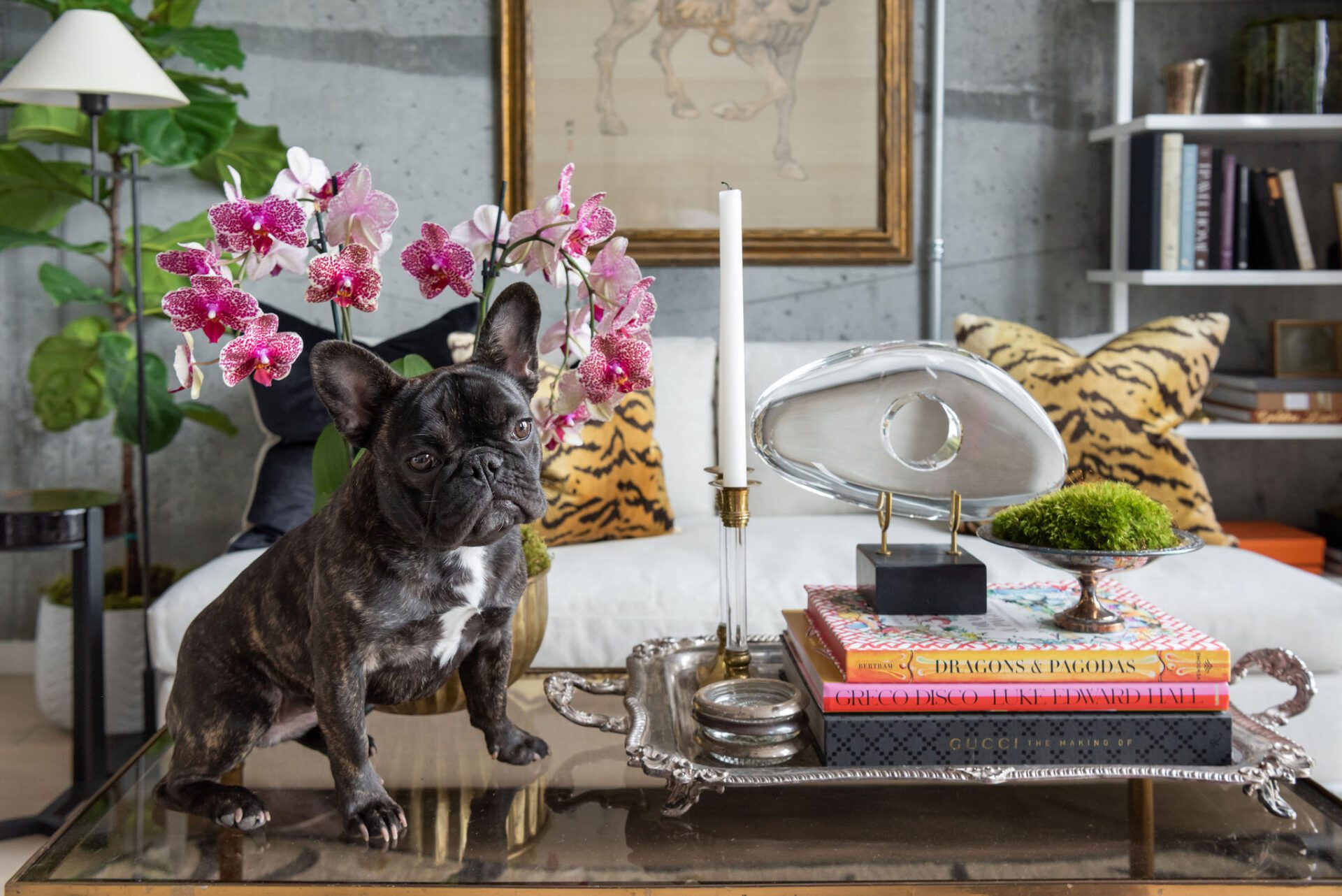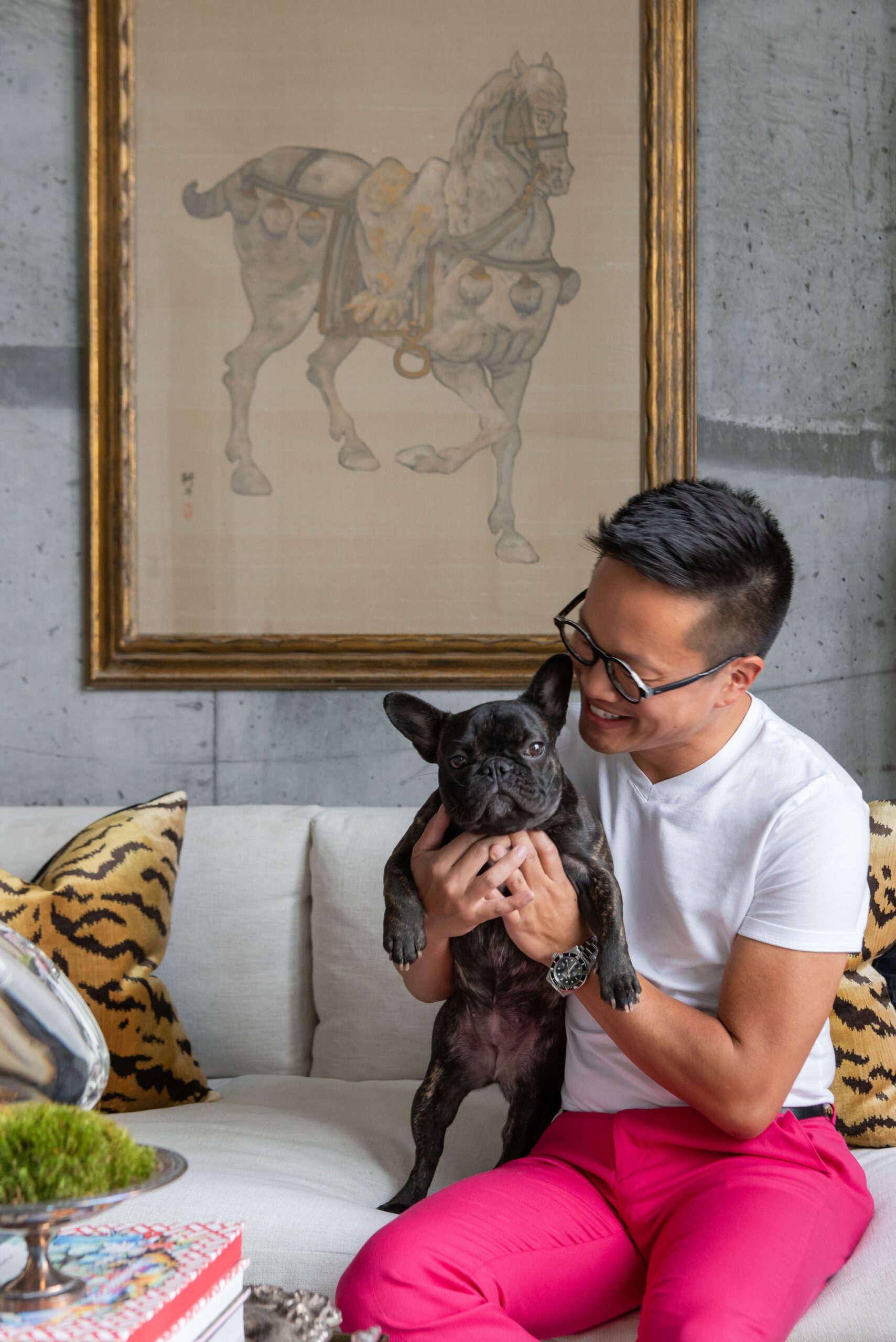 His roommate, a Frenchie pup named Sophia Marie, doesn’t need much space and loves basking in the sun by any one of the floor-to-ceiling windows that wrap the unit. Sometimes you can even catch her napping in her pearls.