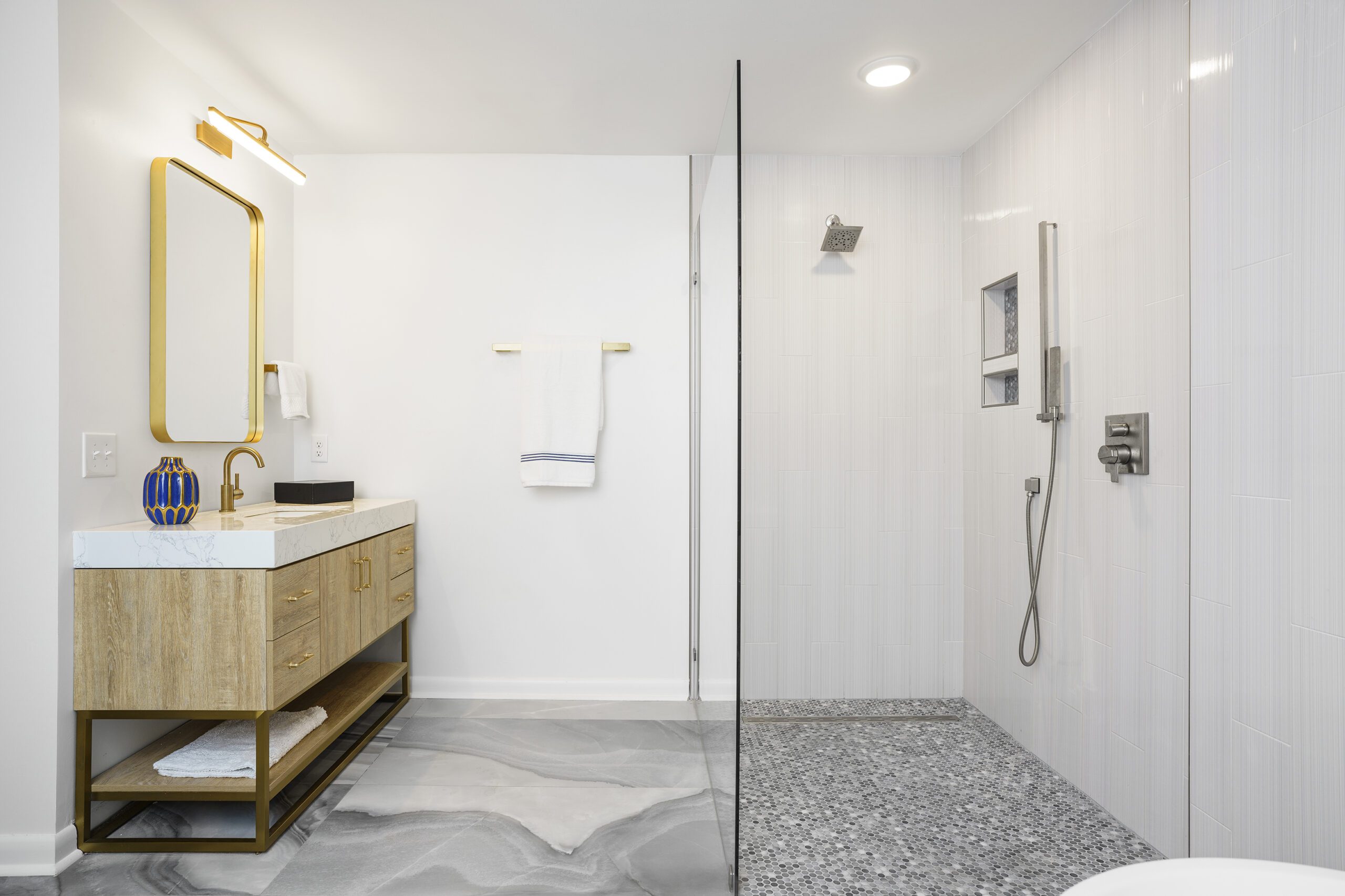 The spacious entry gallery boasts high ceilings, skylights and the original screened dividers separating the main hallway from the lower-level stairs. To one side of the gallery in a linear procession are the fully renovated kitchen, dining room and living room, bookended with sliding glass doors and a clear view to nature made grander beneath a newly vaulted ceiling. A long balcony stretches across the back of the home and offers an elevated experience of the back yard. The same perforated panels frame an opening between the dining and living room, which sits a few steps down. Wall to wall carpet was pulled up, and new flooring installed to be more kid friendly. The Fords will keep the original built-in shelving, desk, heated floor and avocado green fixtures in the kids’ bed and bath. The front portion of the first level consists of the primary suite. For this area, John and his wife decided to rework the floor plan to give themselves a spacious bathroom with a curbless glass shower, a soaking tub and dual vanities. The sleeping area anchors the suite, and a previously unconditioned room that might have been Dr. Jordan’s office will be turned into a luxurious walk-in closet complete with dressing tables, wardrobe-style cabinets and space to find a moment of quiet bliss.