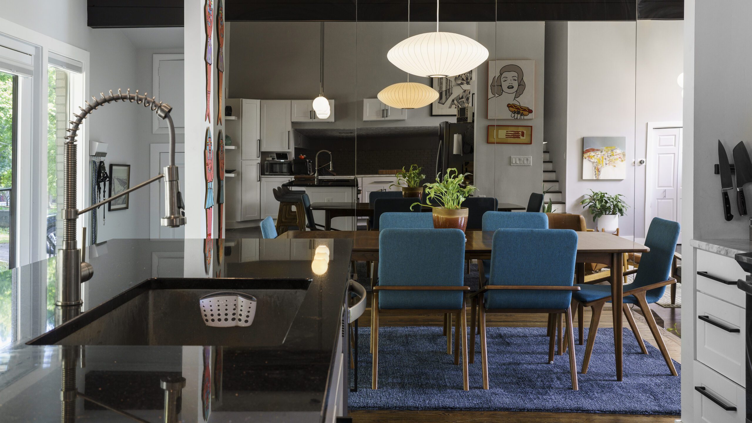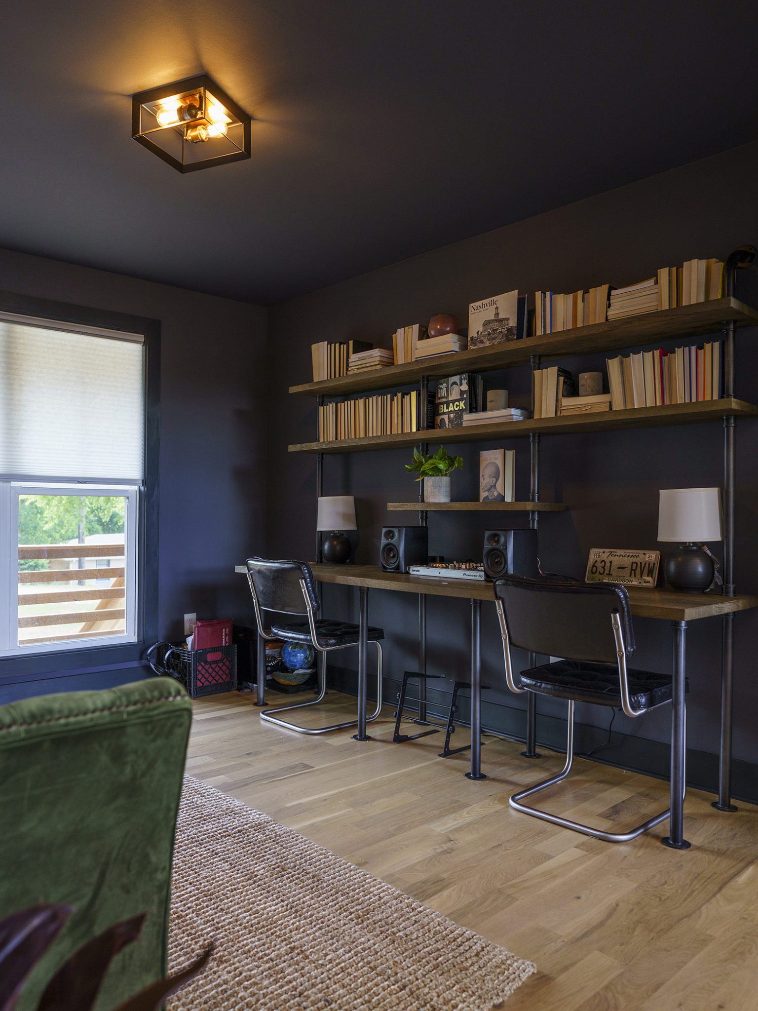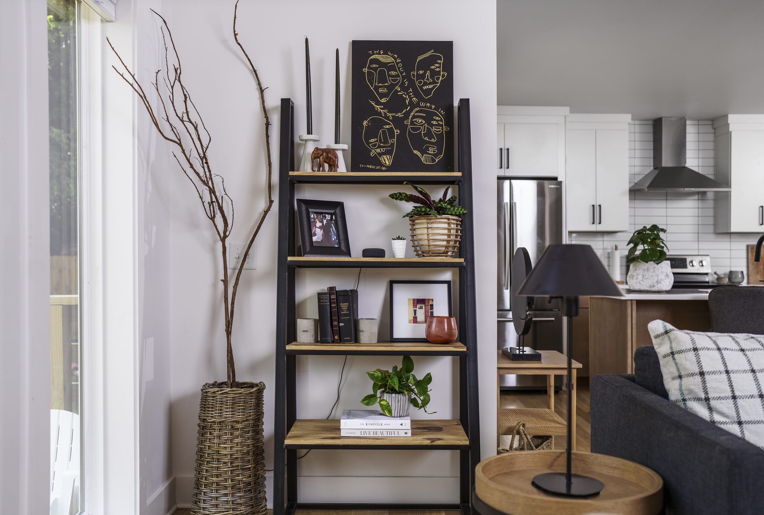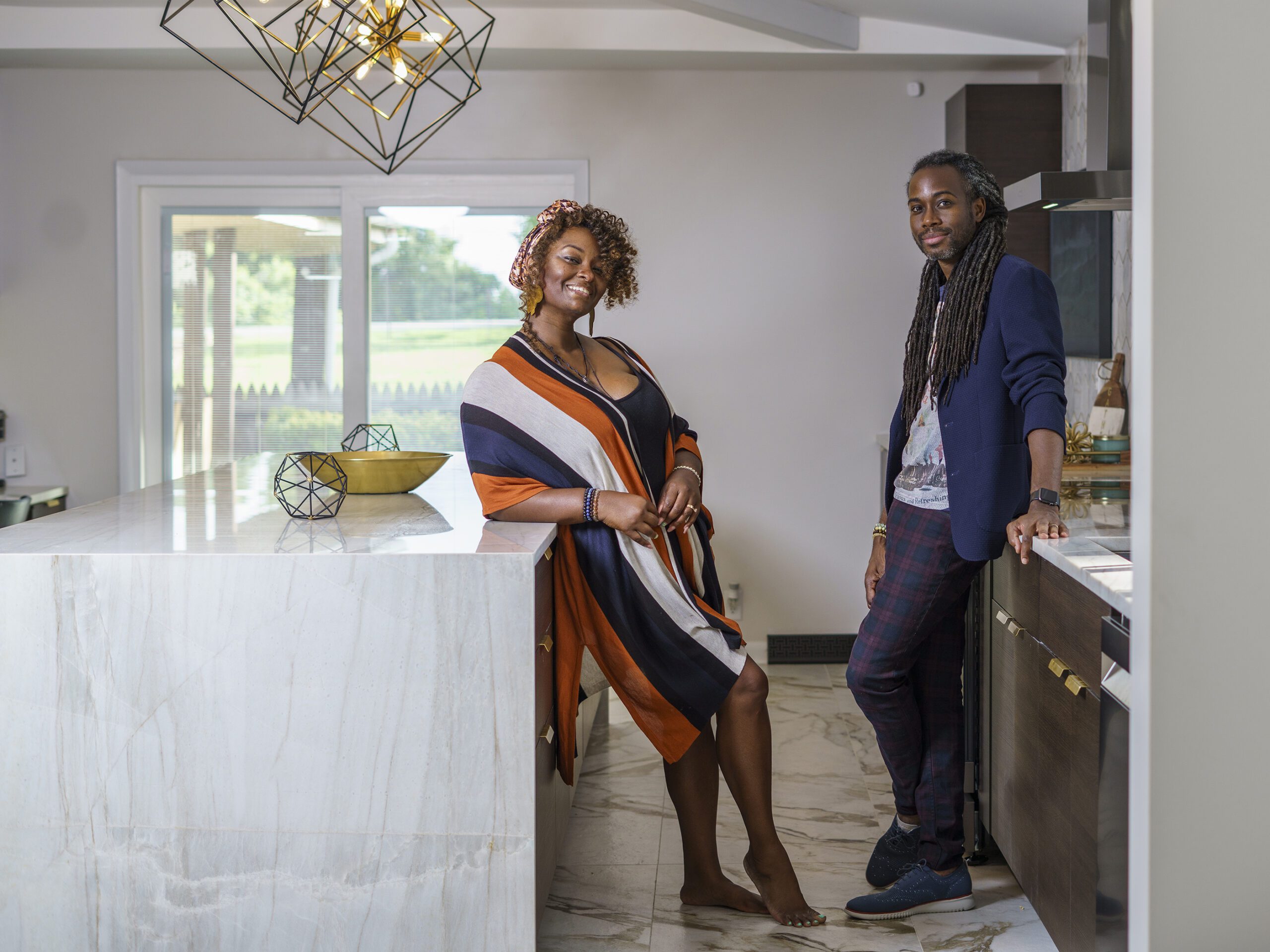 Victoria Morgan, of Haven’s Hollow Interiors, stepped in to take over the myriad decisions needed to finish out the house and to coordinate with the builder, who now is a continued client. The approach was to create a livable, comfortable and functionable home for the family of four. While the home doesn’t have a classic mid-century aesthetic, it embraces many of the tenets of the era—large windows that invite in nature, a more open, social plan and efficient use of space. They now love to entertain, hang out in the backyard hammock, and lounge in the sun-soaked living room. The living room’s large windows are oriented toward the west, providing sunset views and rays of golden afternoon light—something that the family loves taking in together at the end of their days filled with learning and working from home. “It fills me with joy just living in this house,” Eric said. Also important to the Capeharts was the spirit of the home. “When you walk in, we wanted it to feel like a Black family lives here.” Art from Black artists, including works by Shabazz Larkin, hang on the walls, and the office houses a library of African American writers. Capehart describes the style as an “Afro-bohemian vibe.” They painted the exterior a deeply saturated dark tone, and “The Black House” has taken on a personality of its own.