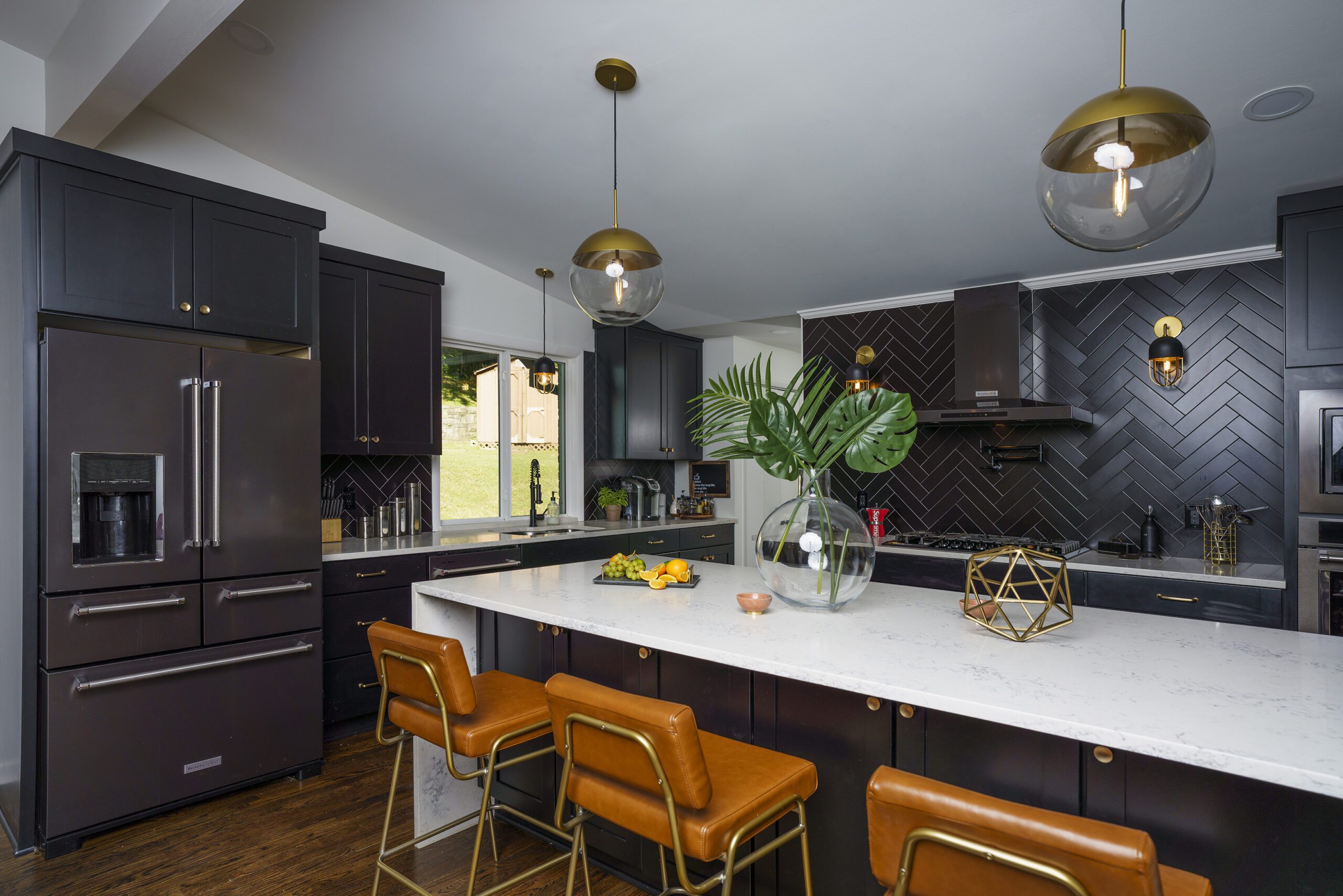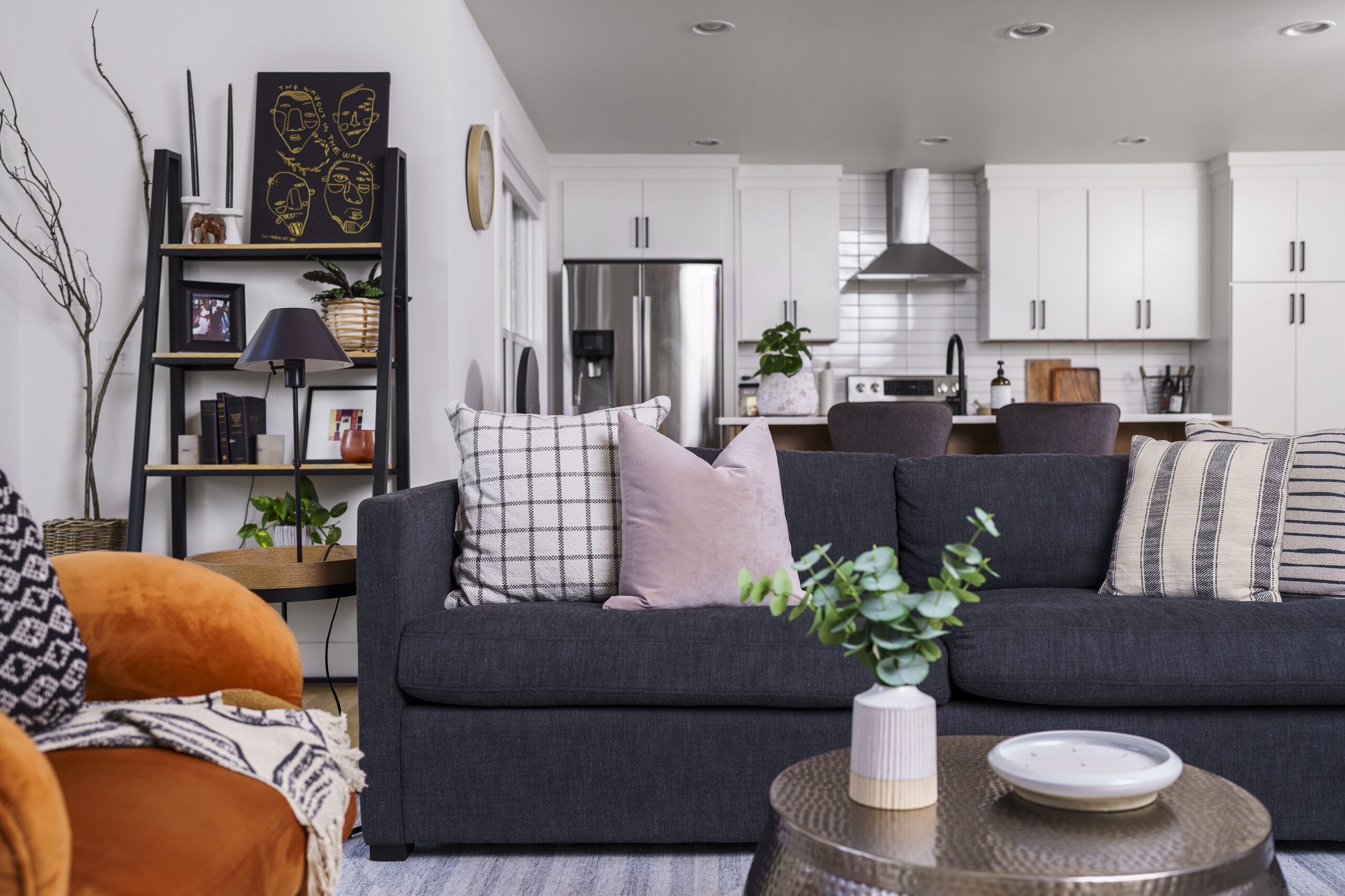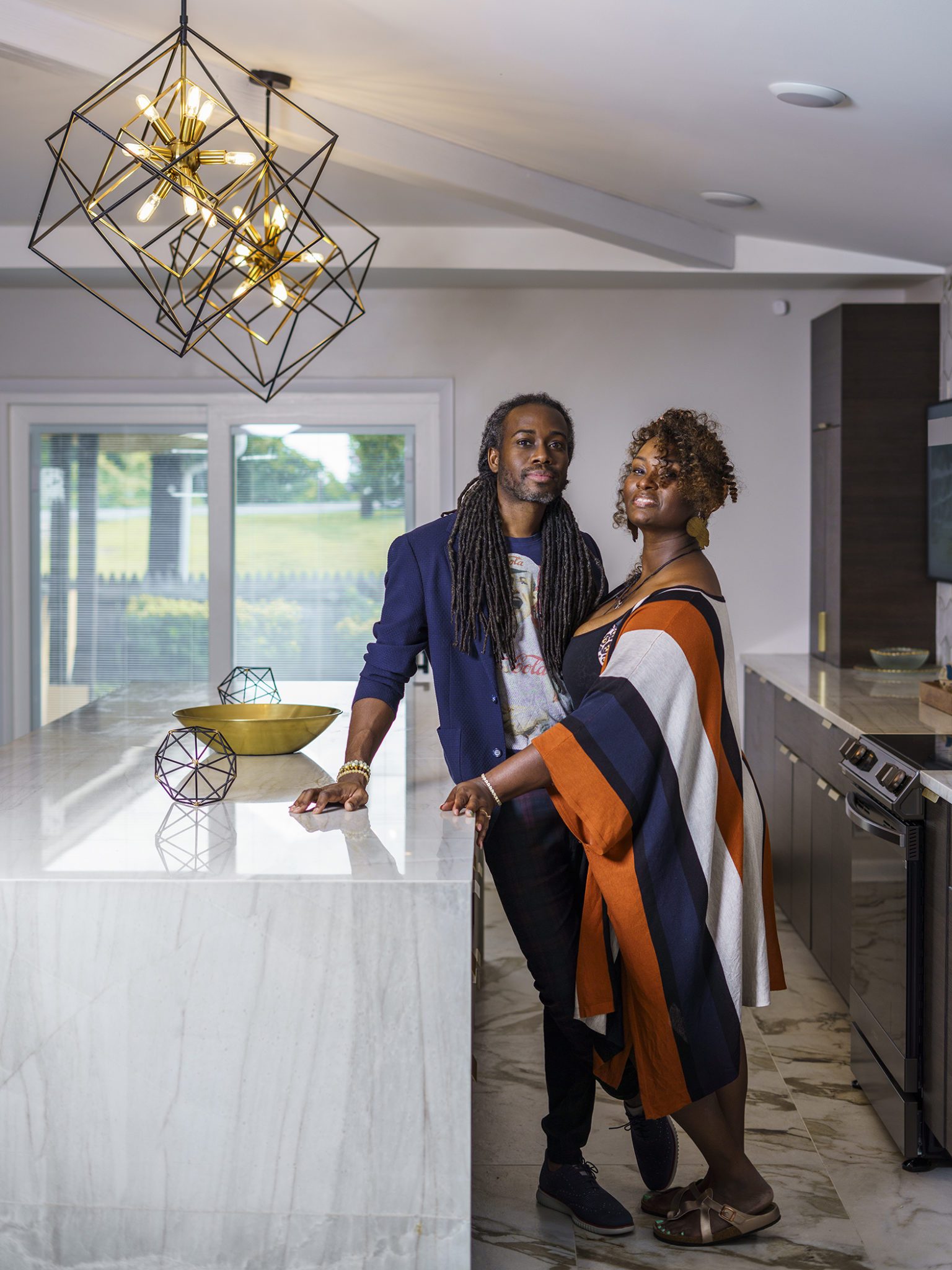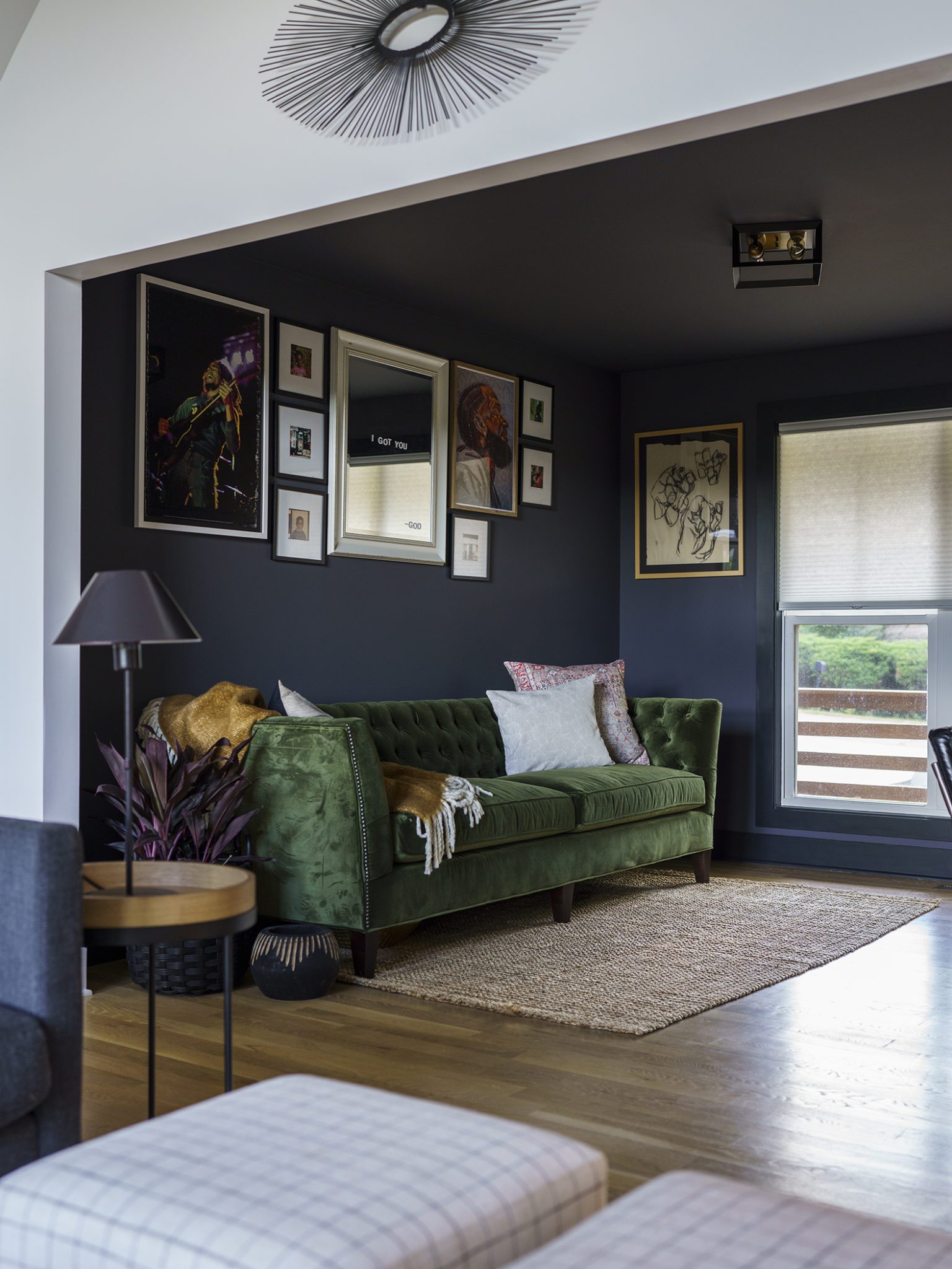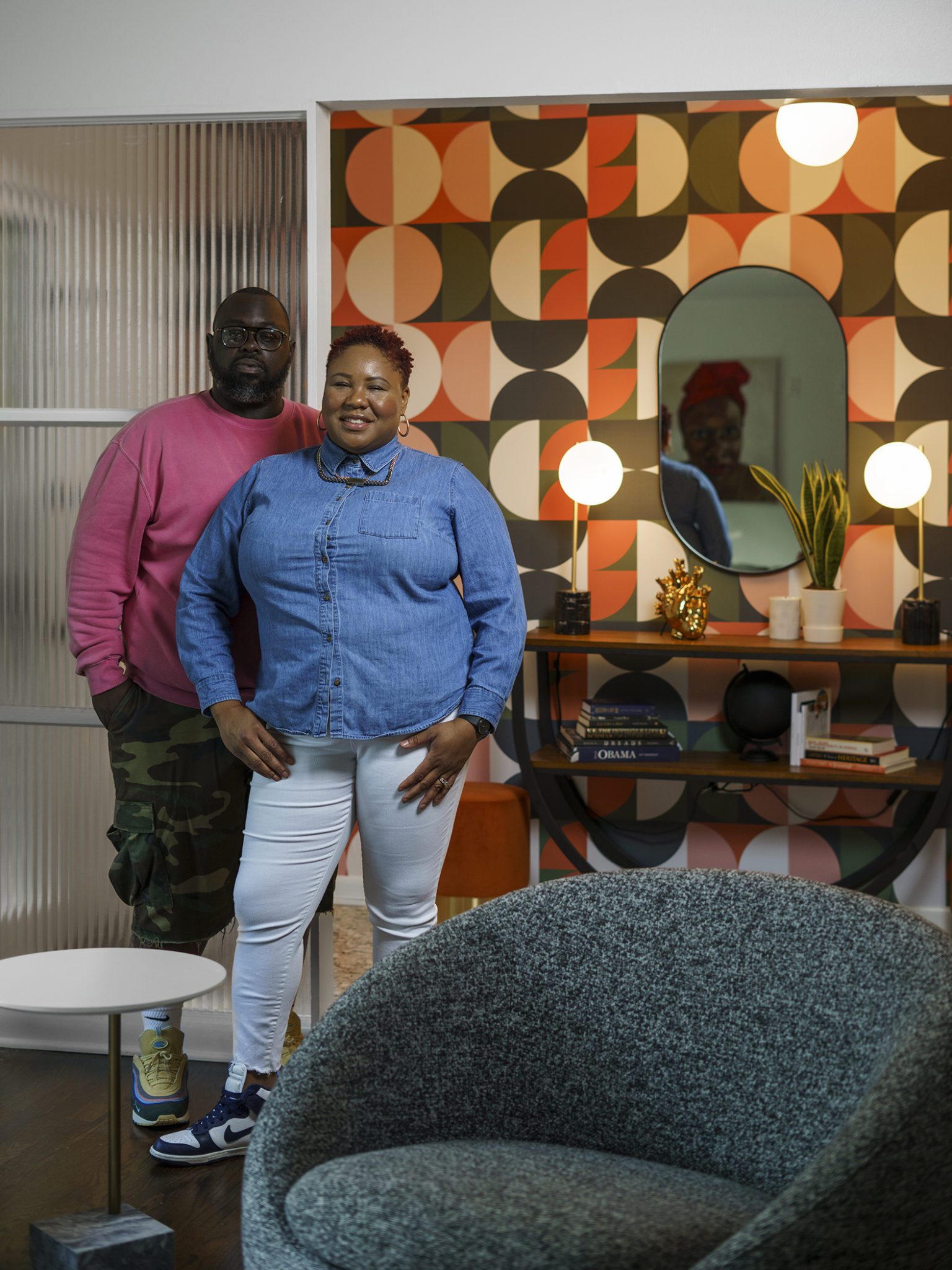 Victoria Morgan, of Haven’s Hollow Interiors, stepped in to take over the myriad decisions needed to finish out the house and to coordinate with the builder, who now is a continued client. The approach was to create a livable, comfortable and functionable home for the family of four. While the home doesn’t have a classic mid-century aesthetic, it embraces many of the tenets of the era—large windows that invite in nature, a more open, social plan and efficient use of space. They now love to entertain, hang out in the backyard hammock, and lounge in the sun-soaked living room. The living room’s large windows are oriented toward the west, providing sunset views and rays of golden afternoon light—something that the family loves taking in together at the end of their days filled with learning and working from home. “It fills me with joy just living in this house,” Eric said. Also important to the Capeharts was the spirit of the home. “When you walk in, we wanted it to feel like a Black family lives here.” Art from Black artists, including works by Shabazz Larkin, hang on the walls, and the office houses a library of African American writers. Capehart describes the style as an “Afro-bohemian vibe.” They painted the exterior a deeply saturated dark tone, and “The Black House” has taken on a personality of its own.