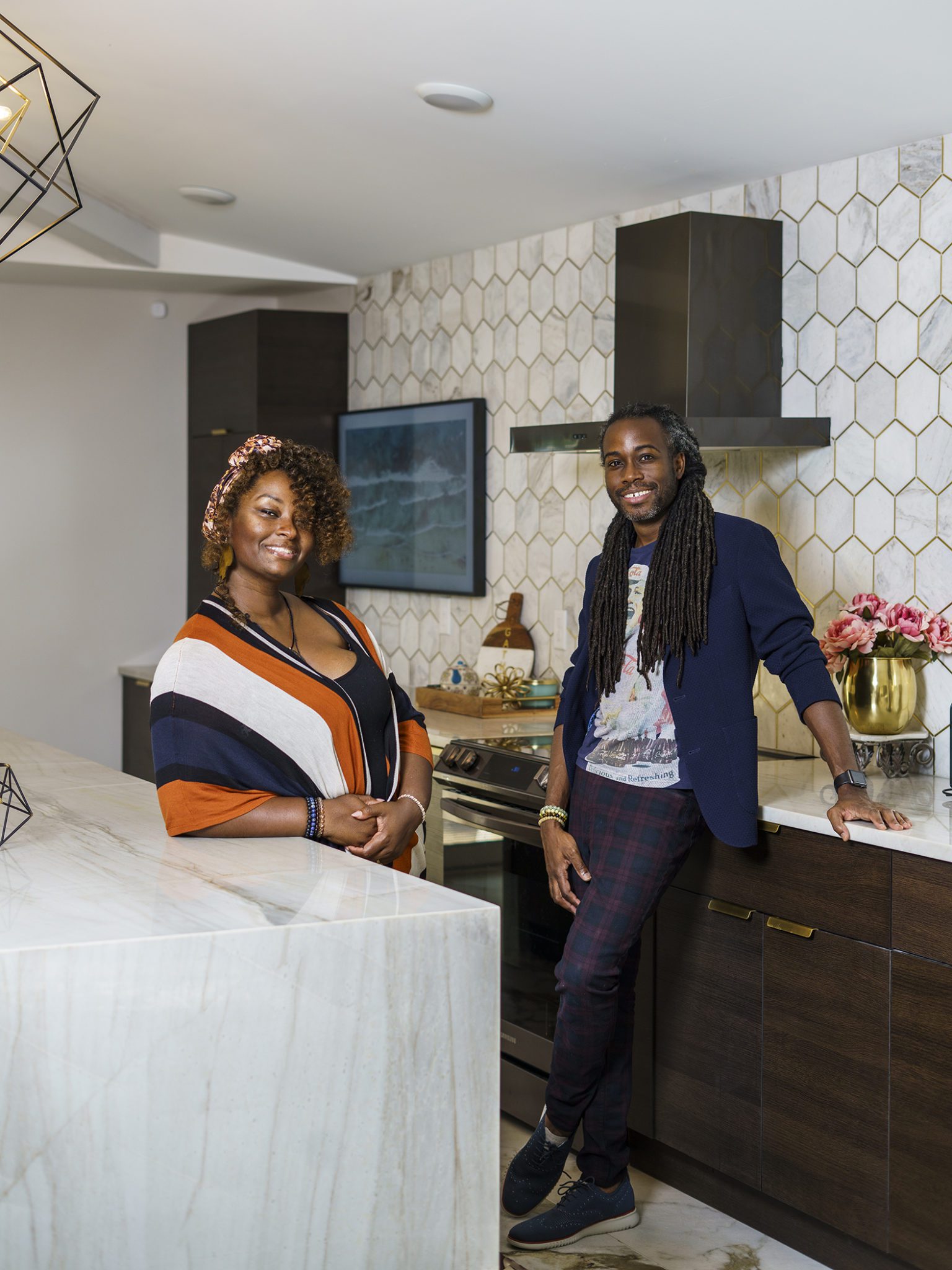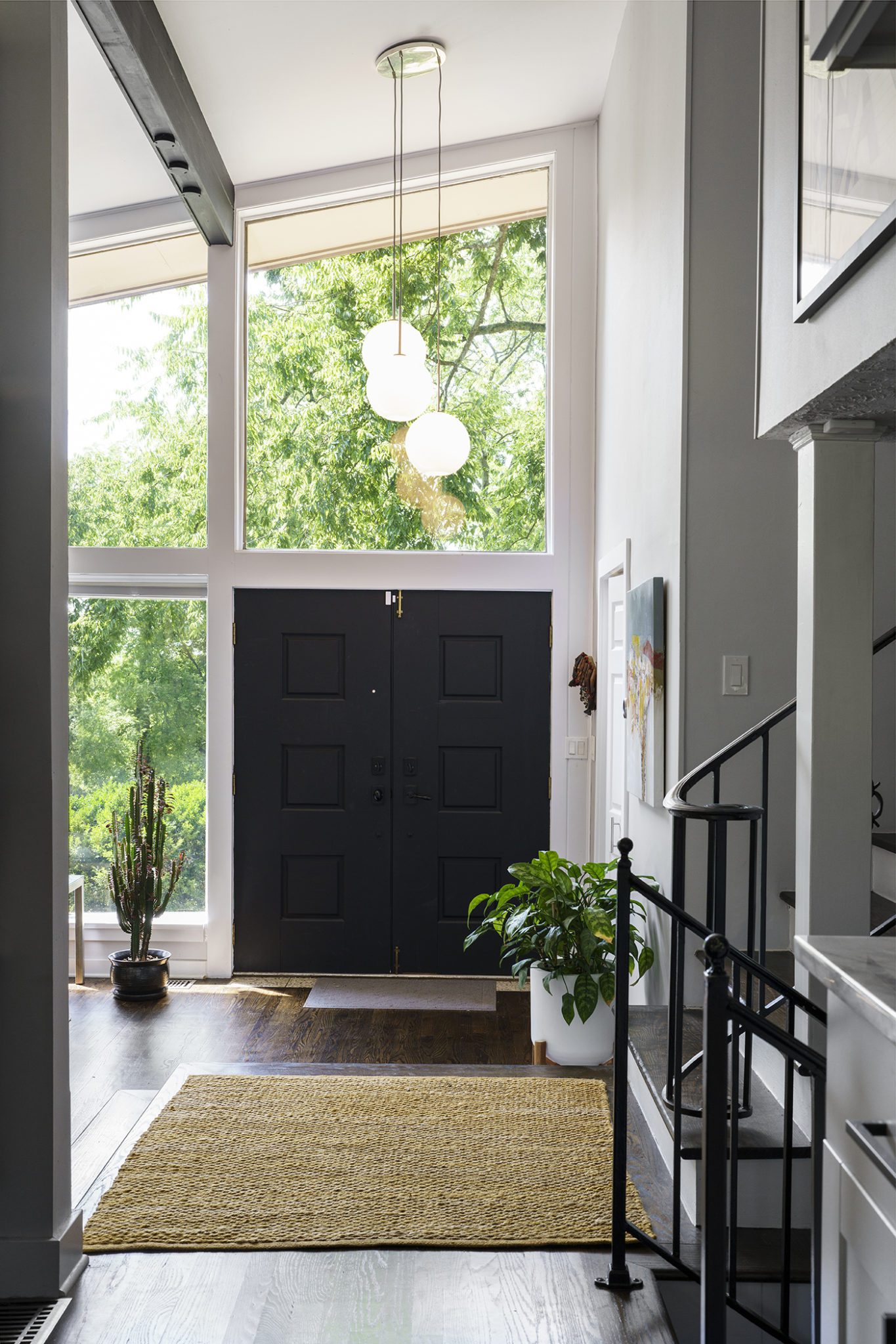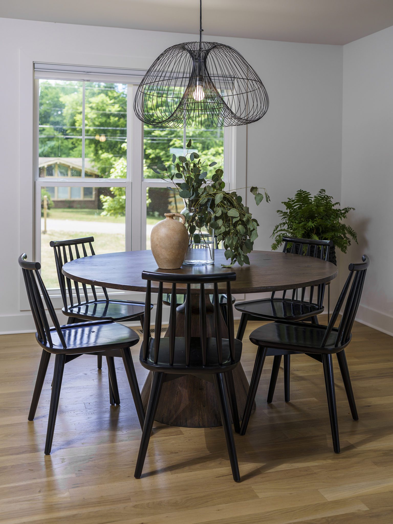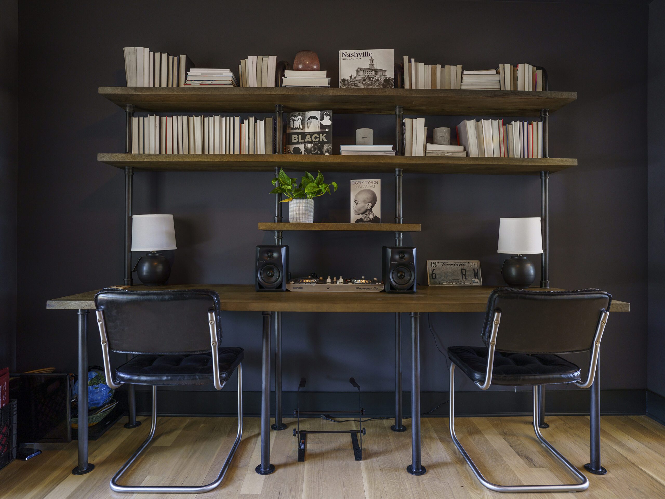 Victoria Morgan, of Haven’s Hollow Interiors, stepped in to take over the myriad decisions needed to finish out the house and to coordinate with the builder, who now is a continued client. The approach was to create a livable, comfortable and functionable home for the family of four. While the home doesn’t have a classic mid-century aesthetic, it embraces many of the tenets of the era—large windows that invite in nature, a more open, social plan and efficient use of space. They now love to entertain, hang out in the backyard hammock, and lounge in the sun-soaked living room. The living room’s large windows are oriented toward the west, providing sunset views and rays of golden afternoon light—something that the family loves taking in together at the end of their days filled with learning and working from home. “It fills me with joy just living in this house,” Eric said. Also important to the Capeharts was the spirit of the home. “When you walk in, we wanted it to feel like a Black family lives here.” Art from Black artists, including works by Shabazz Larkin, hang on the walls, and the office houses a library of African American writers. Capehart describes the style as an “Afro-bohemian vibe.” They painted the exterior a deeply saturated dark tone, and “The Black House” has taken on a personality of its own.