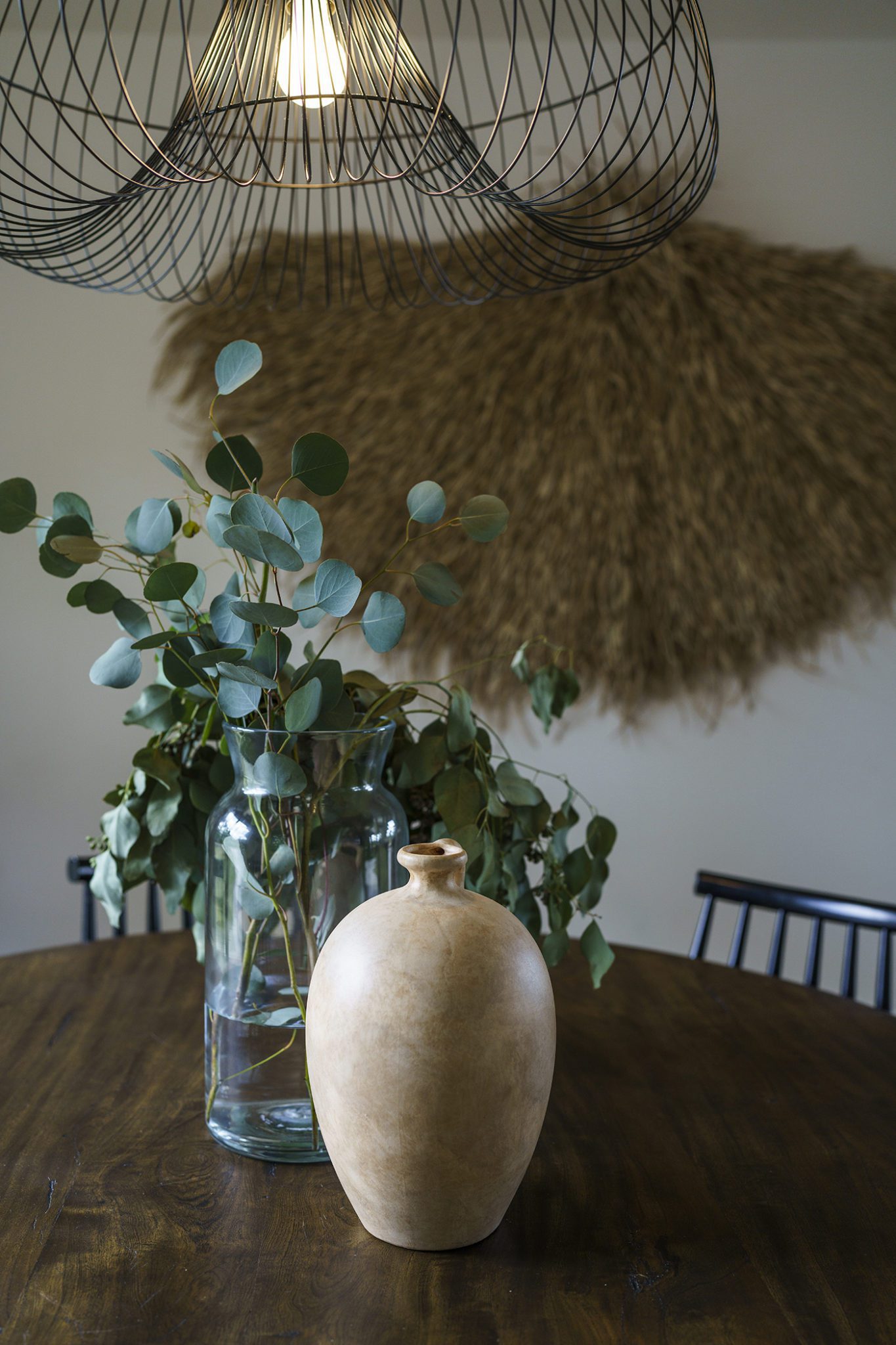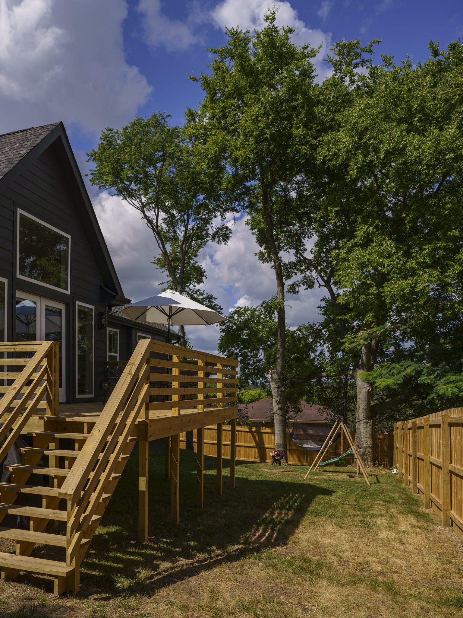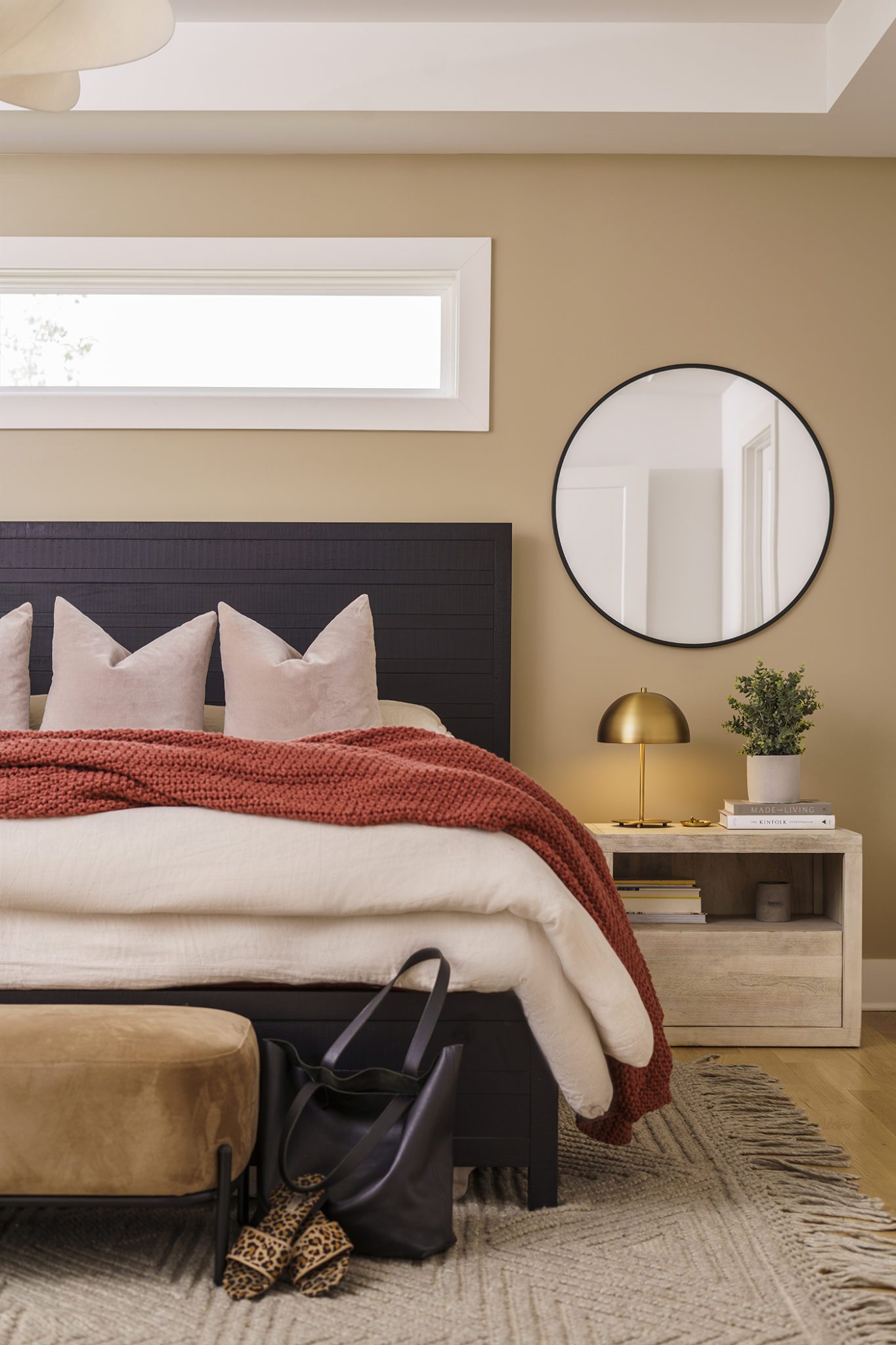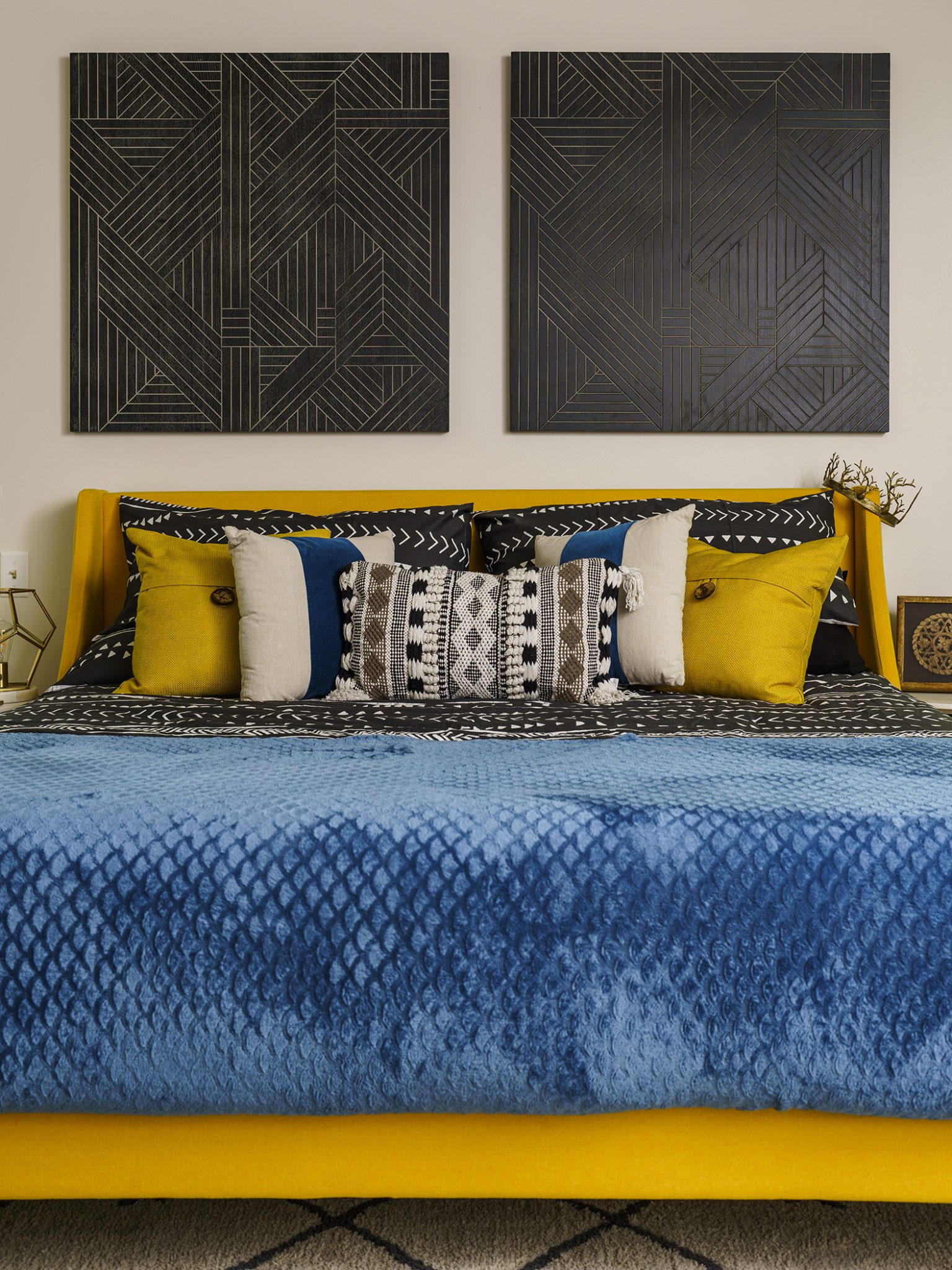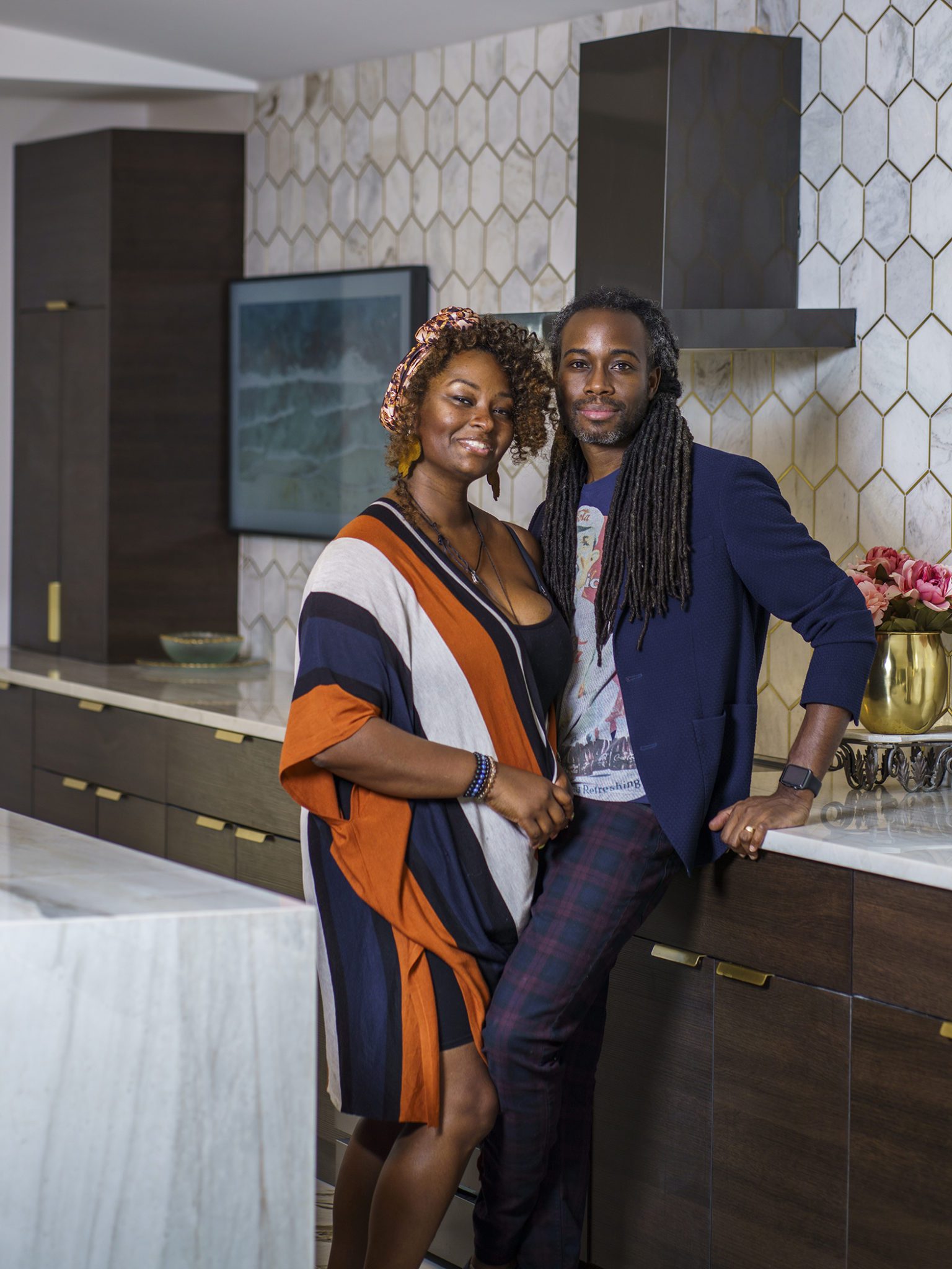 Victoria Morgan, of Haven’s Hollow Interiors, stepped in to take over the myriad decisions needed to finish out the house and to coordinate with the builder, who now is a continued client. The approach was to create a livable, comfortable and functionable home for the family of four. While the home doesn’t have a classic mid-century aesthetic, it embraces many of the tenets of the era—large windows that invite in nature, a more open, social plan and efficient use of space. They now love to entertain, hang out in the backyard hammock, and lounge in the sun-soaked living room. The living room’s large windows are oriented toward the west, providing sunset views and rays of golden afternoon light—something that the family loves taking in together at the end of their days filled with learning and working from home. “It fills me with joy just living in this house,” Eric said. Also important to the Capeharts was the spirit of the home. “When you walk in, we wanted it to feel like a Black family lives here.” Art from Black artists, including works by Shabazz Larkin, hang on the walls, and the office houses a library of African American writers. Capehart describes the style as an “Afro-bohemian vibe.” They painted the exterior a deeply saturated dark tone, and “The Black House” has taken on a personality of its own.