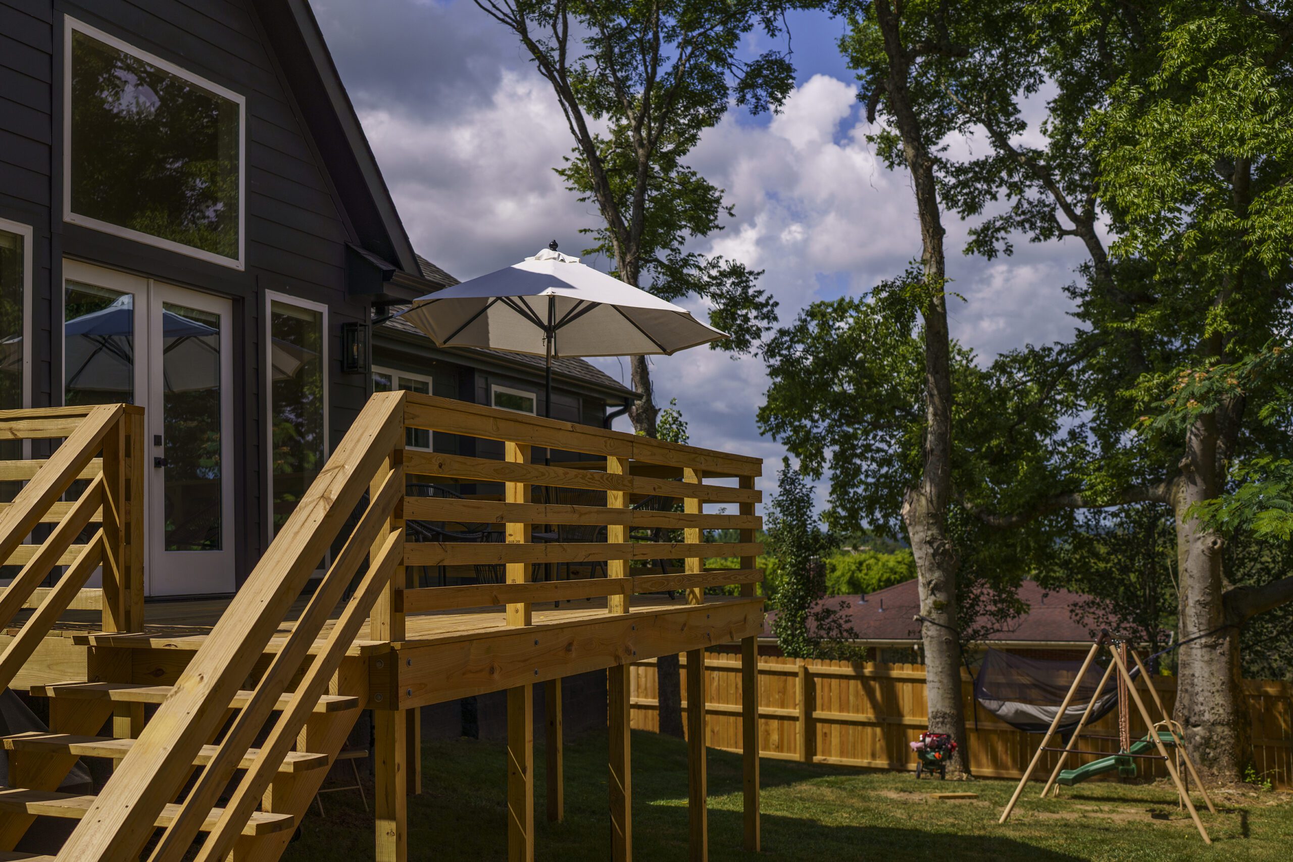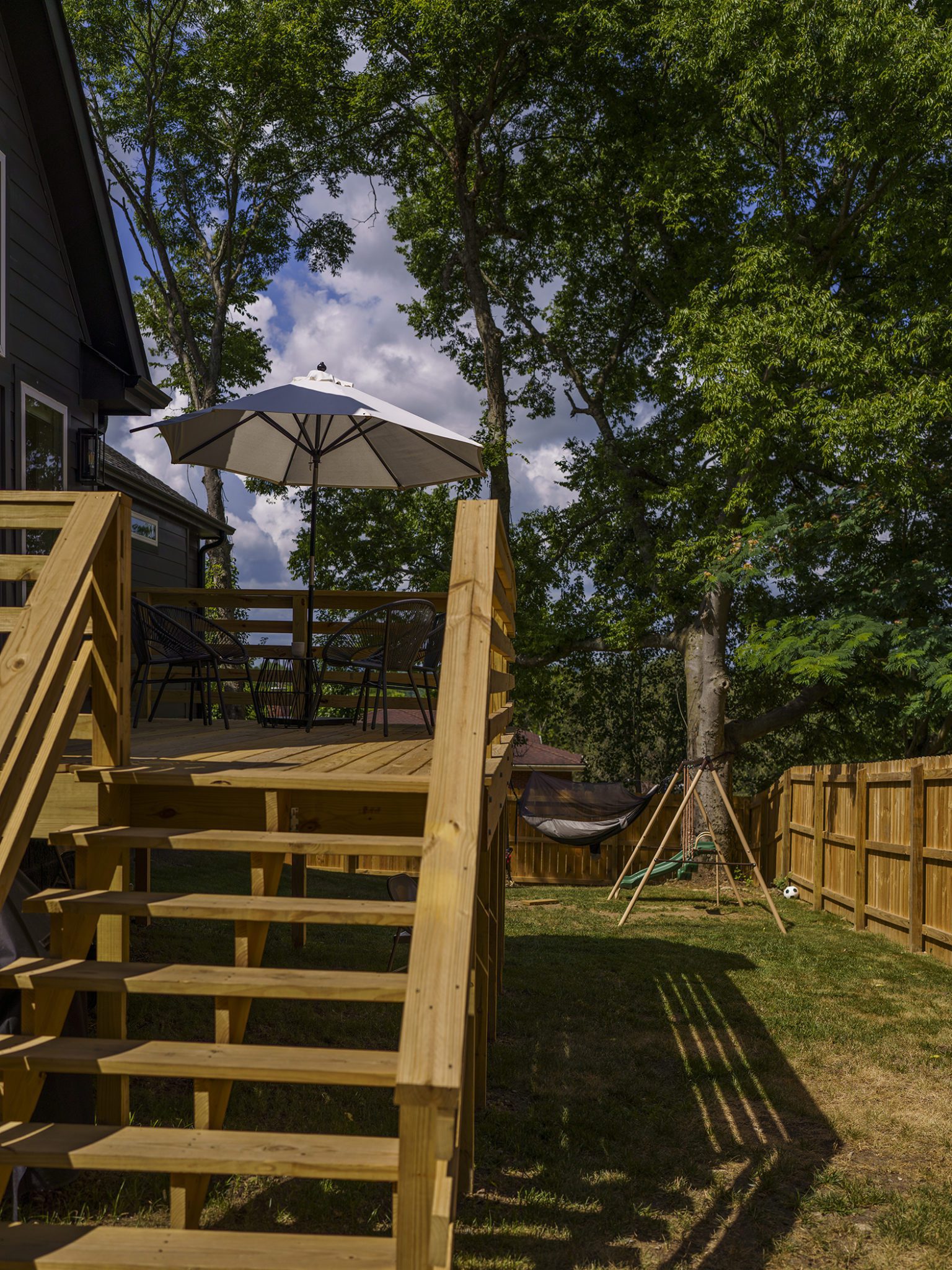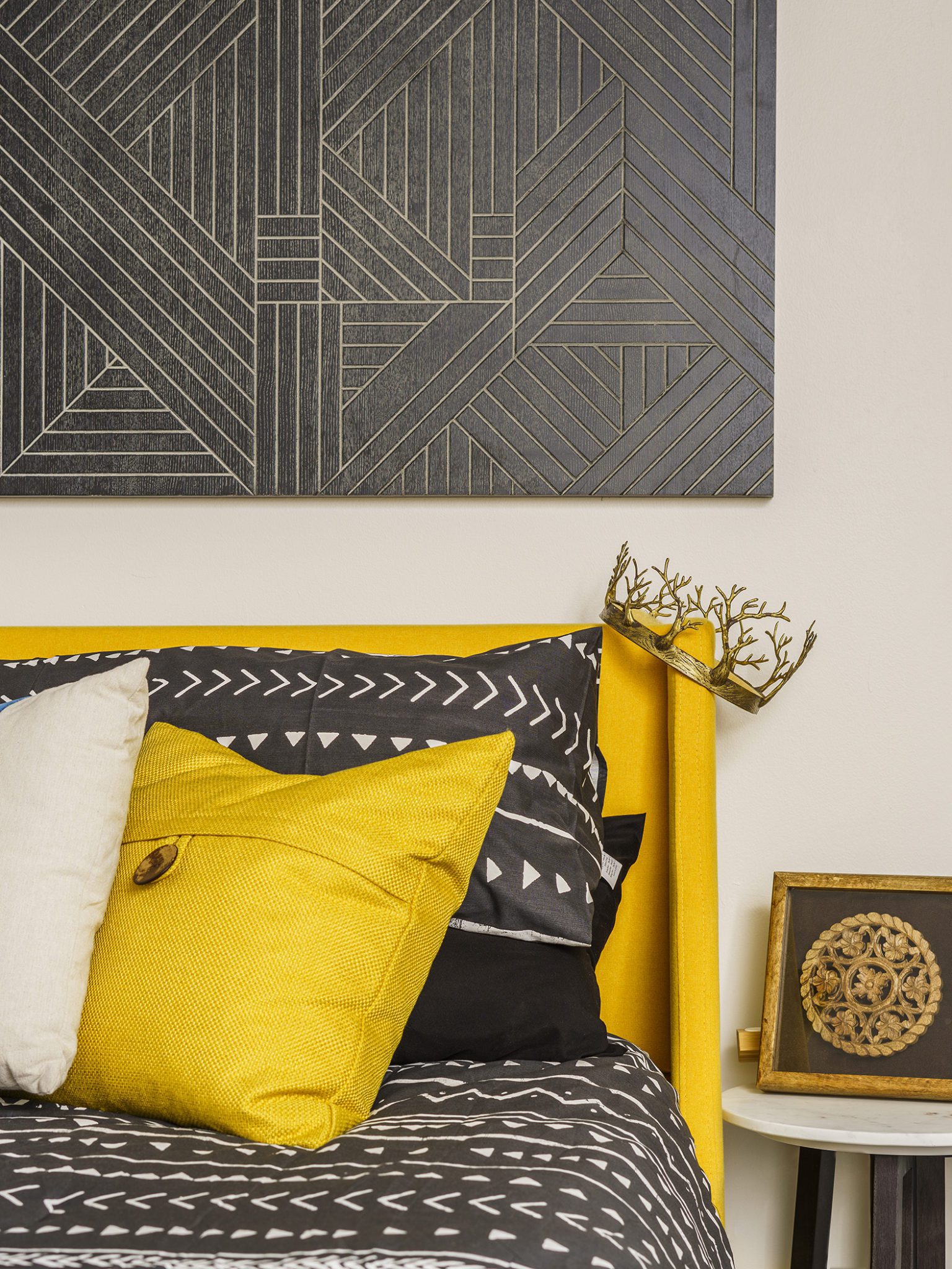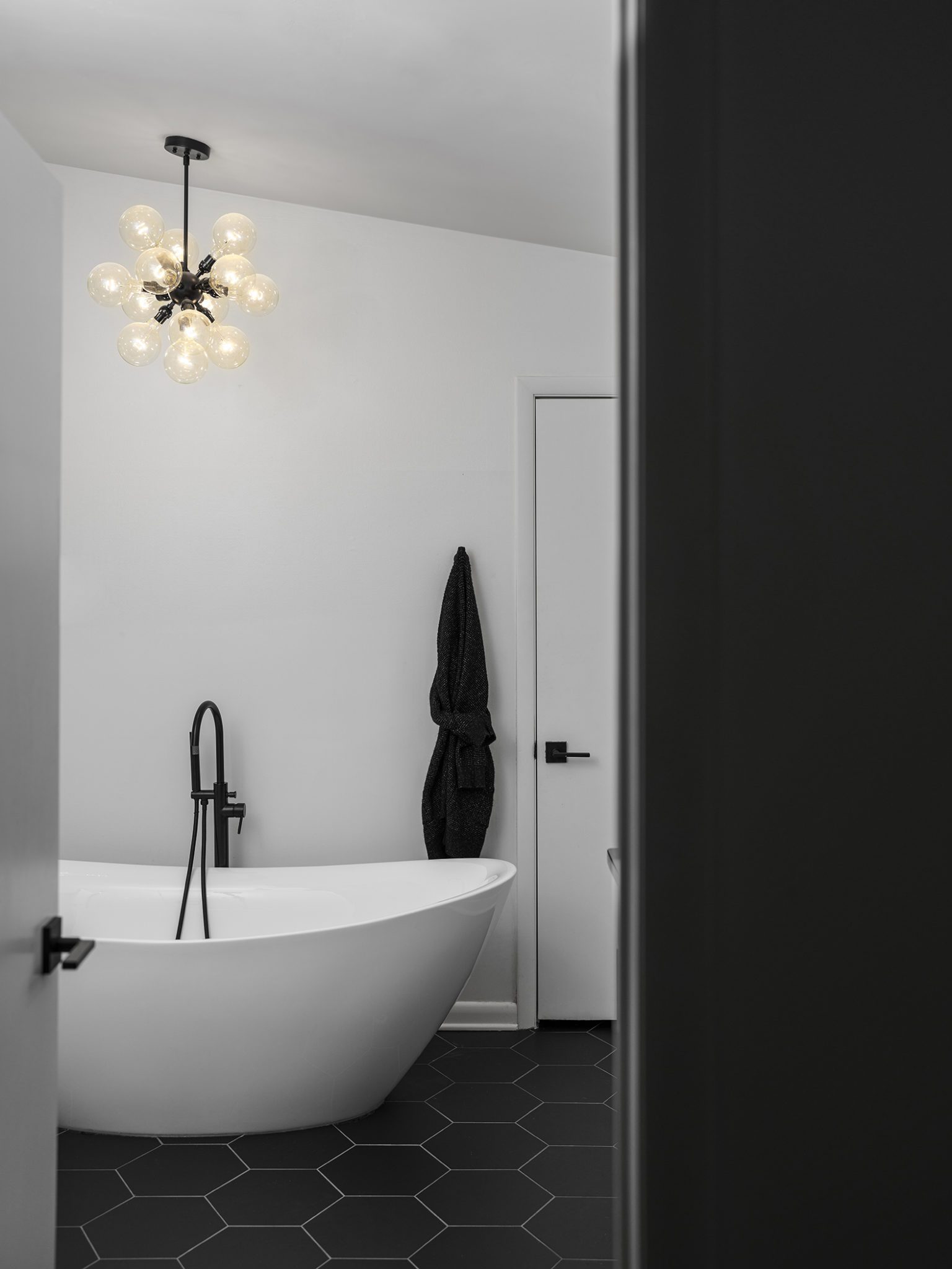 Victoria Morgan, of Haven’s Hollow Interiors, stepped in to take over the myriad decisions needed to finish out the house and to coordinate with the builder, who now is a continued client. The approach was to create a livable, comfortable and functionable home for the family of four. While the home doesn’t have a classic mid-century aesthetic, it embraces many of the tenets of the era—large windows that invite in nature, a more open, social plan and efficient use of space. They now love to entertain, hang out in the backyard hammock, and lounge in the sun-soaked living room. The living room’s large windows are oriented toward the west, providing sunset views and rays of golden afternoon light—something that the family loves taking in together at the end of their days filled with learning and working from home. “It fills me with joy just living in this house,” Eric said. Also important to the Capeharts was the spirit of the home. “When you walk in, we wanted it to feel like a Black family lives here.” Art from Black artists, including works by Shabazz Larkin, hang on the walls, and the office houses a library of African American writers. Capehart describes the style as an “Afro-bohemian vibe.” They painted the exterior a deeply saturated dark tone, and “The Black House” has taken on a personality of its own.