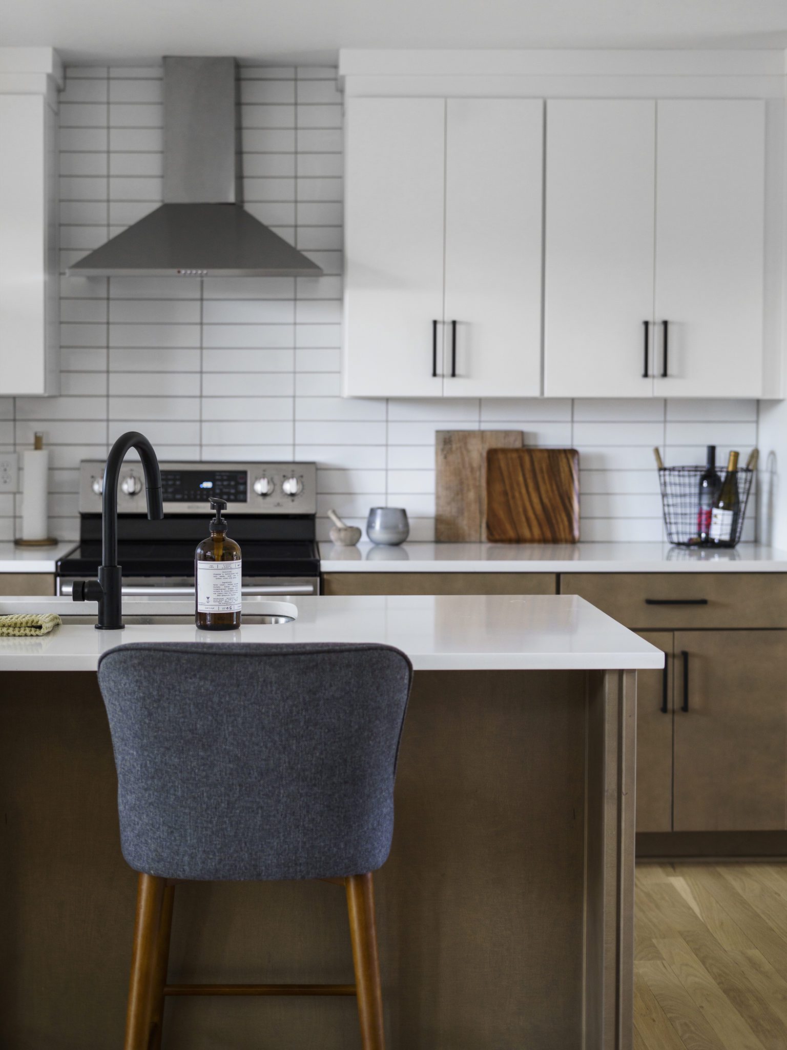 An opportunity arose to purchase the 1959 mid-century split-level home in Haynes Heights directly from the original owner, Rosemary Lewis, off market—and Capehart was there to broker the deal. The 2,800-square-foot home sits atop the 2-acre property. The long, shallow roof pitch enforces the strong horizontal lines of the house, then it dramatically butterflies over the attached open-air carport. Long, thin bricks, vertical cedar planks, glass and wrought iron make up the exterior palette. Inside the home, the primary level is organized around the original stacked brick fireplace with low-slung hearth. The living room’s large picture windows look out to the sloping yard below, giving the feeling that home is nestled in the trees. In the winter the room offers a direct view of the twinkling lights of downtown Nashville. The Moores went through a major interior renovation before moving in, working with Mitchell and Kristie Hodge for the architecture and design and Jadore Luxury Homes for the construction. The scope of work included a complete kitchen renovation, reworking the plan of the upstairs primary suite and adding in some support spaces—like a bathroom with quick access to the in-ground pool. Eric got his own closet to hold his sneaker collection, and Patience, a hair stylist specializing in curly hair at Jule Salon in Franklin, got a laundry room outfitted with a salon chair and hair washing sink.