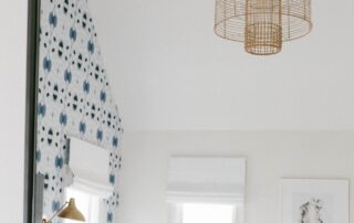 The pattern she wanted was expensive, and Crowell and the homeowners went back and forth between it and a more affordable pattern. In the end, they decided the cost was worth getting the one they loved. She then hung the window treatments way above the casings to make the small windows appear longer.