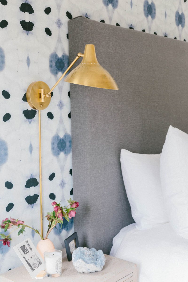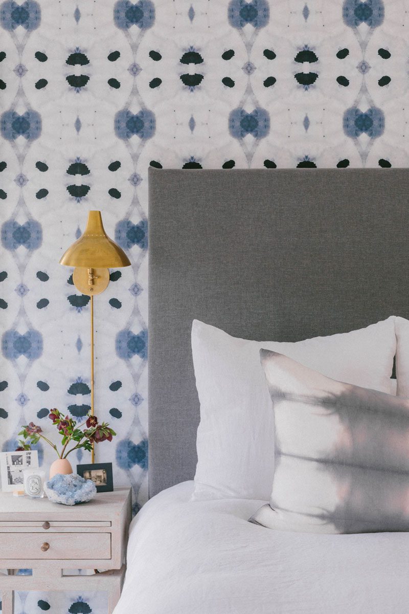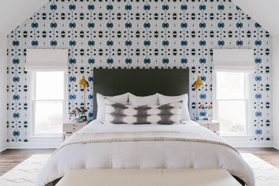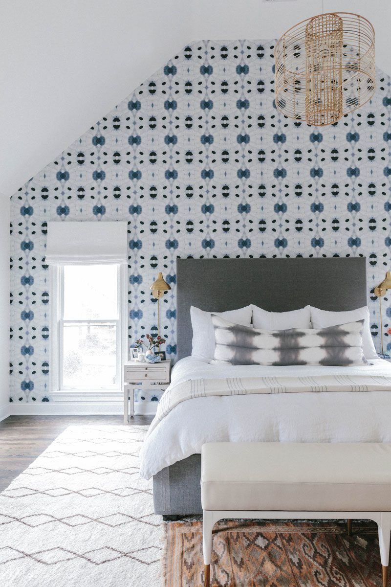 The master bedroom was a bit of an awkward space, with really high ceilings but rather anemic windows. The scale was off, so they decided to put wallpaper over one of the giant walls to detract from the oddness.