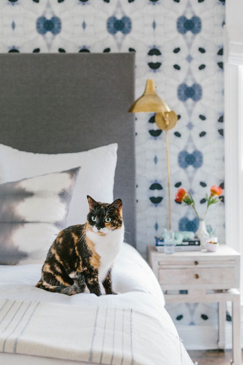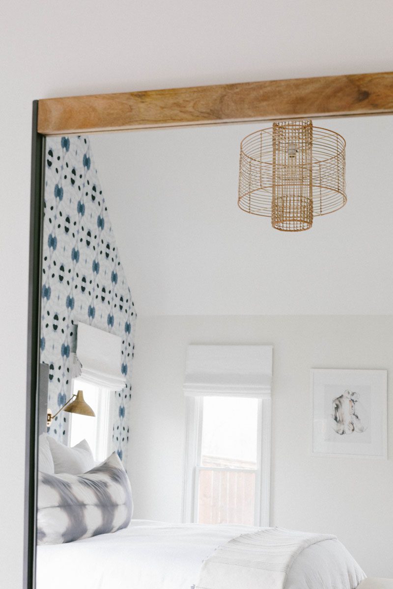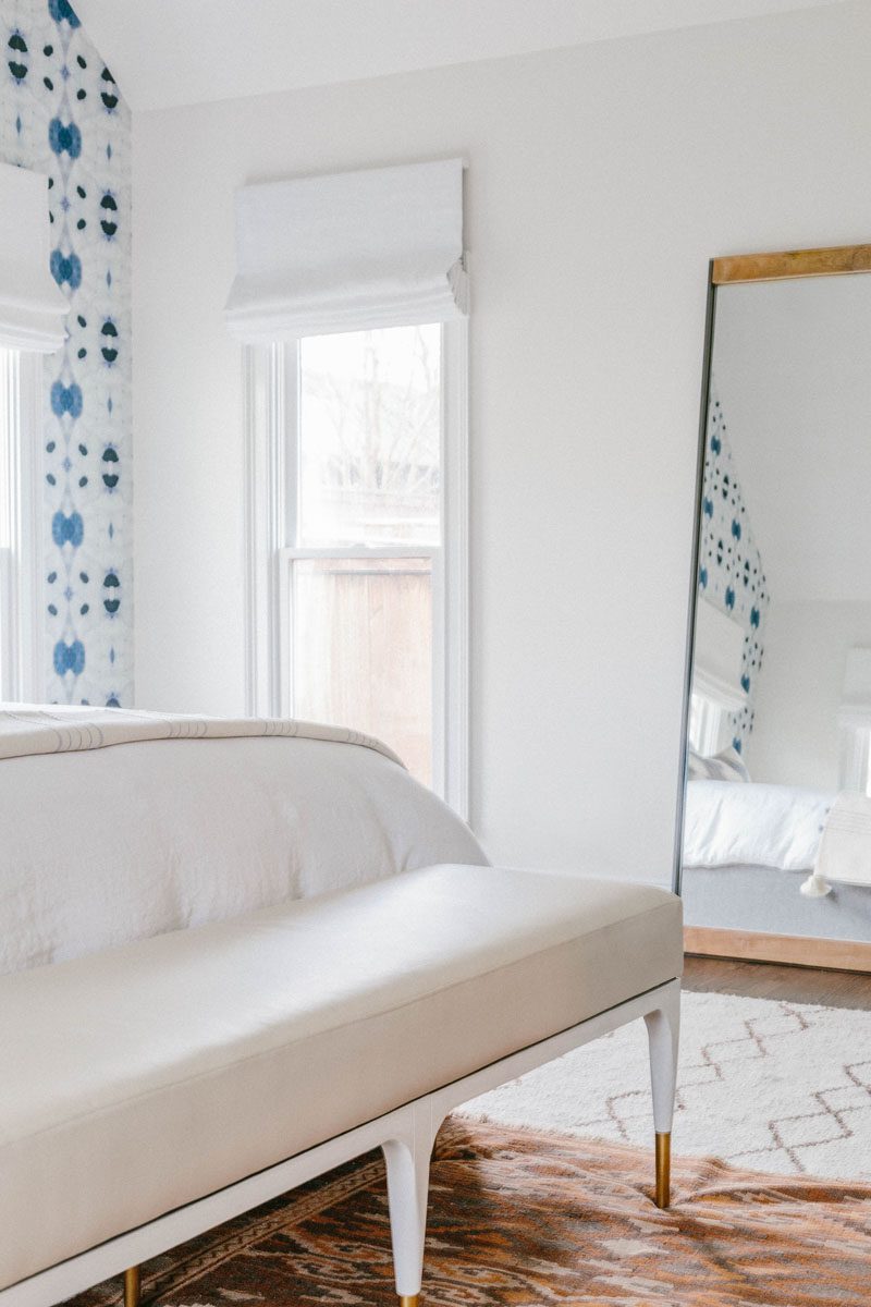 The master bedroom was a bit of an awkward space, with really high ceilings but rather anemic windows. The scale was off, so they decided to put wallpaper over one of the giant walls to detract from the oddness.