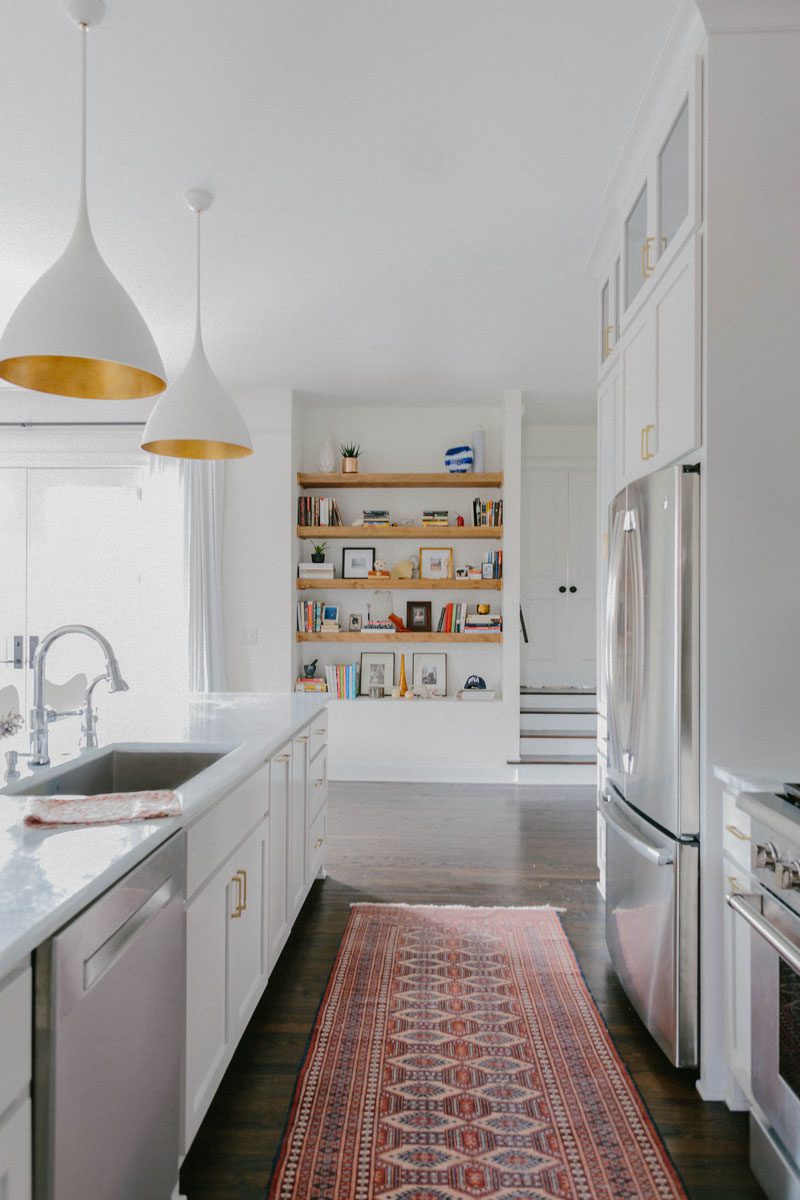 The kitchen was another gut job that included opening a wall into the family room for more flow, as well as adding a wall of windows and French doors that opened into the spacious-for-East-Nashville backyard.