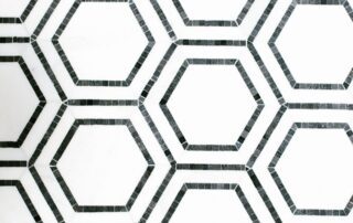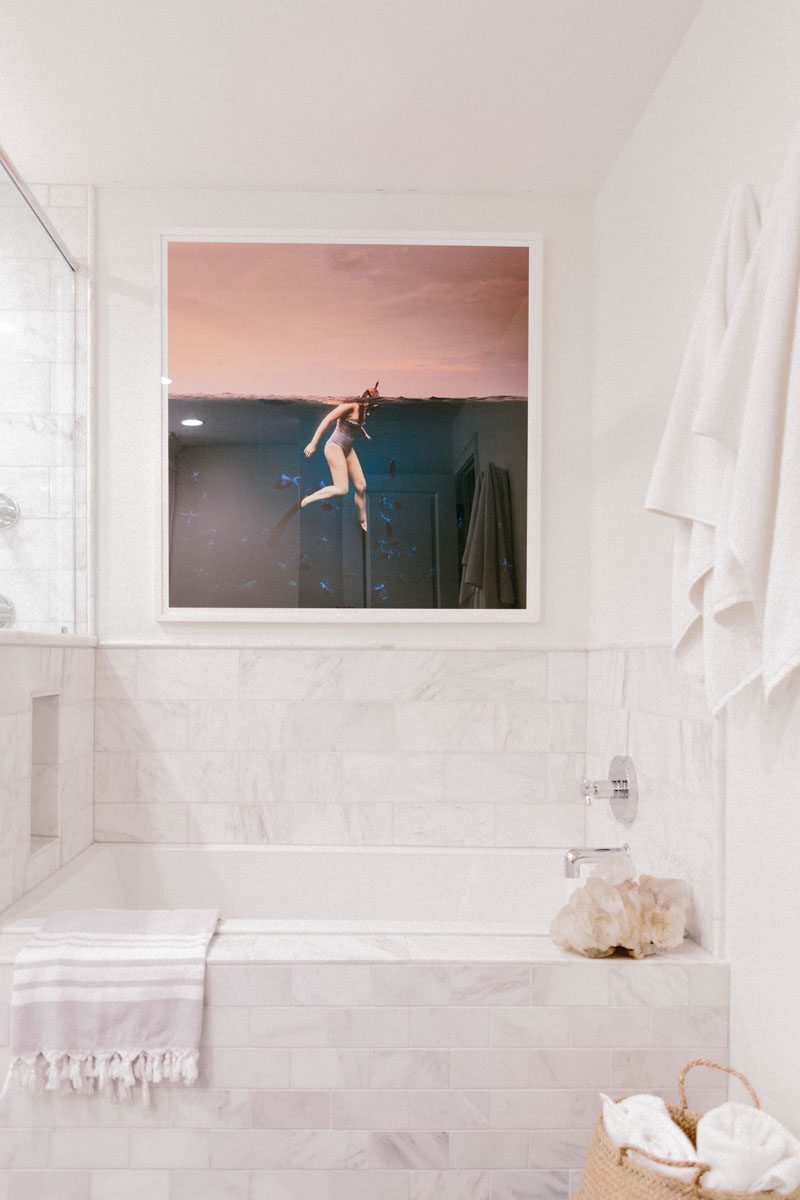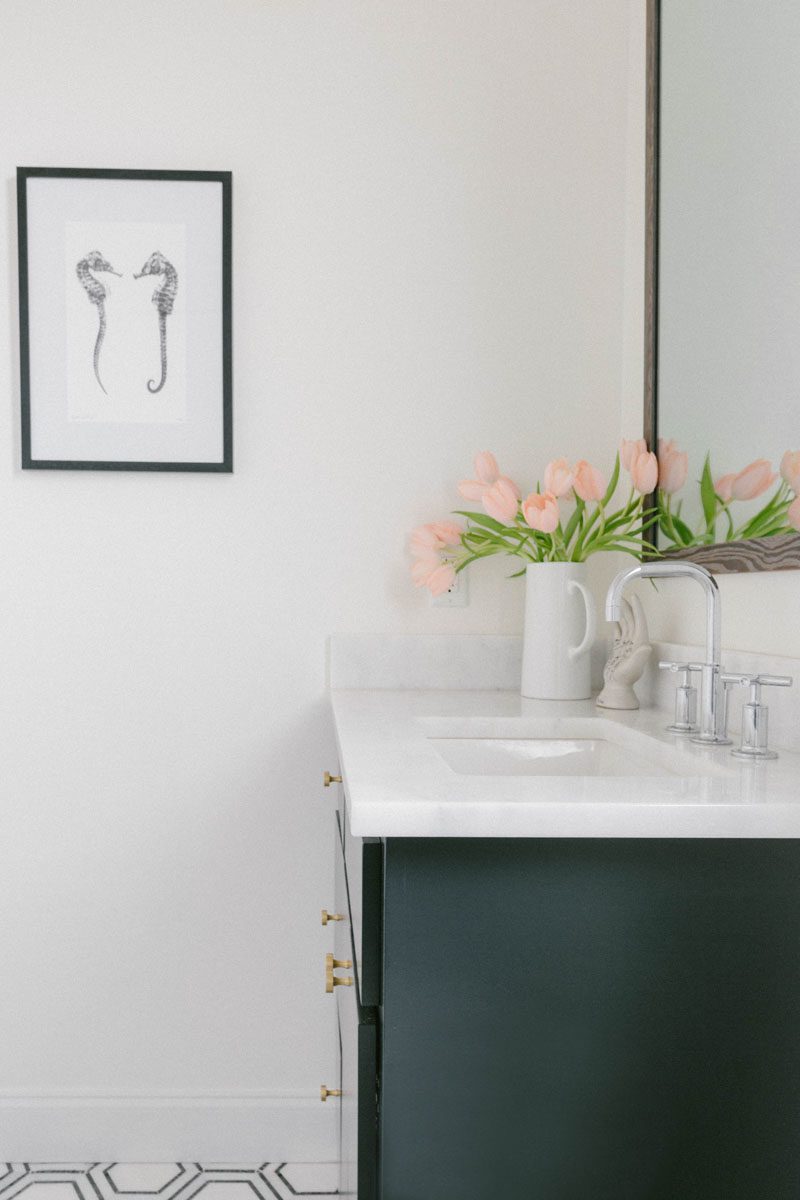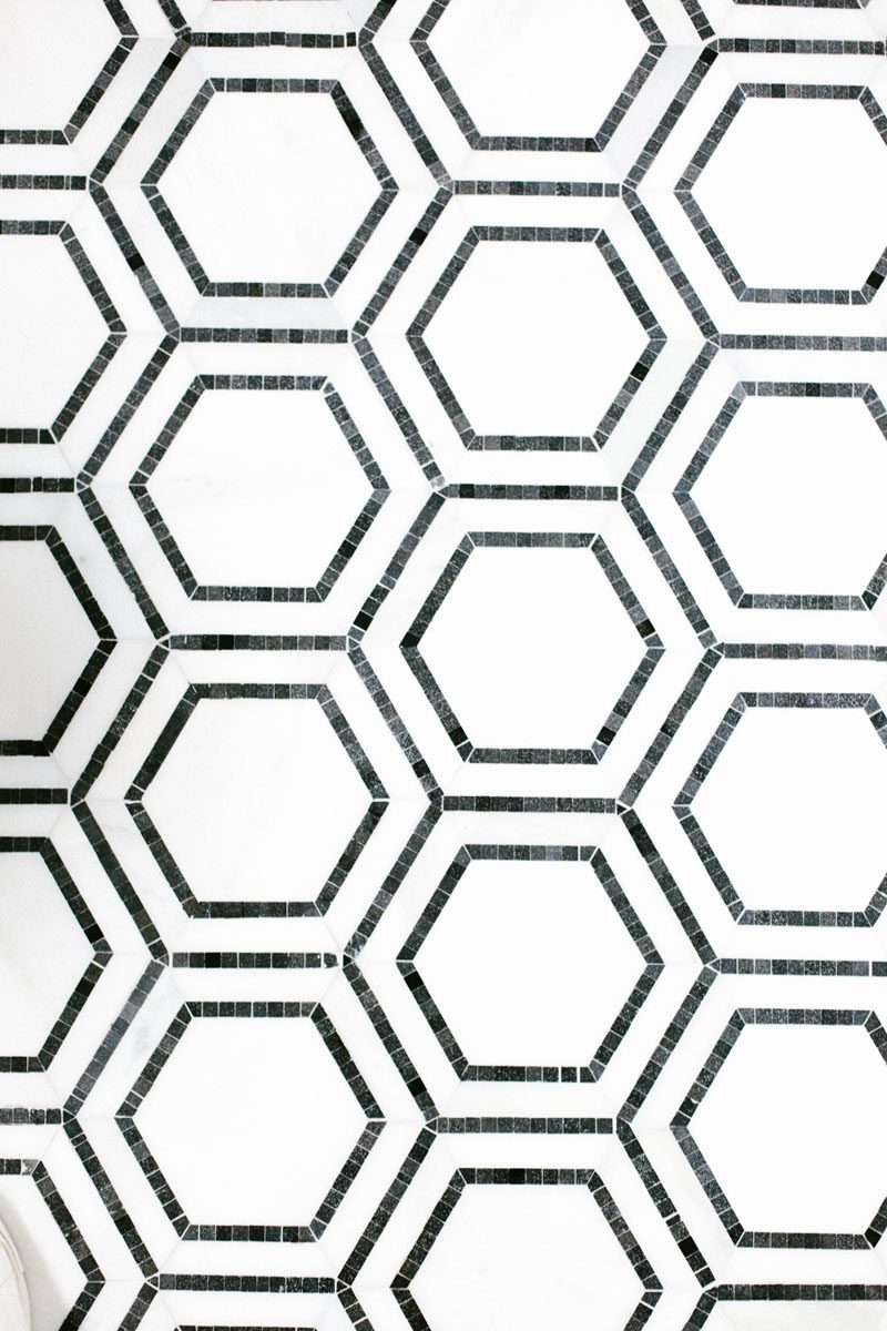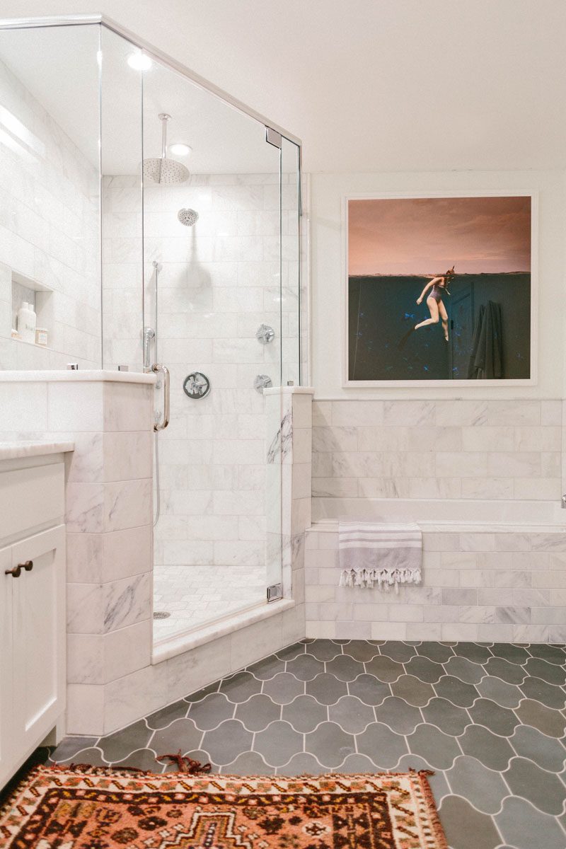 The process took about eight months to complete from start to finish, including a total gut job of the master bathroom — complete with downed walls and reconfigured pipes. The new dark tile contrasts with the light marble tub and shower, the large, patterned rug is unexpected but works to warm things up a bit.
