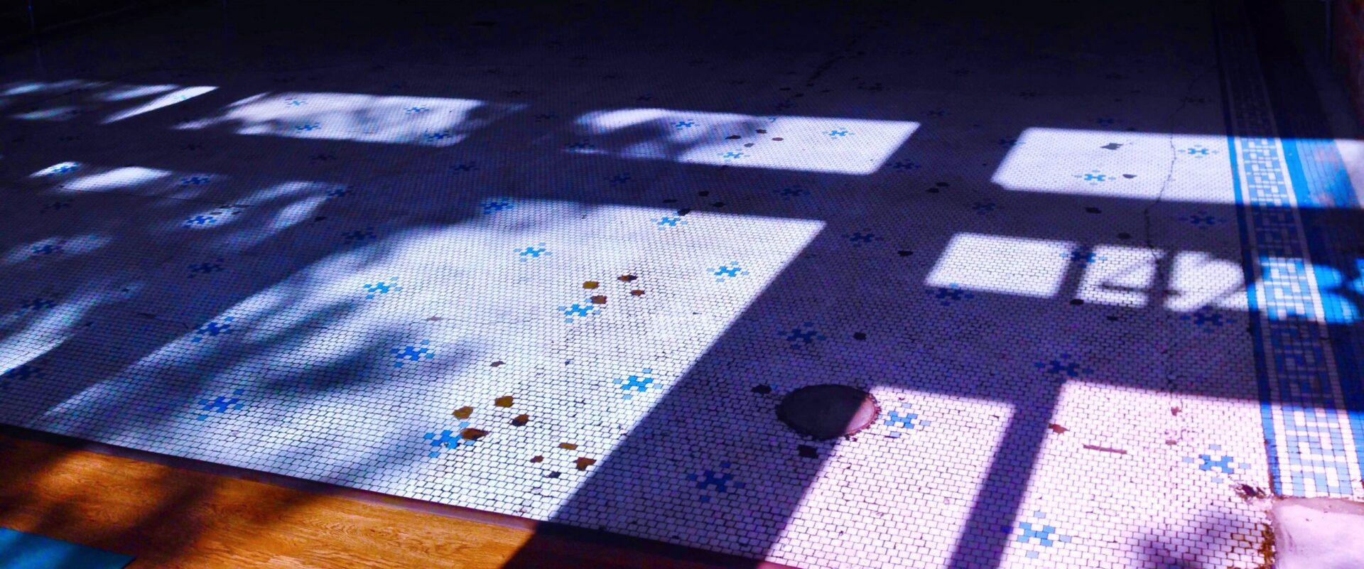 A bright blue Greek key pattern framed the room’s white tile floor. Small insets of similar blue tile added a splash of pattern. It is rare to see such a large stretch of delicate tile relatively in tact. It makes you feel hopeful when you see something that has endured use, and even neglect.