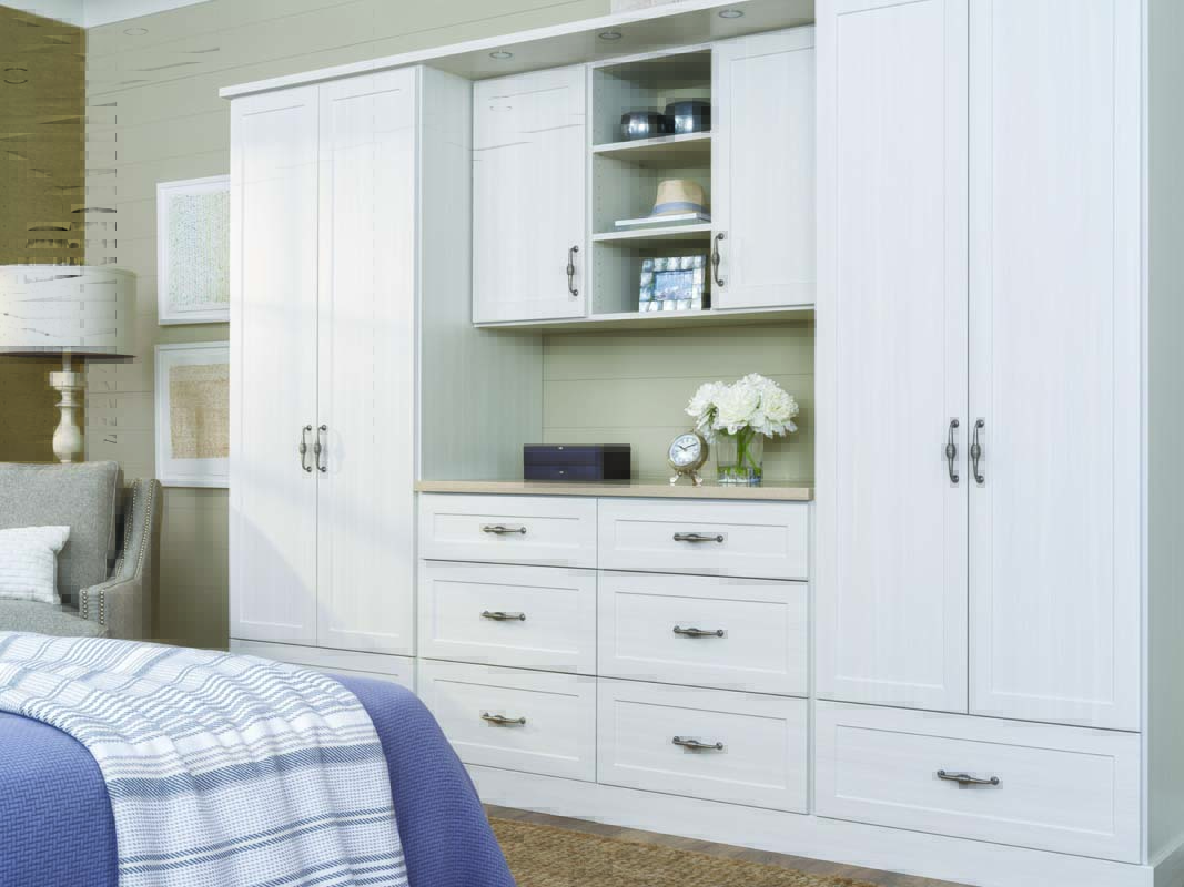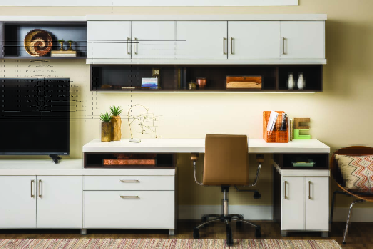 “All the condominiums and that sort of thing, their space is very limited, so we’ve done quite a few wall beds and mixed-use rooms,” Mills says. “They typically only have wire shelving, so we put in shelving and hanging space and drawers. Anything they can get that’s built-in because that’s cost saving; entertainment systems are nice because they can be small, but they’re great for storage.”