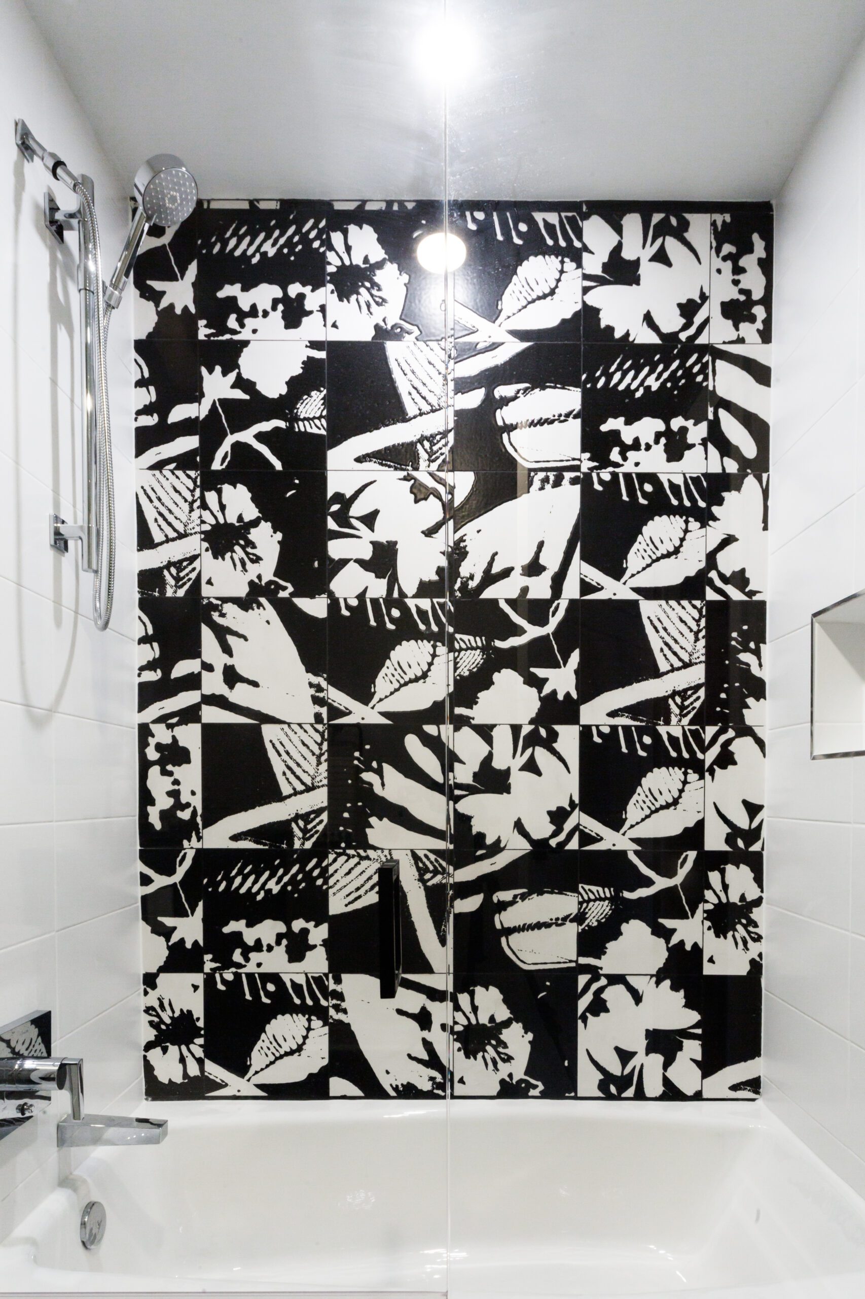 In the guest bathroom Lord fell in love with an artistic black-and-white tile and built the bold bathroom design around that.