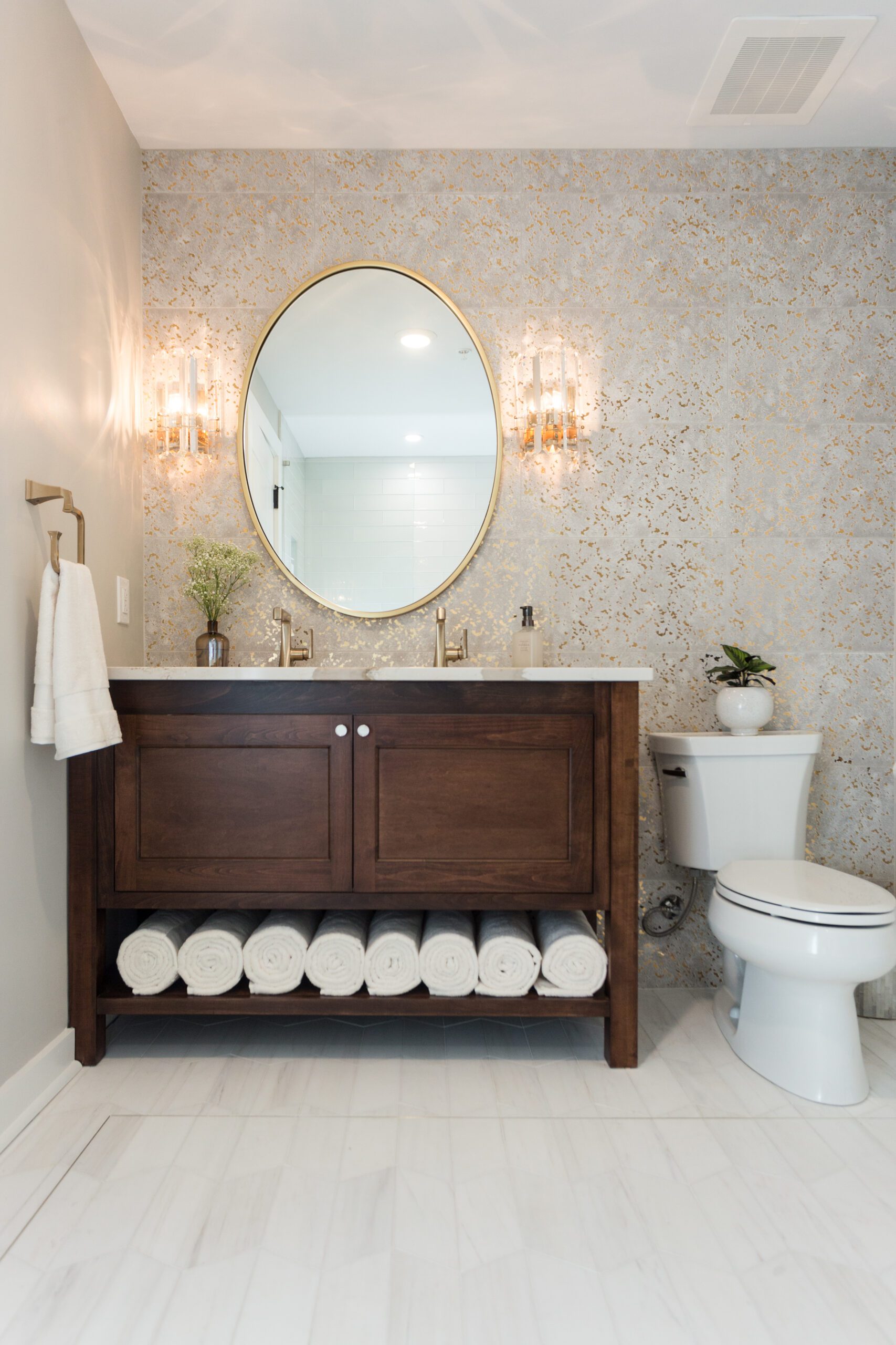 “It’s definitely a statement,” she says. “We wanted everything else in that bathroom to be stunning, but just more neutral so that vanity wall could really be the focus.”