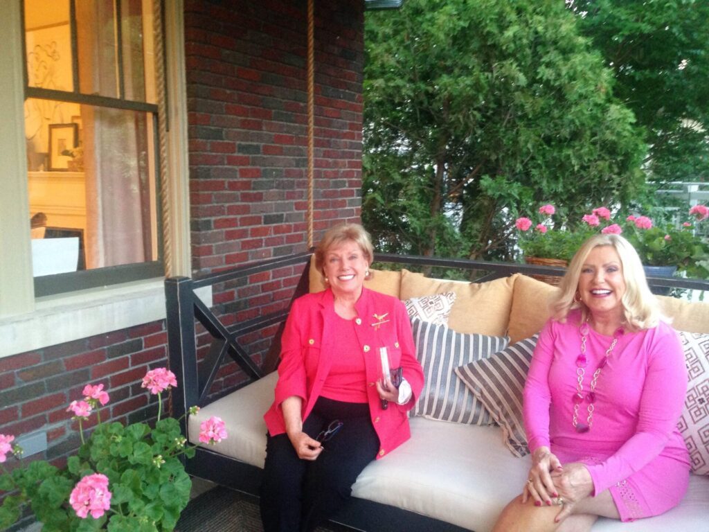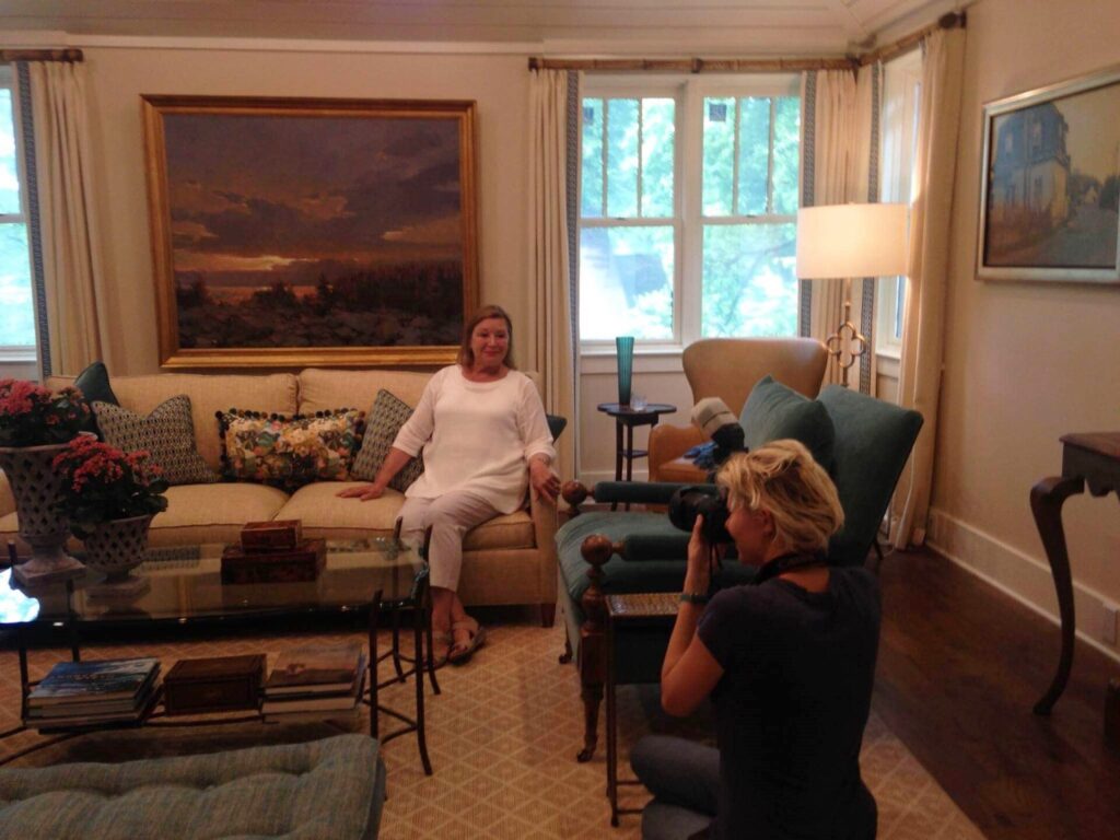 Dana Goodman and Crysta Allsbrooks Parish welcomed guests to the inviting front living room conducive to conversation. “We strongly felt that the re-purposing of this room was inherently important,” says Goodman. “In this crazy-busy world, we need a room that’s a totally tech-free zone for family, friends and self.” Design incorporates rose quartz, pale pink satin pillows, antique books, fine art, and a cream colored kidney sofa. Note the pale pink palette is extended to the ceiling offering a calm and warm glow to the room. The beveled glass French front door, picture window, and vest pocket windows flanking the fireplace mantel make this room a cinema of light. Grounding the room are two beautiful reproduction upholstered barrel or club chairs of walnut. Like a dollop, pink satin pillows soften each of the traditionally masculine club chairs.