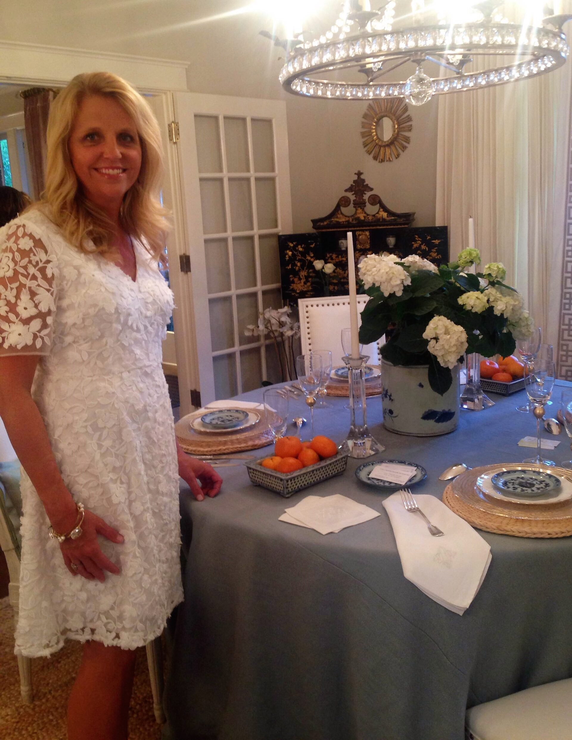 The master suite features “moody” walls, notes Nashville designer Mark Simmons who worked with Deb Tallent on the bed and bath. The deep teal is one of many variations on blue found throughout the home. The dining room, created by Lila Pryor Frank Interiors out of Huntsville, draws inspiration from blue and white Chinese porcelain found on the mantel and table setting. JoAnne Haynes, event chair, also took on the design of the family room, and incorporated the family’s memories and mementos from their summers in Maine. The paintings included span three generations of Maine artists and there are as many versions of blue as there are colors of the changing sea. It’s beautiful. Come see for yourself.