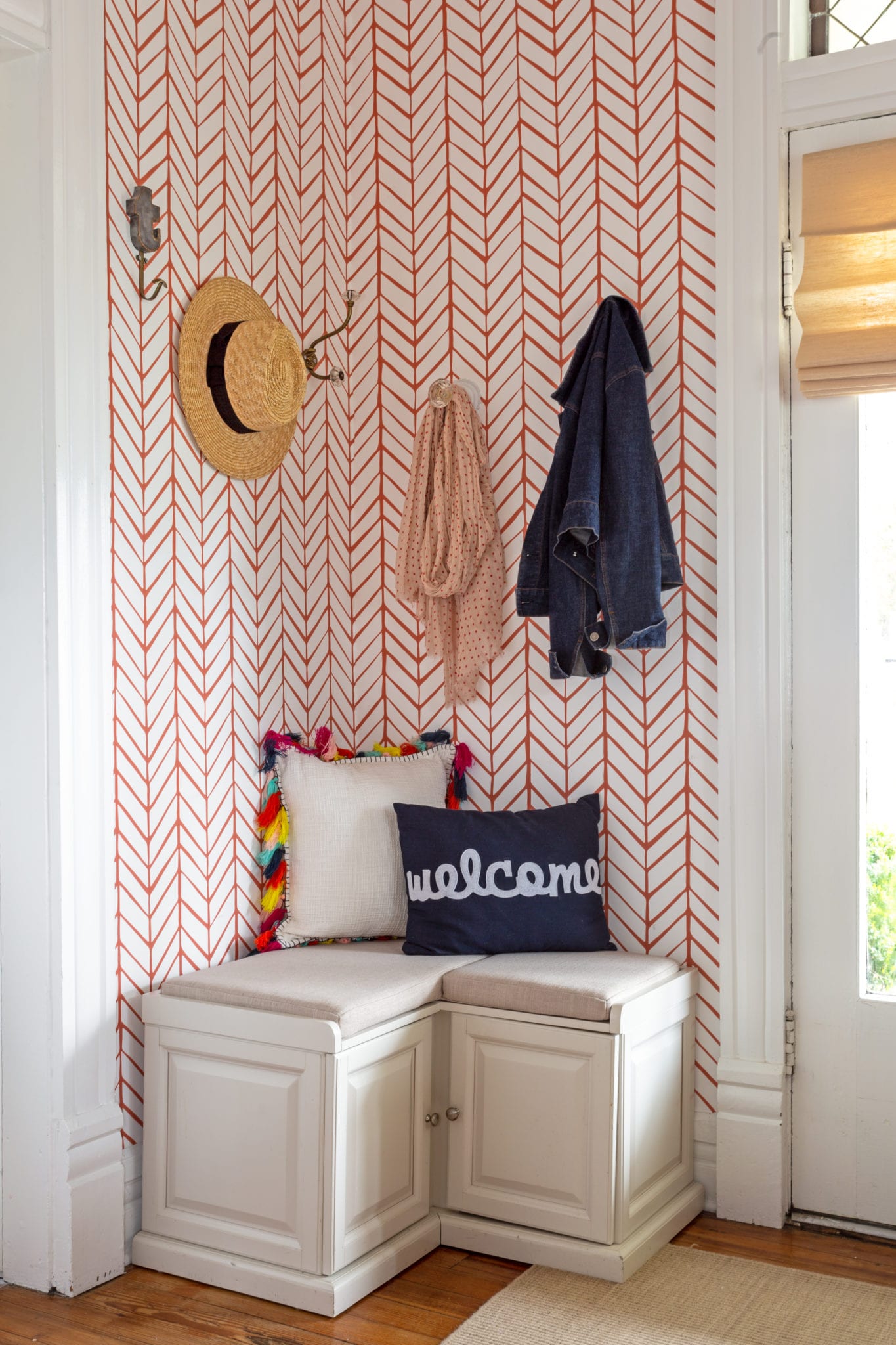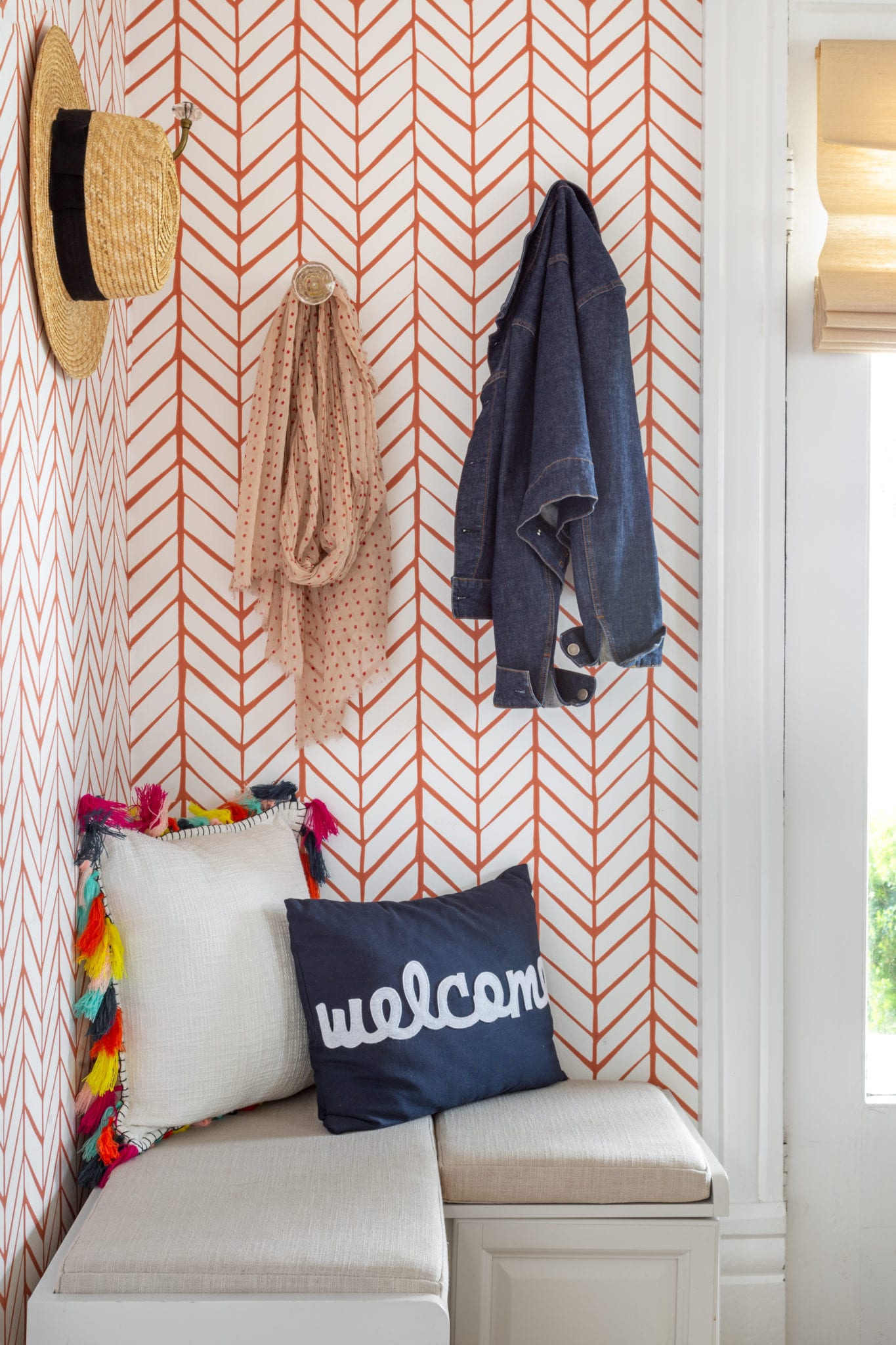 It also helped that the homeowners were not opposed to wild pops of color, patterns or prints, like the orange-patterned wallpaper in the entryway—actually one of the first design choices they made.
