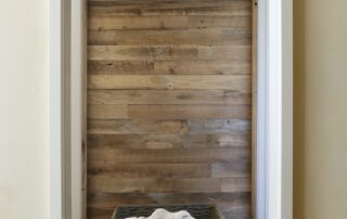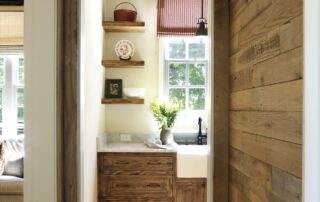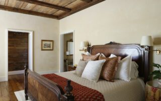 The reclaimed barn wood was used on the floors, in the box beams on the ceiling and in the hallway wall—each piece meticulously stained to match. The white oak cabinetry featured throughout the suite was hand-burned and distressed to lend an aged look, and handcrafted Italian tiles were used in the bathroom.