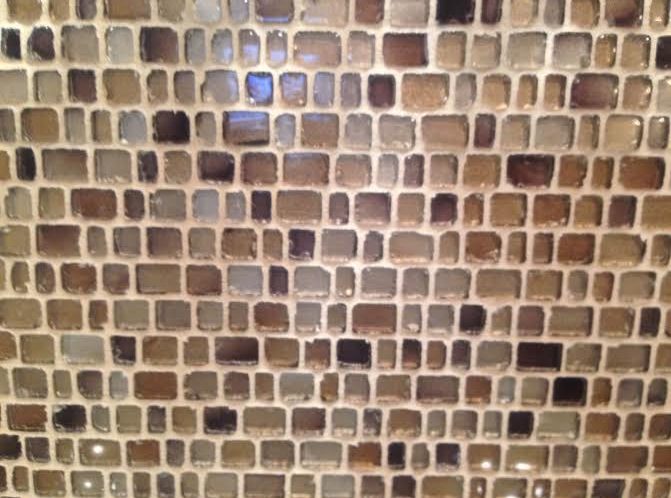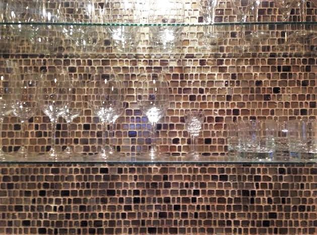 shimmering glass tile and shelving of wet bar Terrace Level Living Room by Designer Kathlene Evers, K. Evers Interiors of Nashville