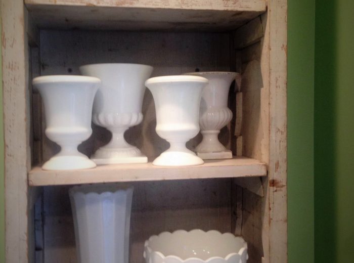 Milk glass collection Potting Shed featuring vintage finds by Kim Leggett of City Farmhouse in Franklin