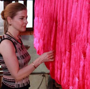 Silk threads bundled for drying illuminate the dark teakwood studio. Lisa Thom, pictured, is a Tennessee interior design professional who now calls Thailand home.
