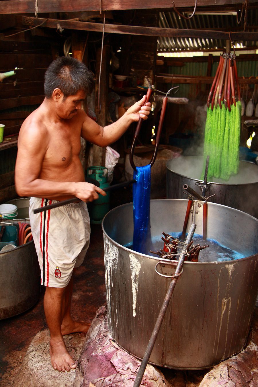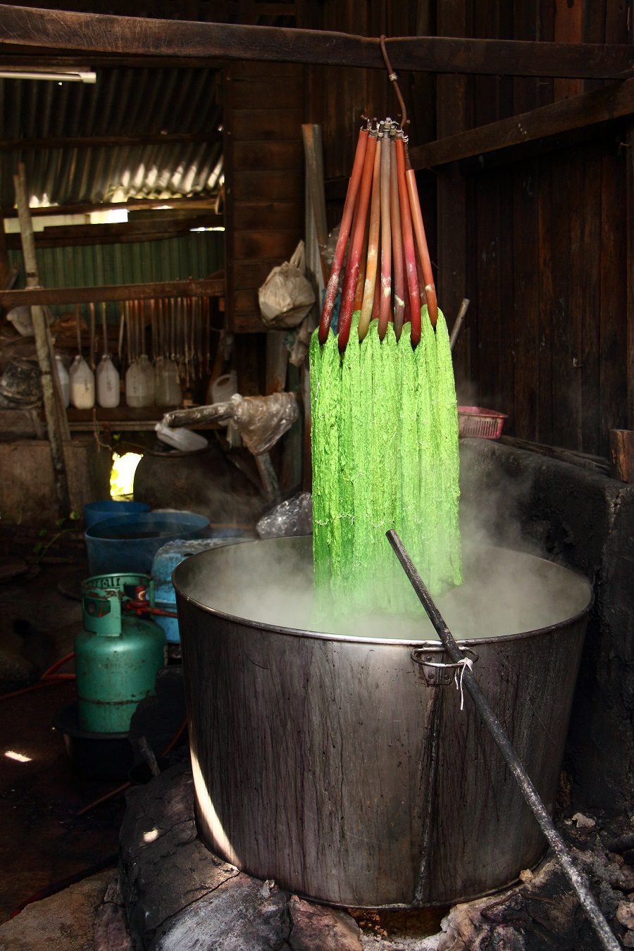 Silk dye vat in the teak cottage offers one of Thailand’s traditional rich textile colors.
