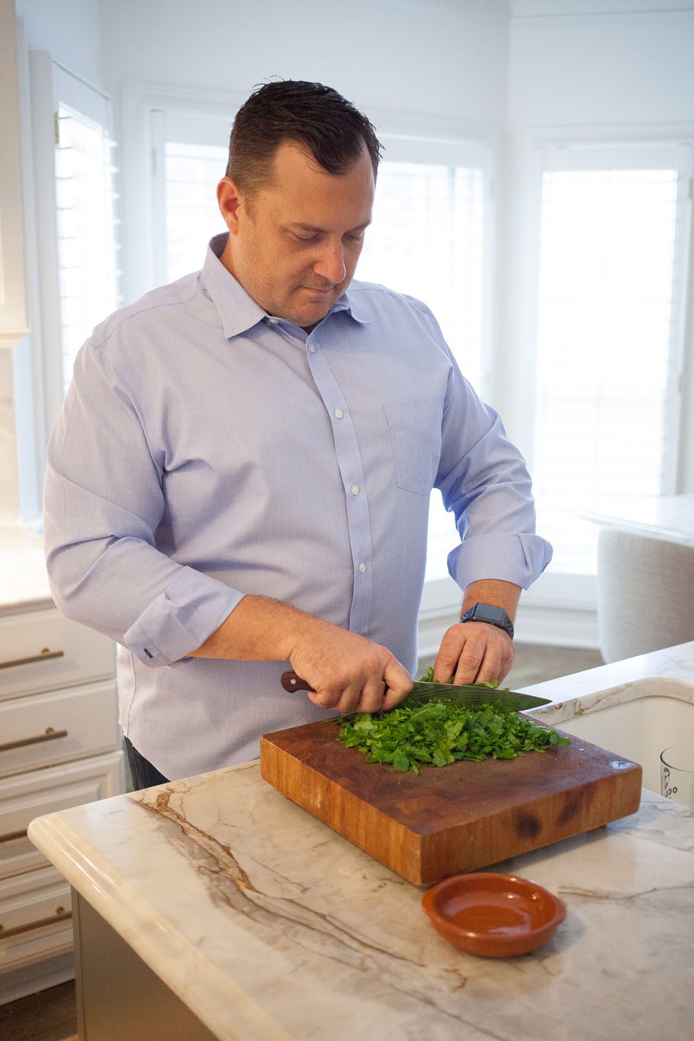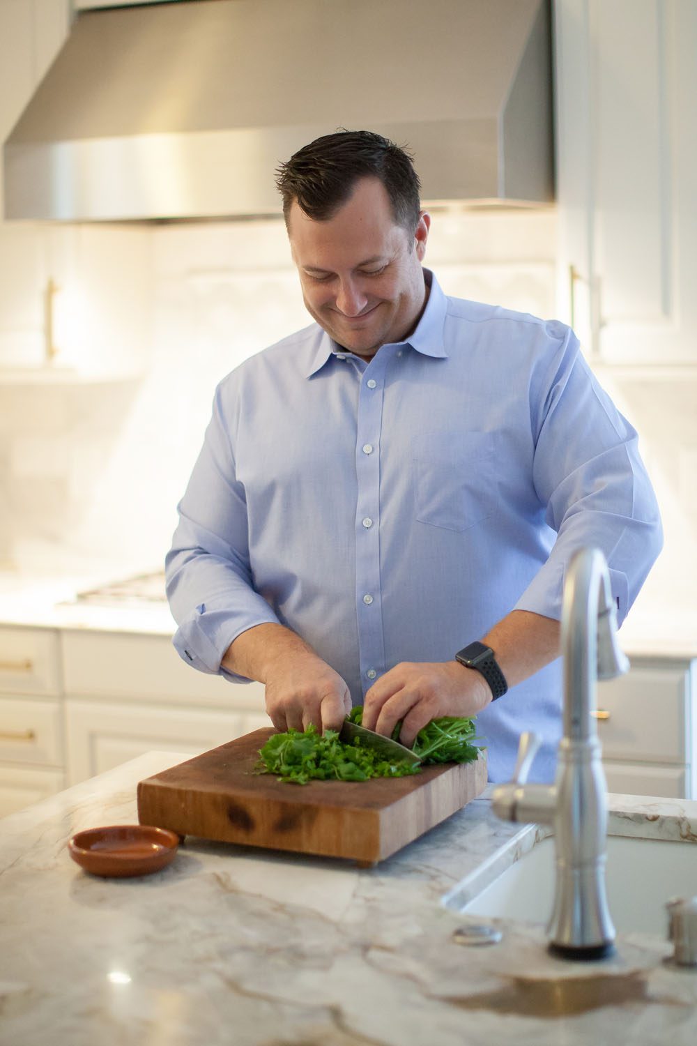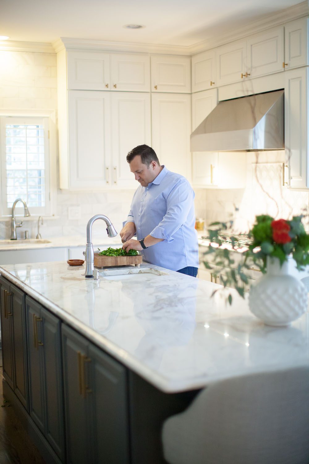 “We love this house. We have a great bonus room upstairs that the kids love, and after a rough week, I crank the air down to 72 degrees, turn on the television and melt into my chair. I just want to nest and chill,” he says, laughing.