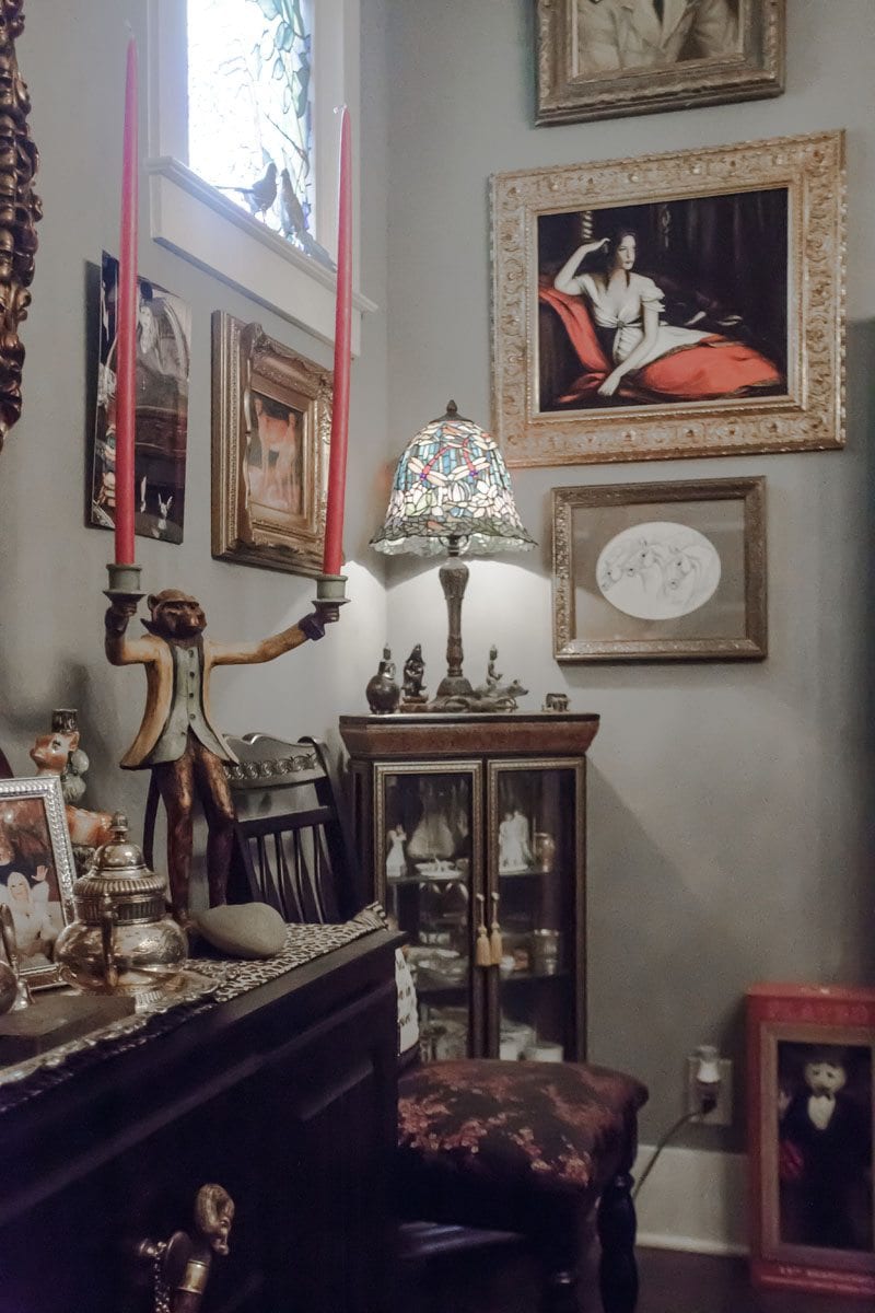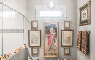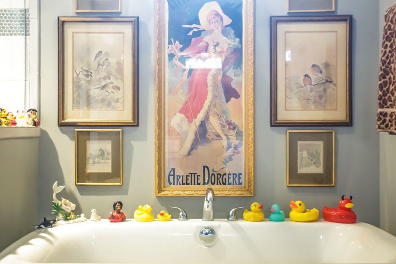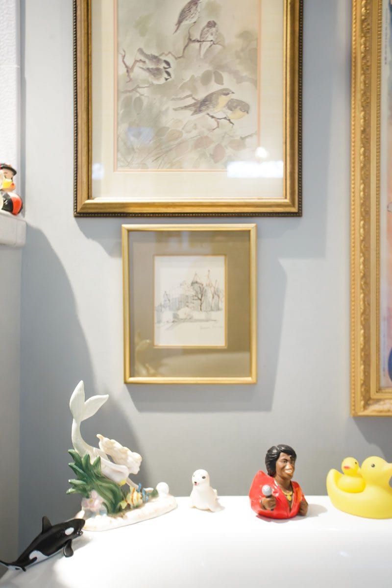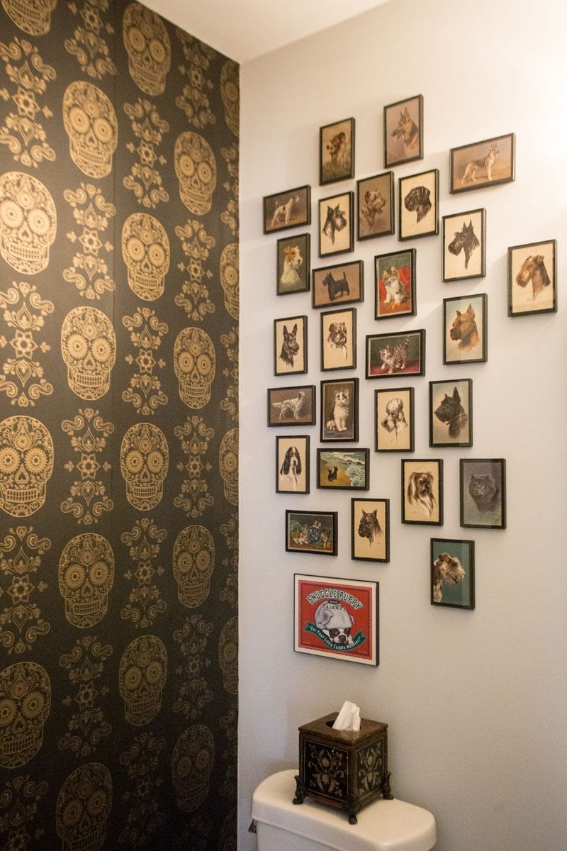 “The first time I went there in the ’70s, I went into the bathroom and just every square inch was filled with pictures. And so I swore one day I was going to duplicate that bathroom, and I finally got a half bath where I could do that,” she says.