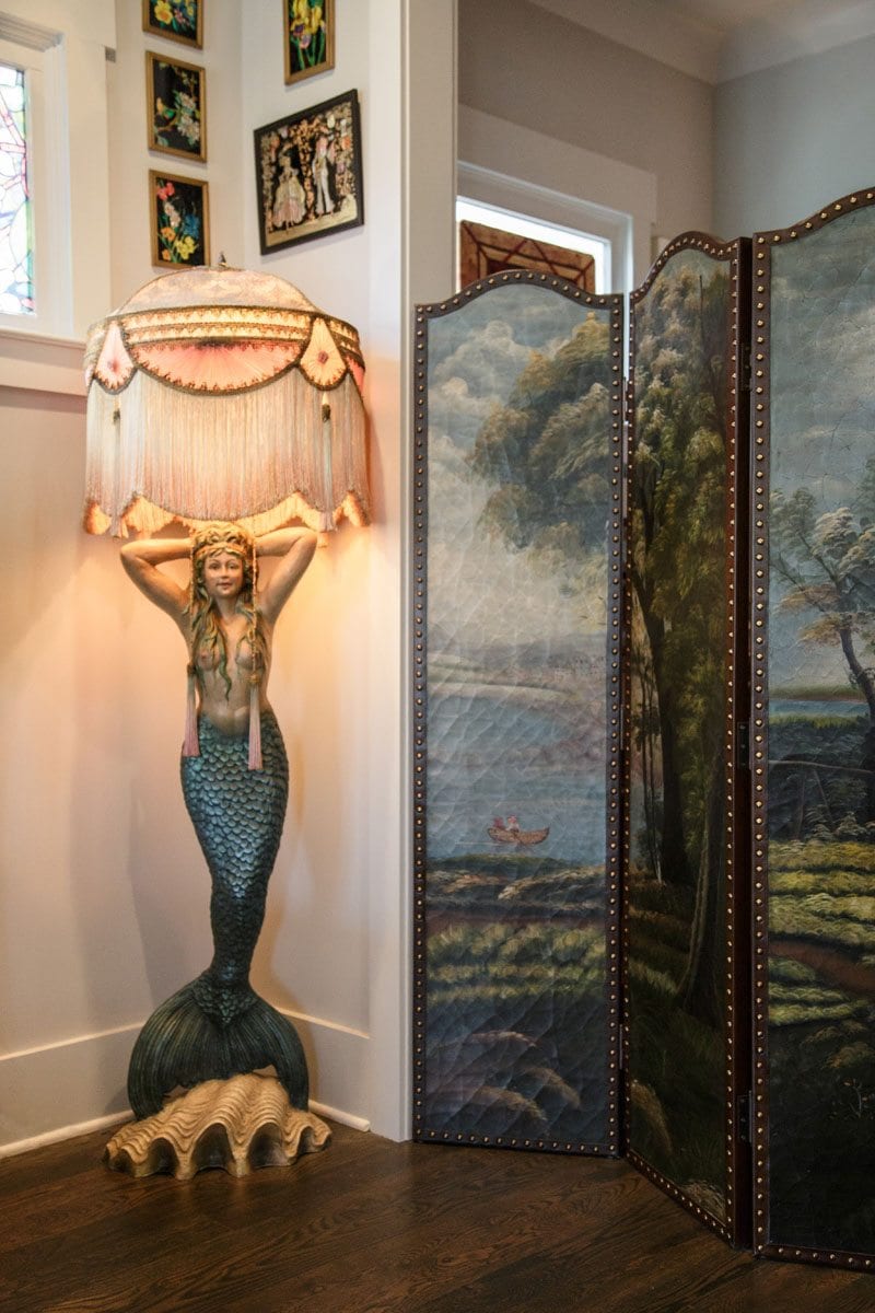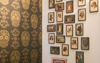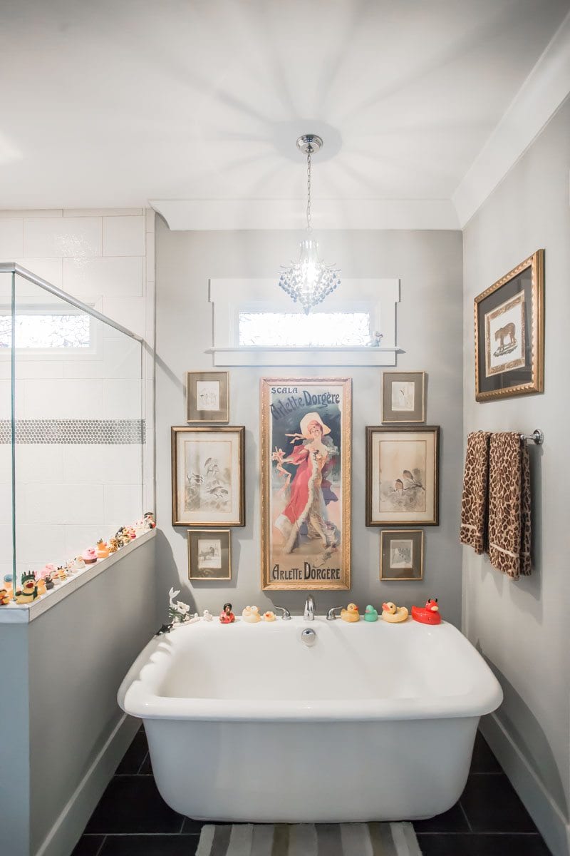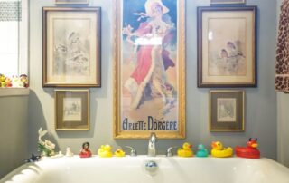 The bathrooms are everything at Buell’s home. Upstairs is the “Dog & Skull,” with luxe black wallpaper embossed with gold skulls. The paper is offset by framed 1920s dog postcards that Wasserstein’s mom collected as a child. In the master bath, Buell’s standalone bathtub is lined with rubber duckies.