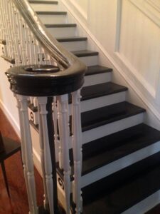 1. Dark lacquer contrast on newel post and stairs grounds the busy foyer. Upstairs, the striking contrast continues as the original architecture frames the expansive landing and stunning coffered ceiling.