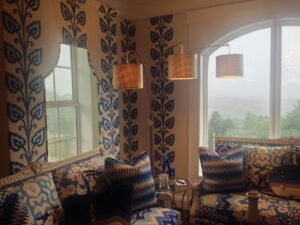 3. The Mediterranean-style arch windows repeat not only along the grand porch, but are an architectural signature for this house, framing stunning views from the ridge elevation. The blue bedroom evokes that same Mediterranean feel and blue palate. The room is both cozy and rich. The sitting room overlooks the city and can easily be converted to a guest room with the clever use of a cabinet bed. The room’s designer, Marsha Yessick, added a sapphire leather lounge chair by the fireplace. Thibaut Fabrics and Wallcoverings are featured.